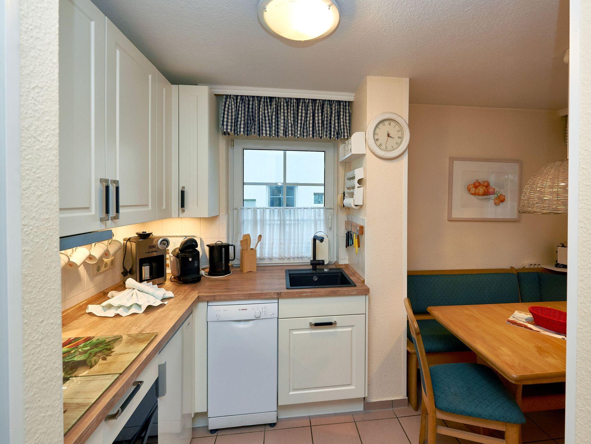 Zur technischen Ausstattung im Wohnzimmer zählen ein großer Flachbild-TV, ein CD/DVD-Player und eine Hifi-Anlage. Auch eine kleine literarische Auswahl sowie ein paar Spiele sind vorhanden. Die offene Küche bietet alles, was man braucht, um sich selbst zu „bekochen“. Das zählen ein Induktionsherd mit Dunstabzugshaube, ein Kühlschrank mit Gefrierfach, ein Geschirrspüler, eine Mikrowelle mit Backofen sowie eine Kaffeemaschine, ein Wasserkocher und ein Toaster. Selbstverständlich fehlt es auch nicht am nötigen Koch- und Essgeschirr.