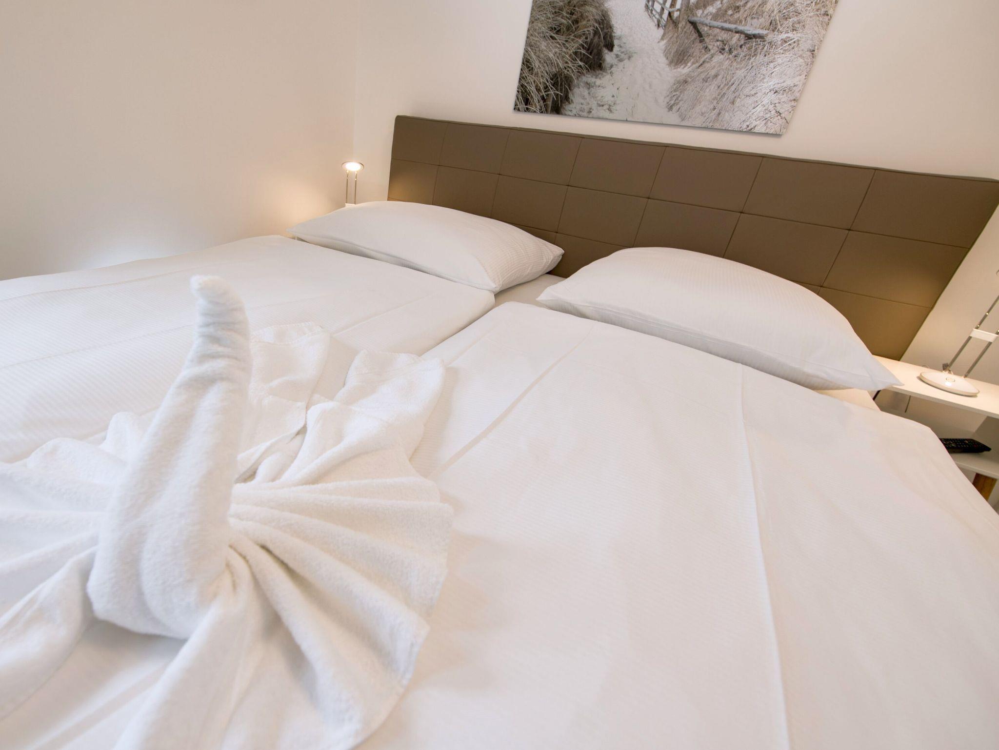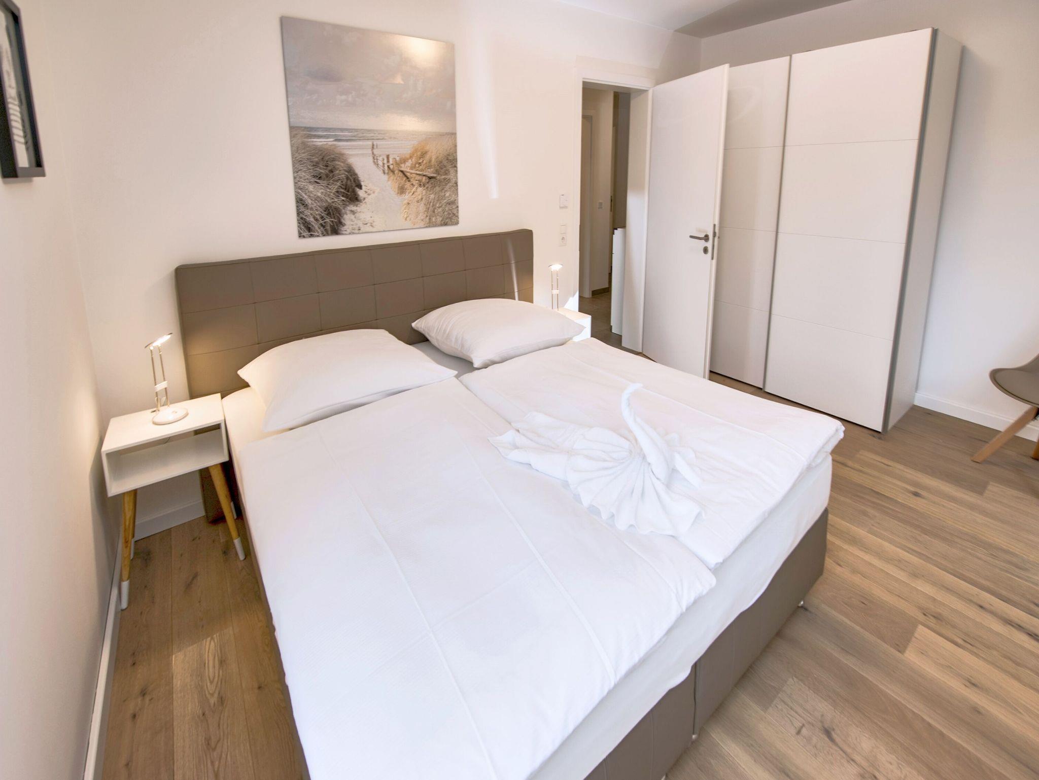 Beide Schlafzimmer sind mit 1,80m x 2,00m großen Boxspringbetten ausgestattet. Im kleinen Schlafzimmer können die Boxspringbetten entweder als Einzelbetten gestellt werden oder als Doppelbett ohne lästige Besucherritze. Und natürlich hat jedes Schlafzimmer auch einen Fernseher.