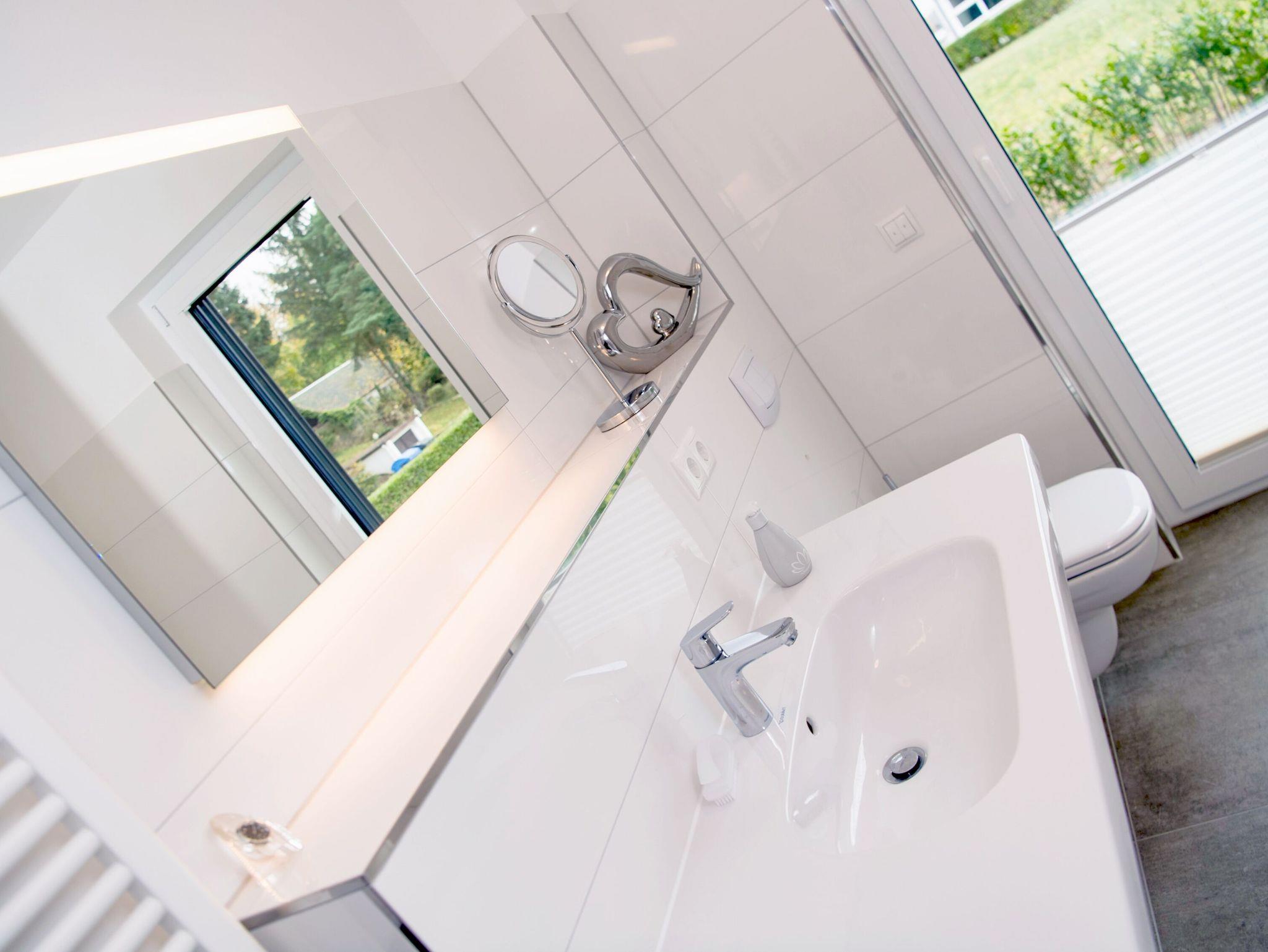 Im modernen Duschbad gibt es neben einer großzügigen, ebenerdigen Dusche auch eine Badewanne. Außerdem ist ein separates WC mit Waschtisch vorhanden.