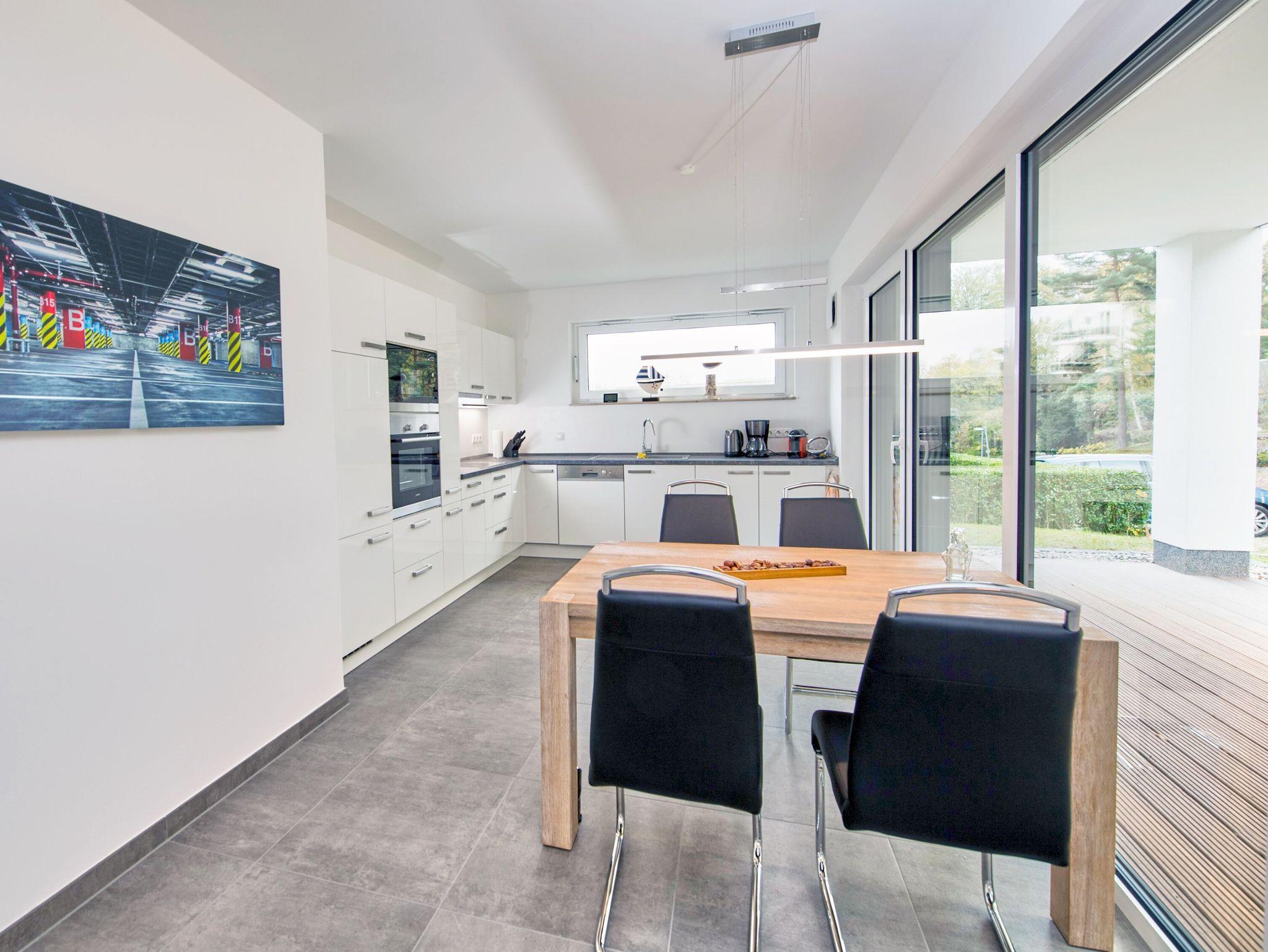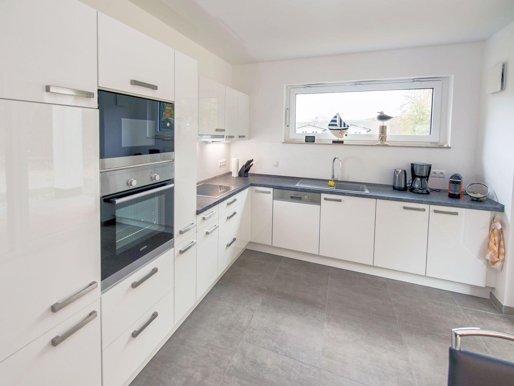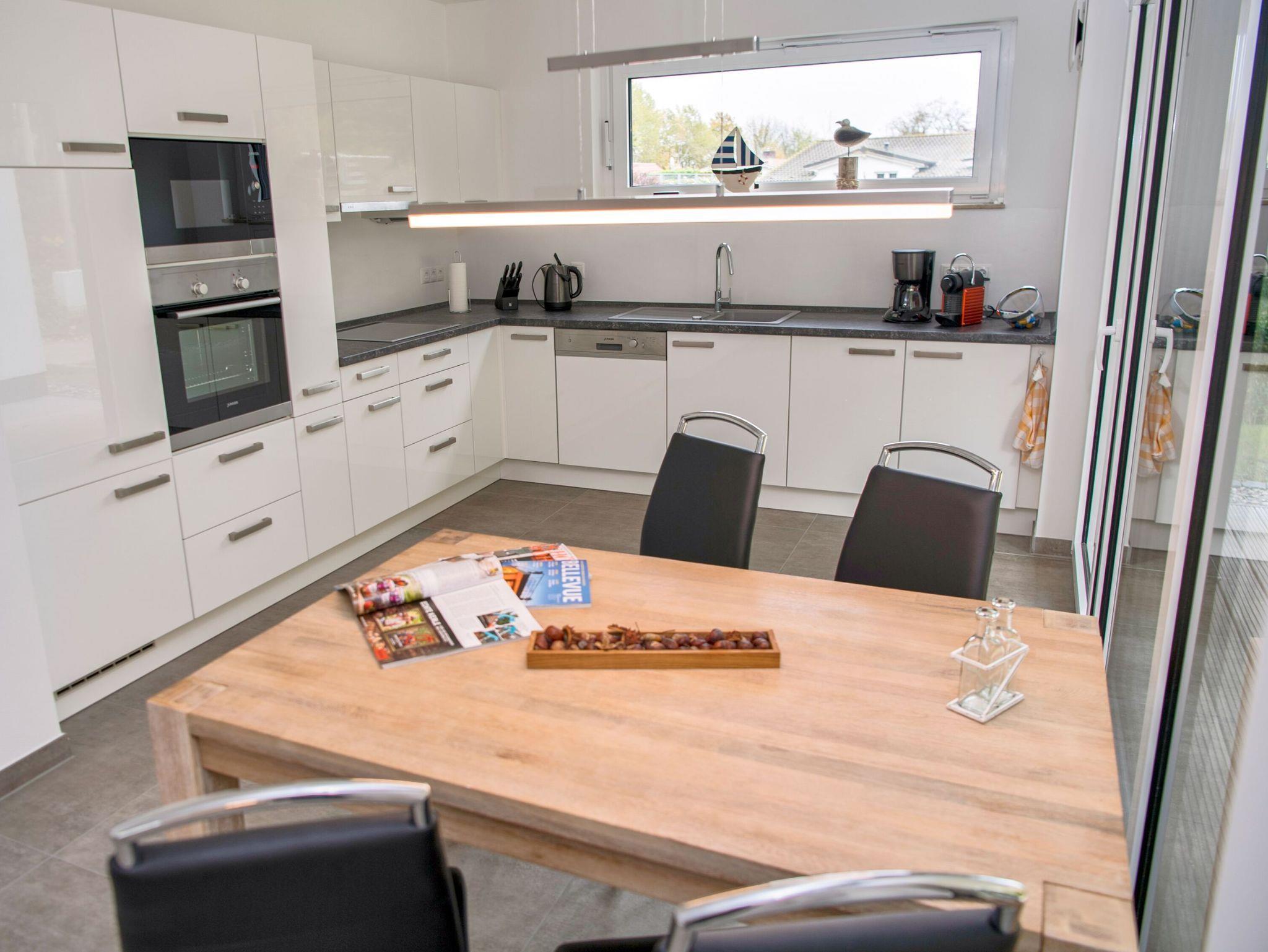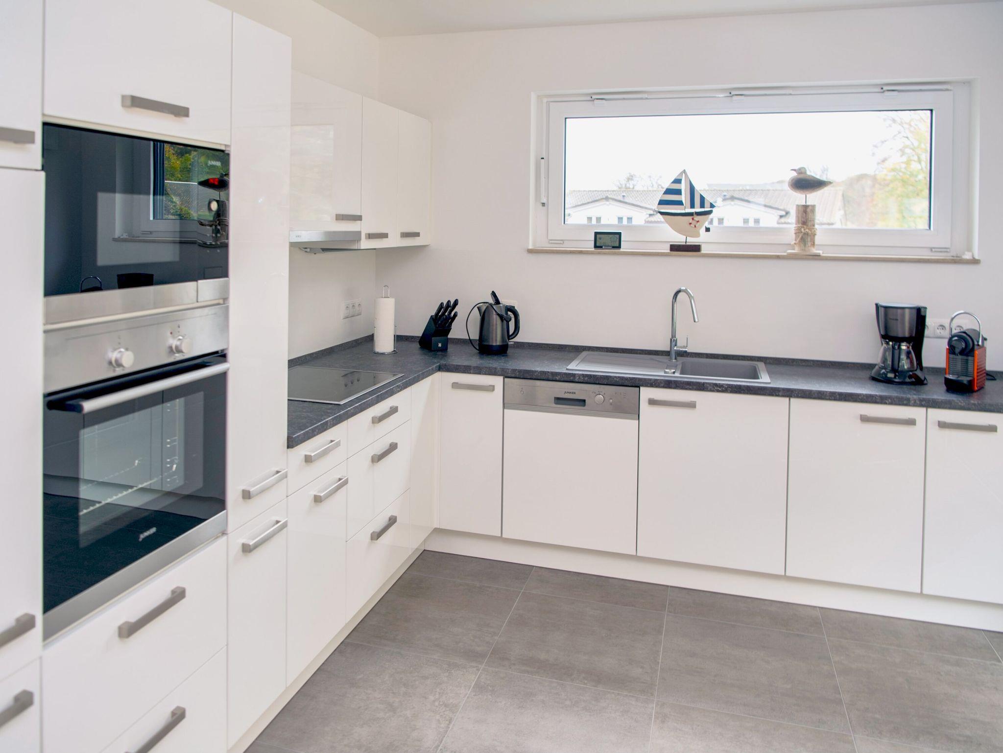 Die harmonisch integrierte Küchenzeile verfügt über ein Ceran-Kochfeld, Kühlschrank mit Gefrierfach, Backofen, Mikrowelle, Geschirrspülmaschine, Nespresso Maschine, Kaffeemaschine, Wasserkocher und vieles mehr.