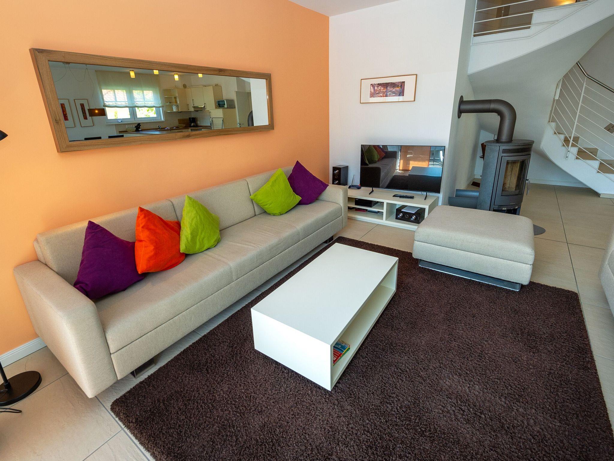 Der Wohnbereich ist unter anderem mit einem Smart-TV und einer Stereoanlage mit CD-/DVD-Player sowie mit einem Kamin ausgestattet. Ein Internetanschluss per LAN und W-LAN steht kostenlos zur Verfügung.