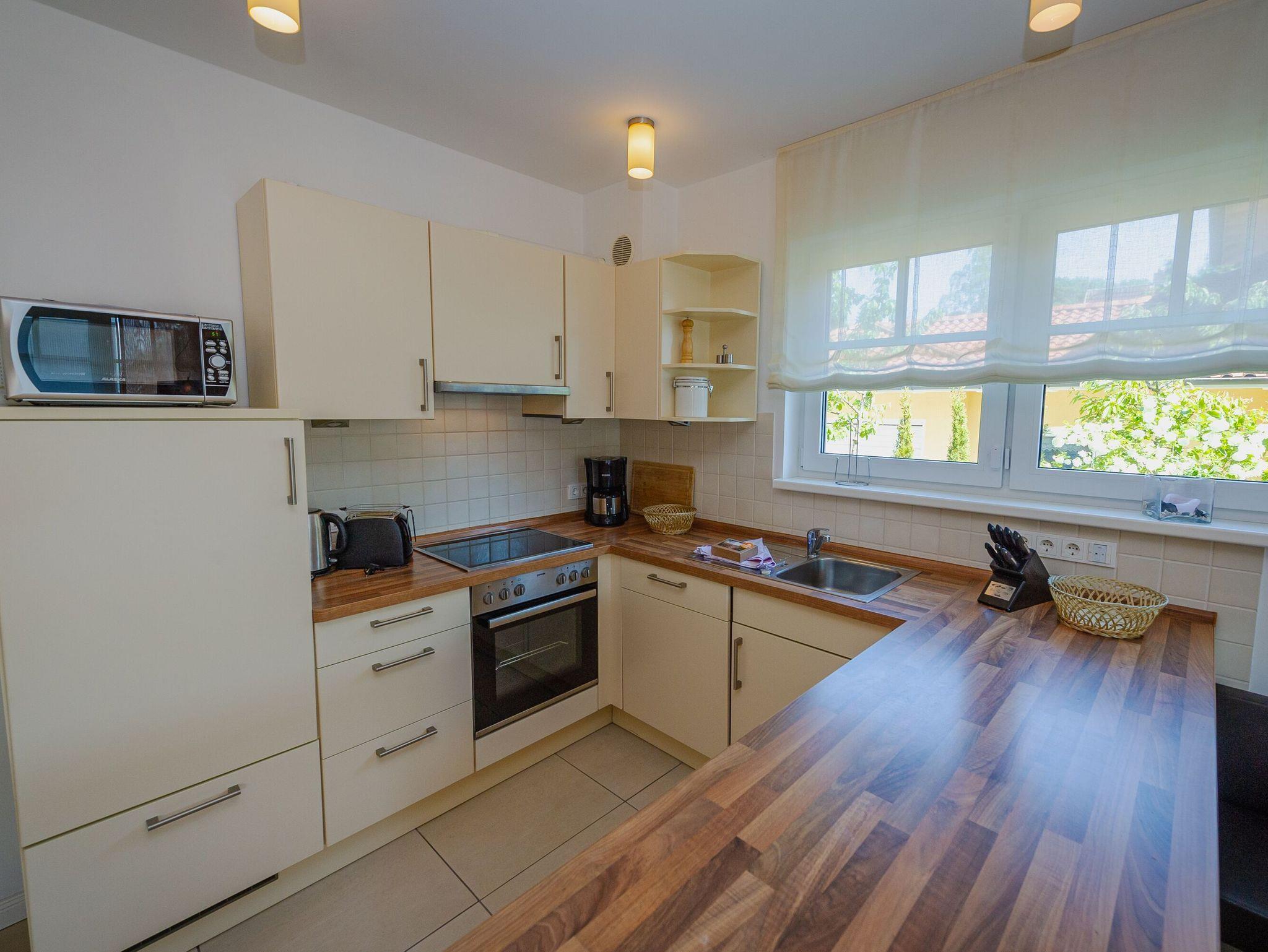 Die ebenfalls sehr gut ausgestattete, im Wohnbereich harmonisch integrierte Küchenzeile mit Spülmaschine, Backofen, 4-Platten-Ceranfeld, Mikrowelle, Kühlschrank mit Gefrierfach (***), Kaffeemaschine, Toaster, Wasserkocher und weiteren Utensilien lässt keine Wünsche offen.