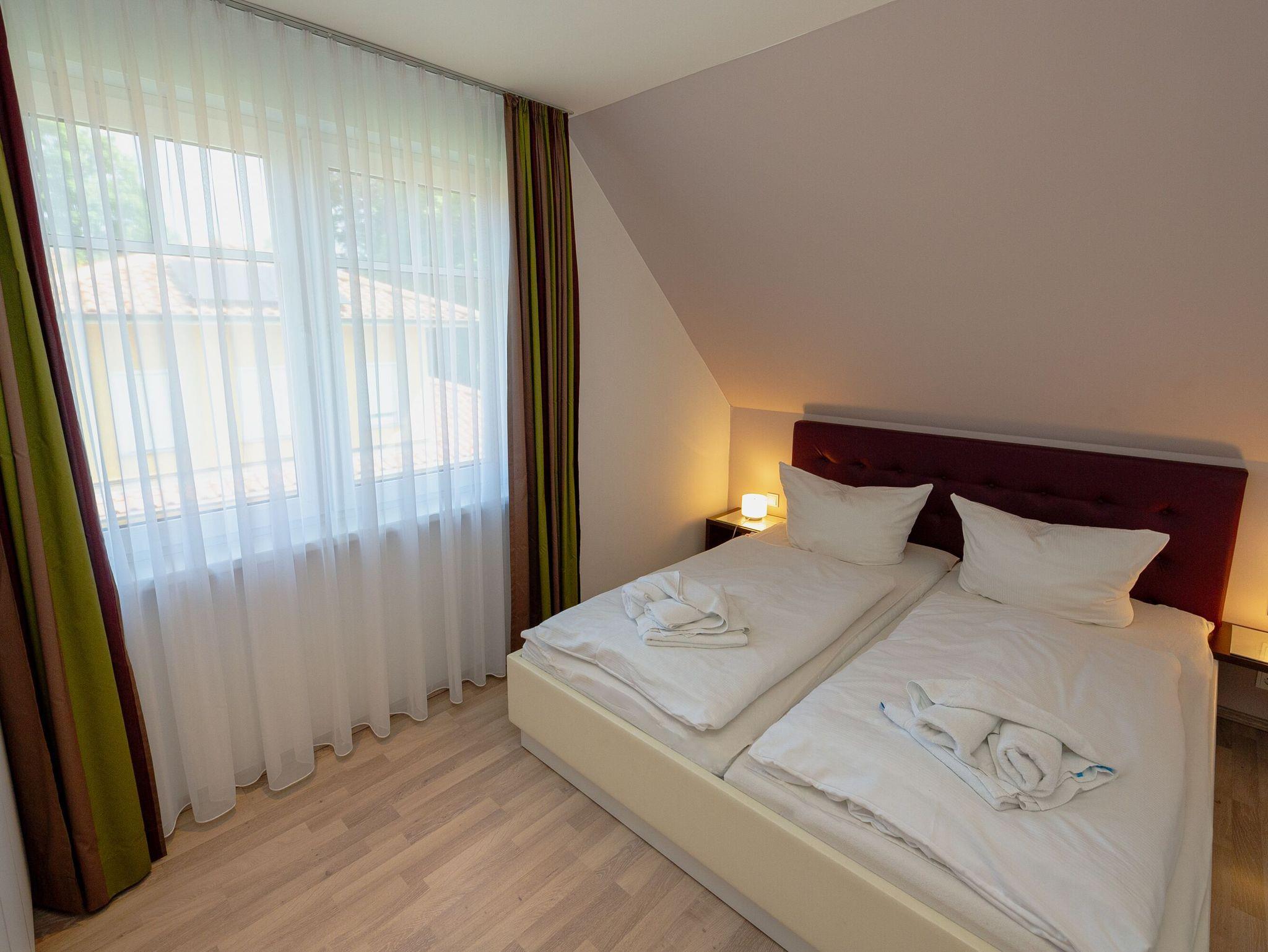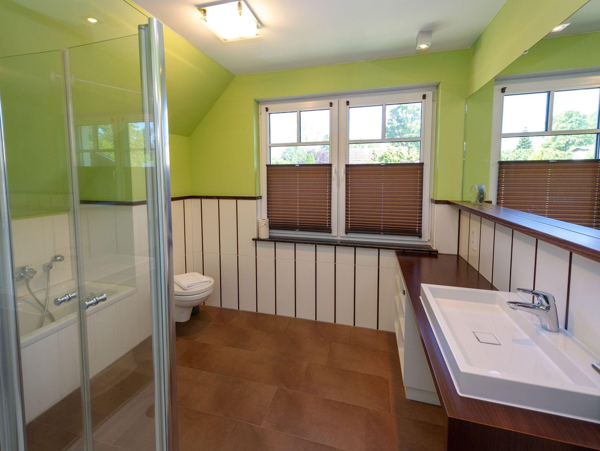 Im Obergeschoss befinden sich zwei Schlafzimmer mit jeweils einem Doppelbett, ein weiteres Schlafzimmer im Erker mit 2 Einzelbetten sowie das zweite Badezimmer, ausgestattet mit Dusche/WC, Badewanne, Waschtisch und beheizbarem Handtuchtrockner. Leichte Dachschrägen vermitteln Gemütlichkeit.