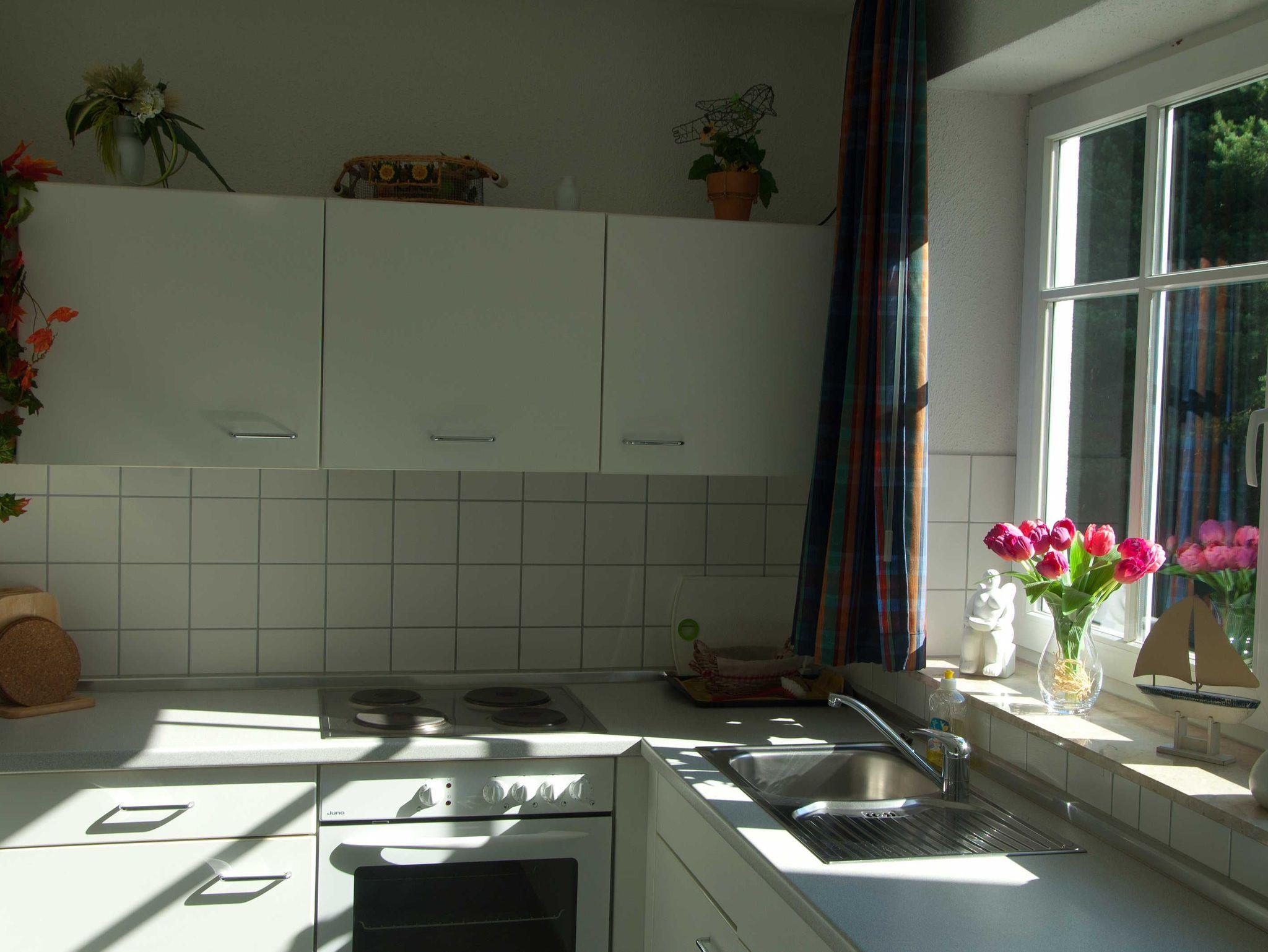 Die moderne separate Küche ist mit einem, Backofen, Wasserkocher, Kaffeemaschine, Toaster und Kühlschrank mit Gefrierfach ausgestattet.