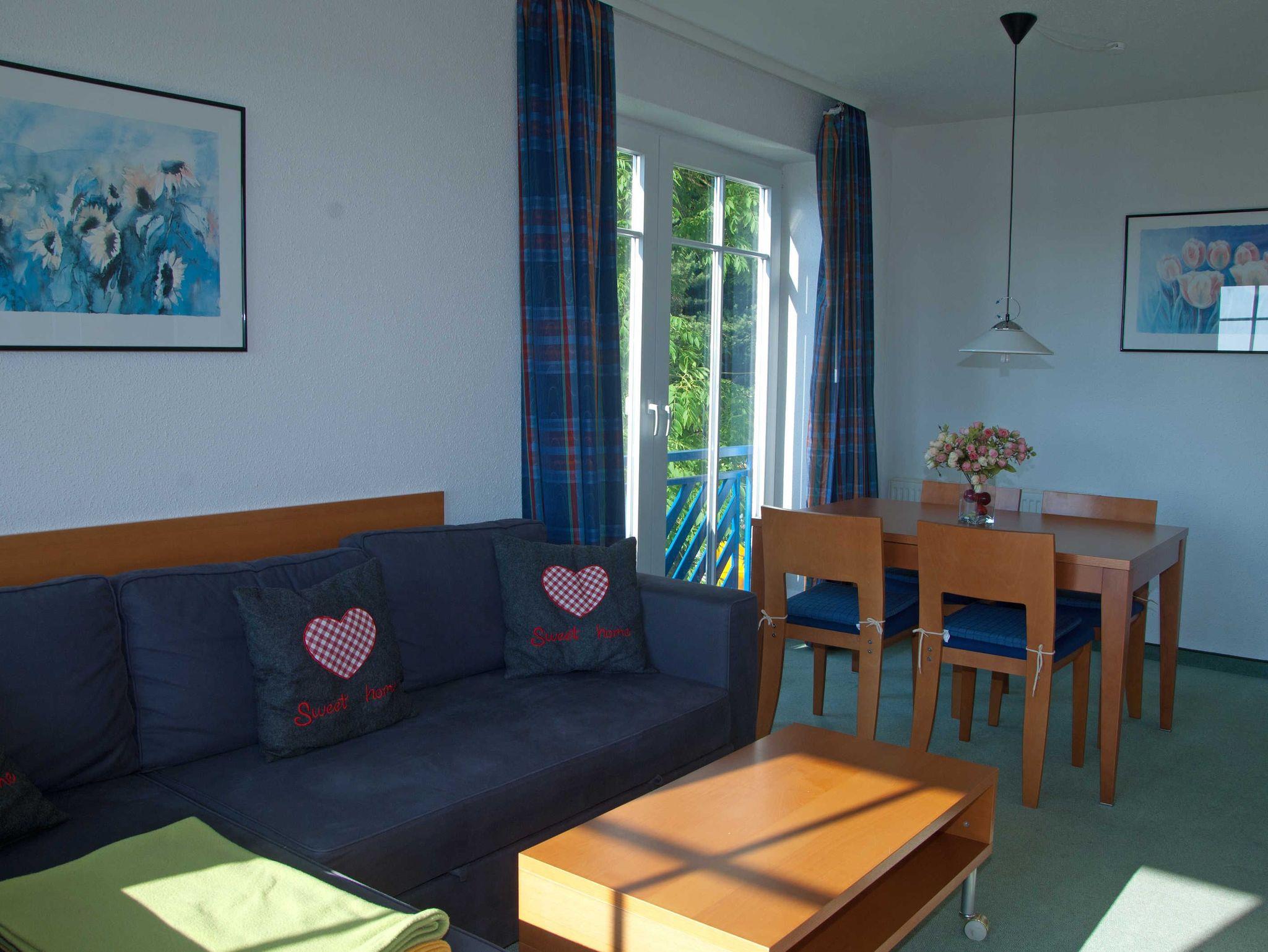 Im Wohnbereich befinden sich eine bequeme Sitzcouch, ausklappbar und als Bett für 2 Pers. nitzbar. Tisch und ein modernes TV-Gerät mit Kabelanschluss und kostenloses Wlan