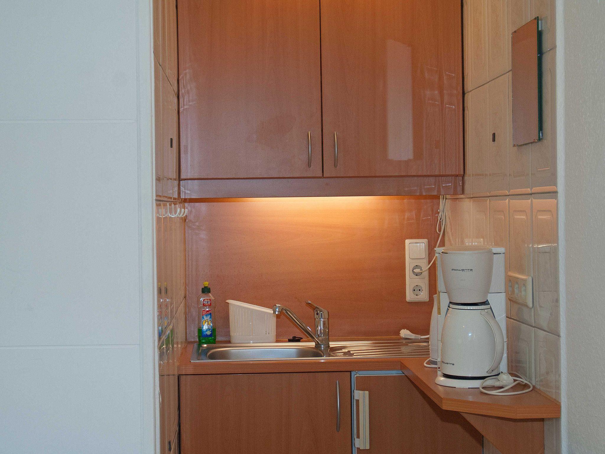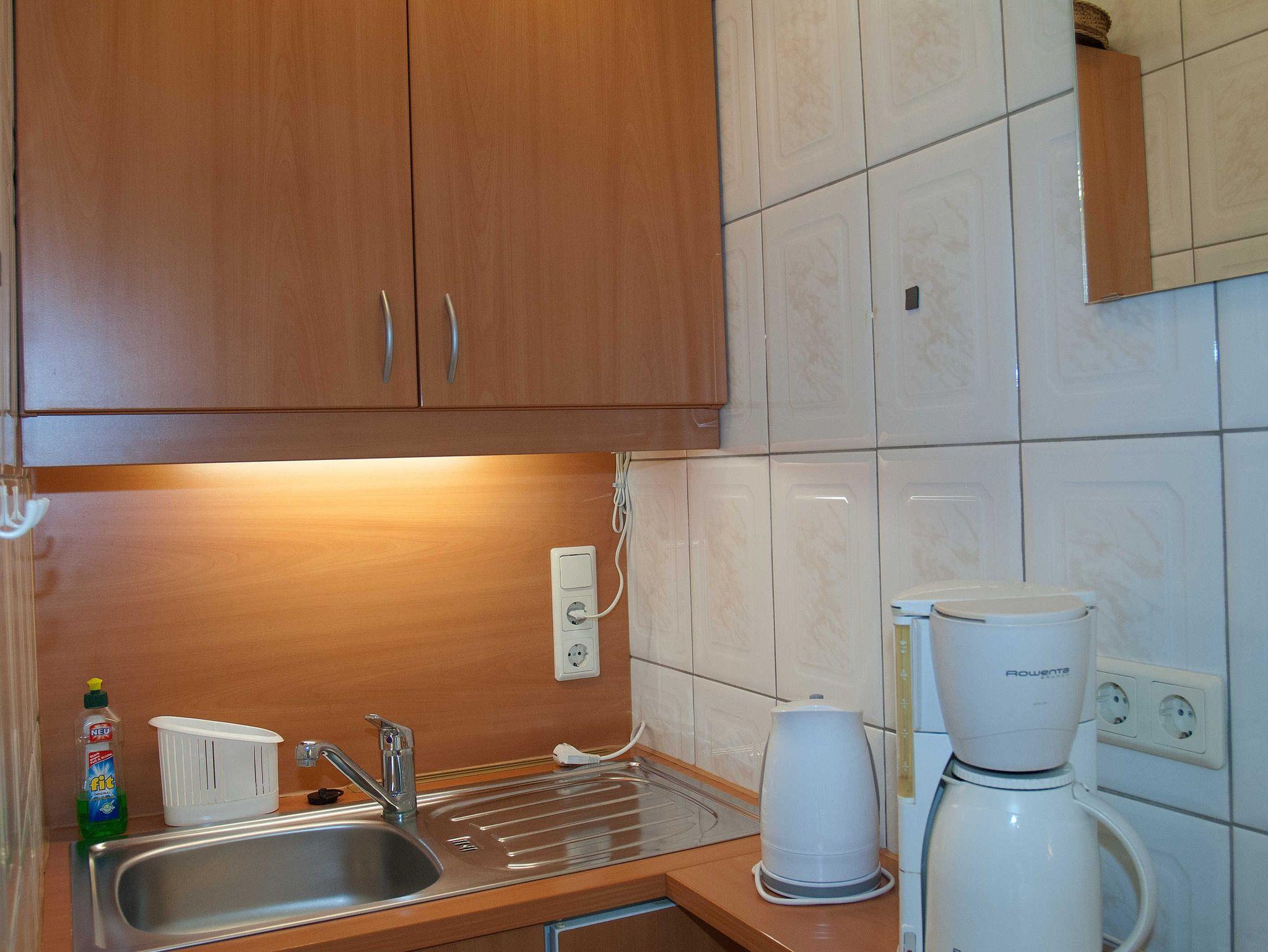 Das kleine Schlafzimmer „Seestern“ (ca.18 qm) befindet sich im Parterre im Wohnhaus und verfügt über ein Badezimmer mit Dusche/WC, einer kleinen Miniküche ohne Kochfeld und Sitzecke. Die Miniküche ist mit Kühlschrank (ohne Gefrierfach) ausgestattet. Kochutensilien, Kaffeemaschine, Eierkochen, Wasserkocher und Toaster sind ebenso, wie ausreichend Geschirr und Besteck vorhanden.