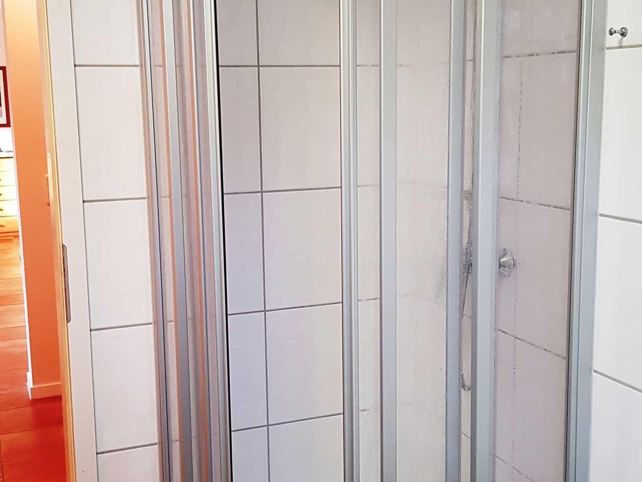 Das Schlafzimmer verfügt über ein Doppelbett (1,60m x 2,00m), ein Einzelbett (0,80m x 2,00m), Nachttischkonsolen und Kleiderschrank. Ein zweiter Kleiderschrank befindet sich im Flur. Das Tageslichtbad verfügt über Badewanne, Dusche, WC.