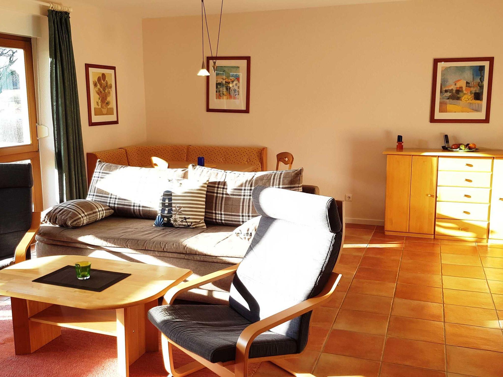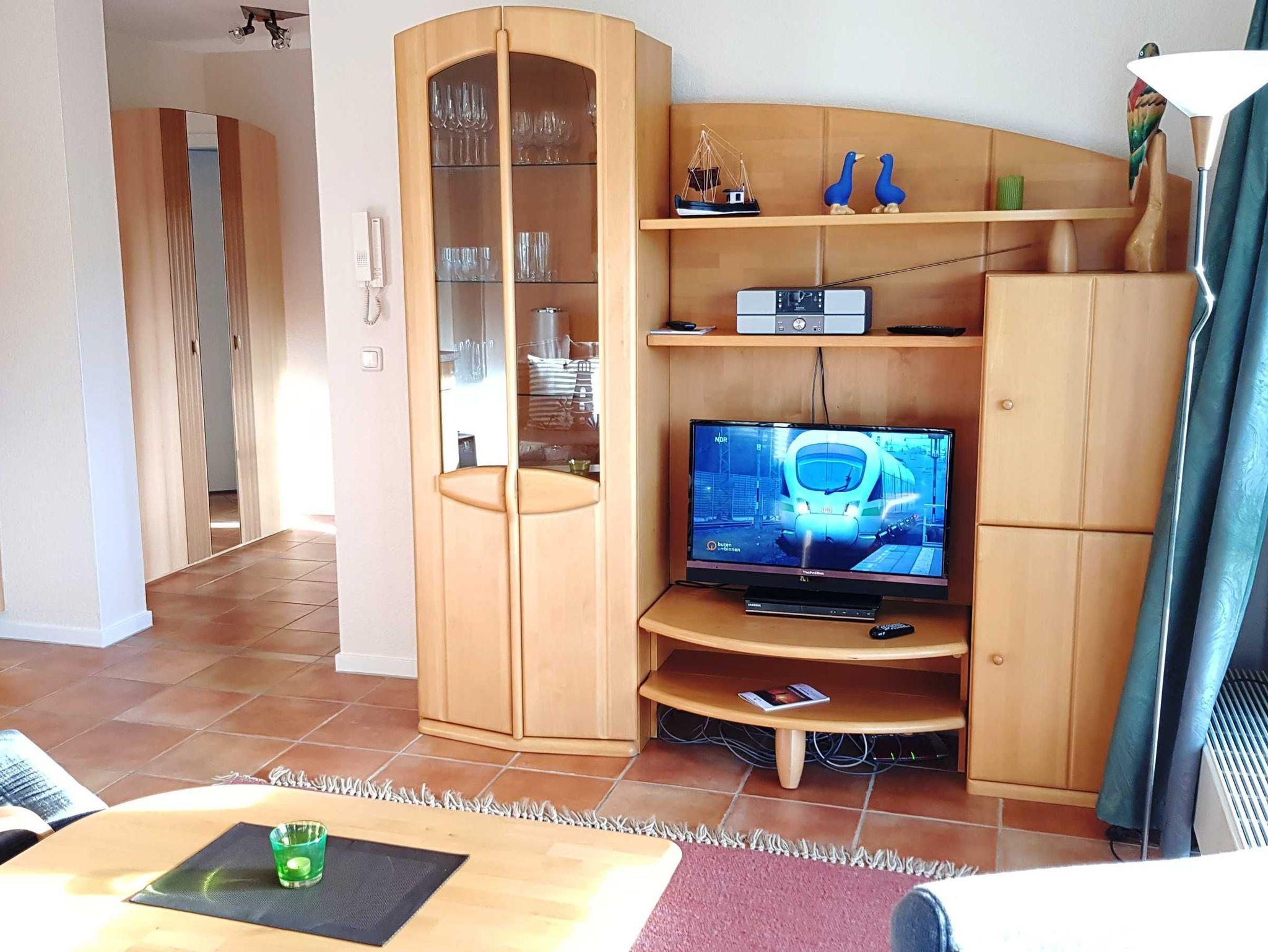 Im Wohnbereich befindet sich ein Schlafsofa mit einer Liegefläche von 1,65mx2,00m, ein Couchtisch, TV + DVD, Radio mit CD-Player.