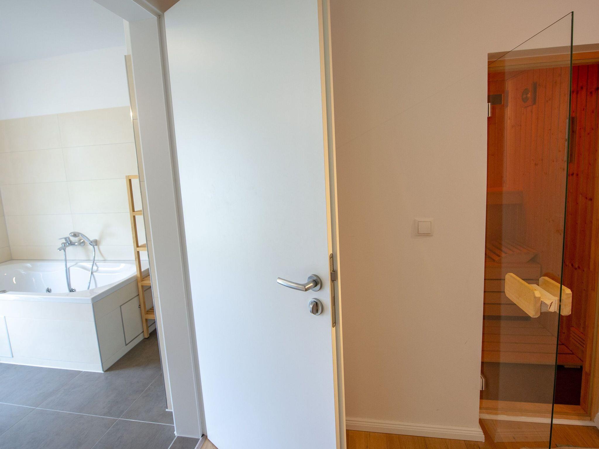 Im modernen Duschbad gibt es neben einer großzügigen, ebenerdigen Dusche eine Whirlwanne sowie eine Sauna mit elektrisch beheizbarem Saunaofen mit Steinen.