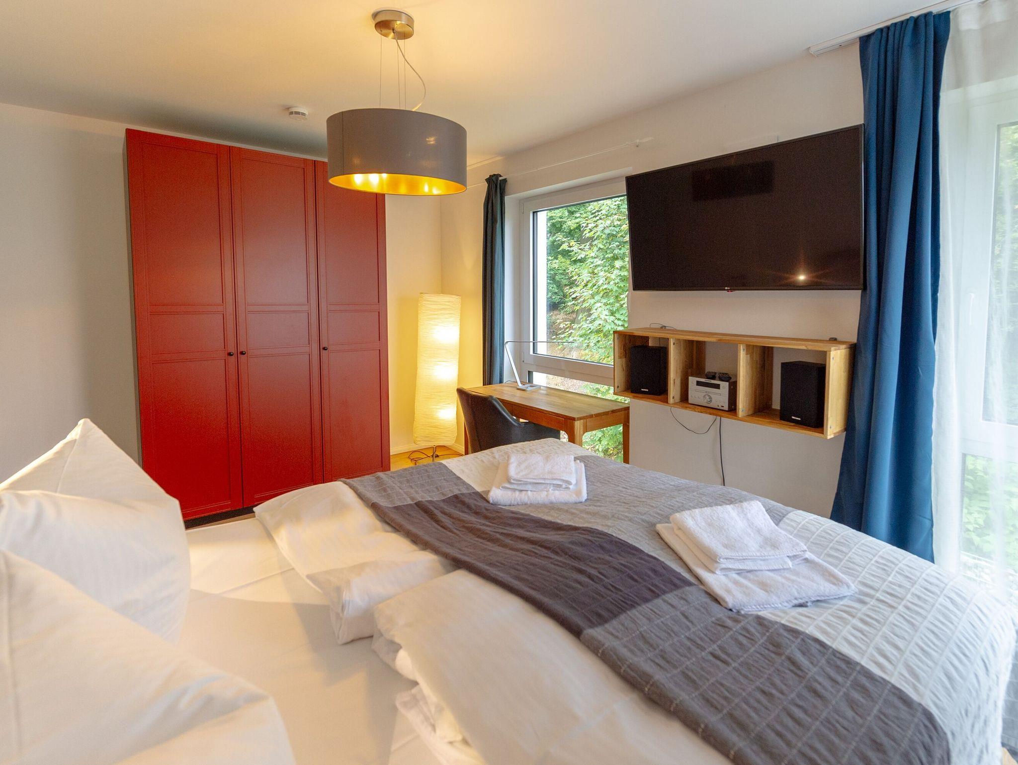 Das eine der beiden Schlafzimmer ist mit einem Boxspringbett 1,60m x 2,00m ausgestattet. Das zweite Schlafzimmer hat ein Doppelbett (1,60m x 2,00m) sowie einen Smart-HD-TV. Beide verfügen über Kompaktsystem-Schränke und einen kleinen Schreibtisch. Der Blick aus den Schlafzimmern fällt direkt in den Buchenwald, wo Sie bei offenen Fenstern das Meer rauschen hören.