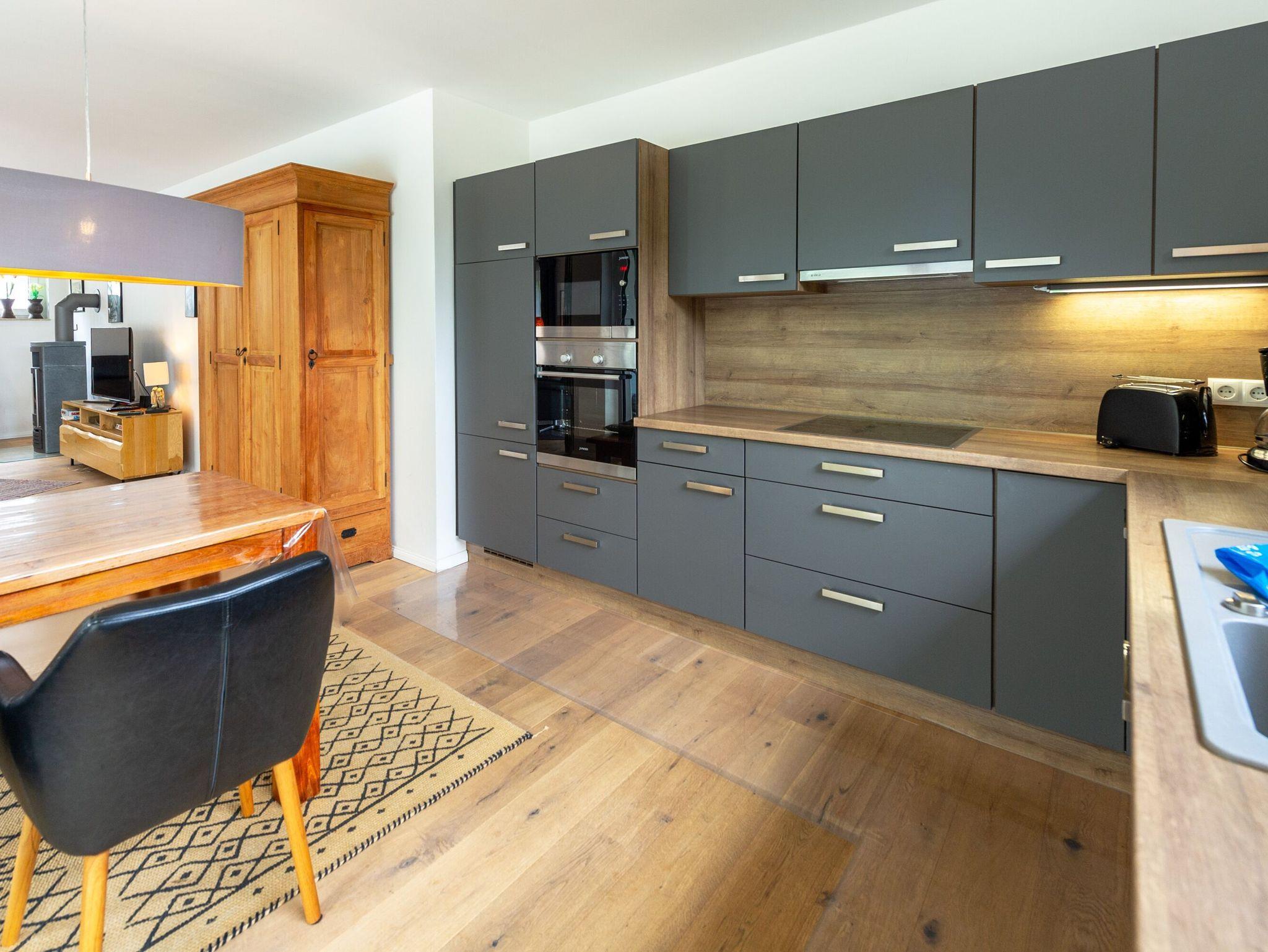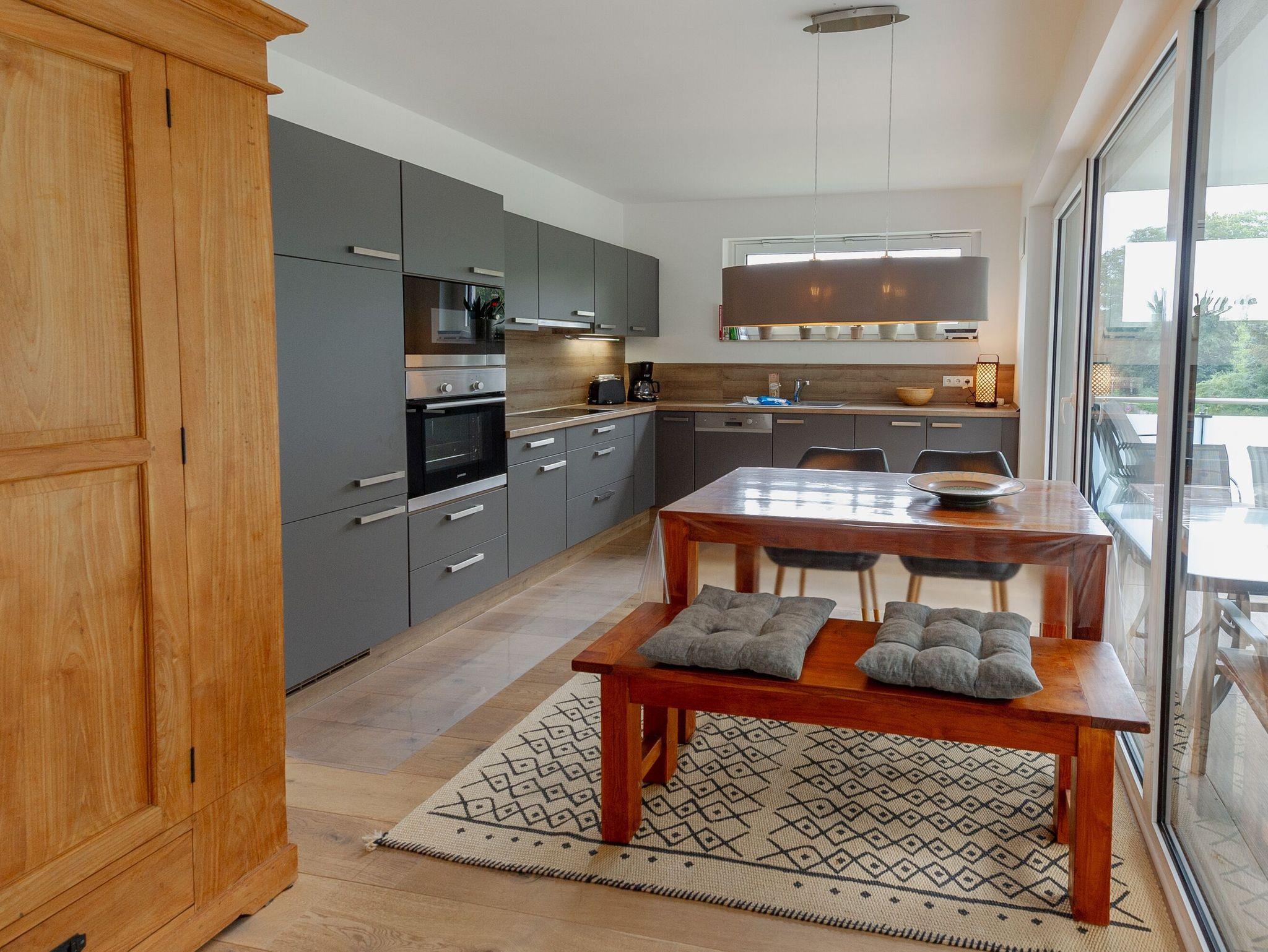 Die harmonisch in diesen Bereich integrierte Küchenzeile verfügt über ein Ceran-Kochfeld, Kühlschrank mit Gefrierfach, Backofen, Mikrowelle, Geschirrspülmaschine und diverses Kleininventar. Vom Küchen- wie auch vom Wohnbereich aus gelangen Sie auf die ca. 13m² große Südwestterrasse, ausgestattet mit Esstisch, Stühlen und 2 Liegen.