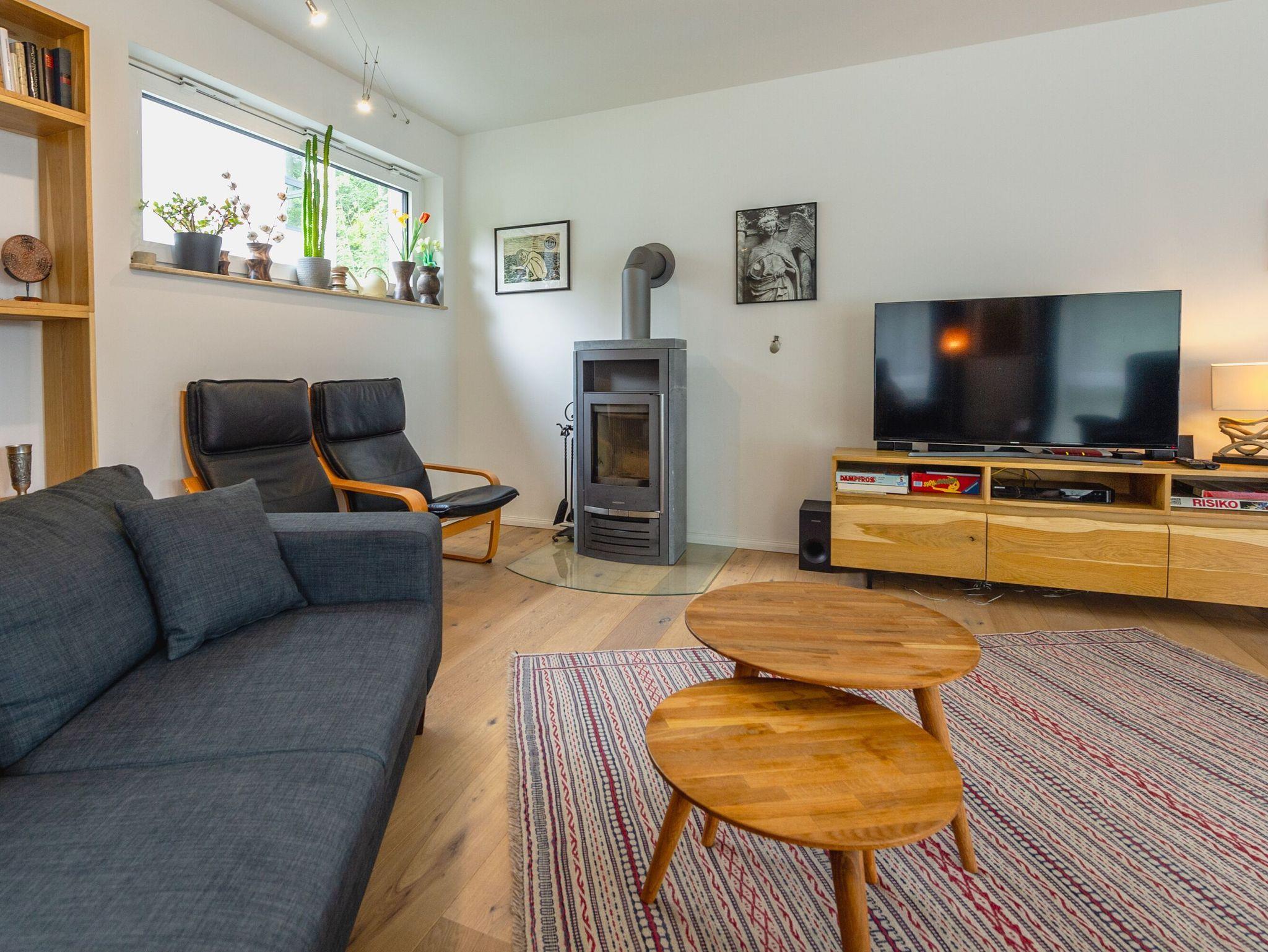 Besonders hervorzuheben ist der großzügige, lichtdurchflutete, ca. 42m² große Wohn-Essbereich. Dieser ist mit einem großen Esstisch aus Teakholz und Lederstühlen, einem 4er-Ecksofa, einem Liegesessel, zwei Ledersesseln, einem mit Holz beheizbaren Kamin, einem Flachbild-TV (50 Zoll) und einer Stereoanlage mit CD-Player und Blu-Ray ausgestattet.
