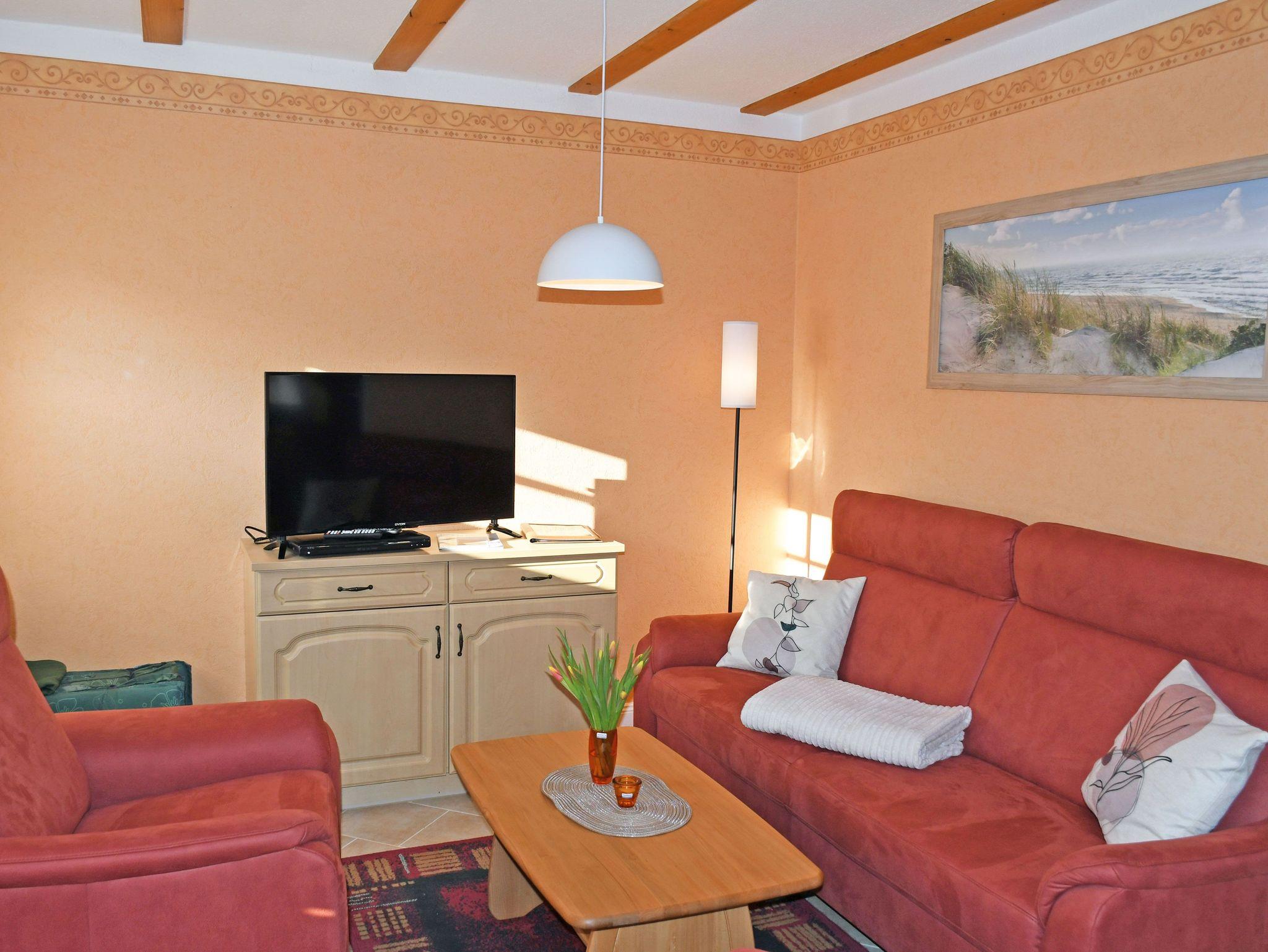 In den mediterran gestalteten und aufeinander abgestimmten Wohn- und Schlafbereichen genießen Sie während Ihres Urlaubs allen Komfort. Der Wohn- und Küchenbereich befindet sich im Erdgeschoss und ist ausgestattet mit Bodenfliesen, Sitzecke, Frühstückstisch und voll ausgestattete Küchenzeile, Kabel Radio/TV mit DVD-Player und Familienspiele.