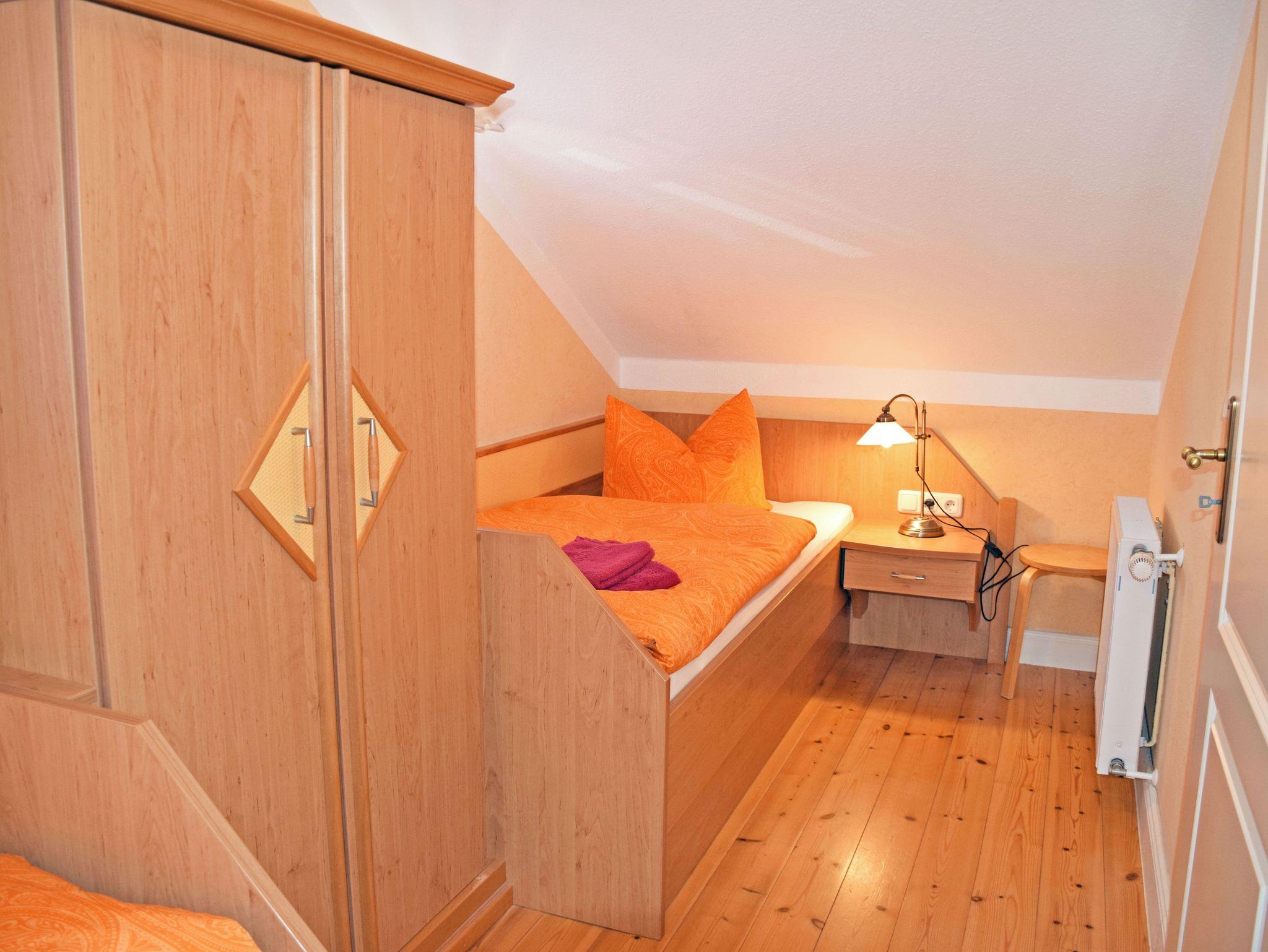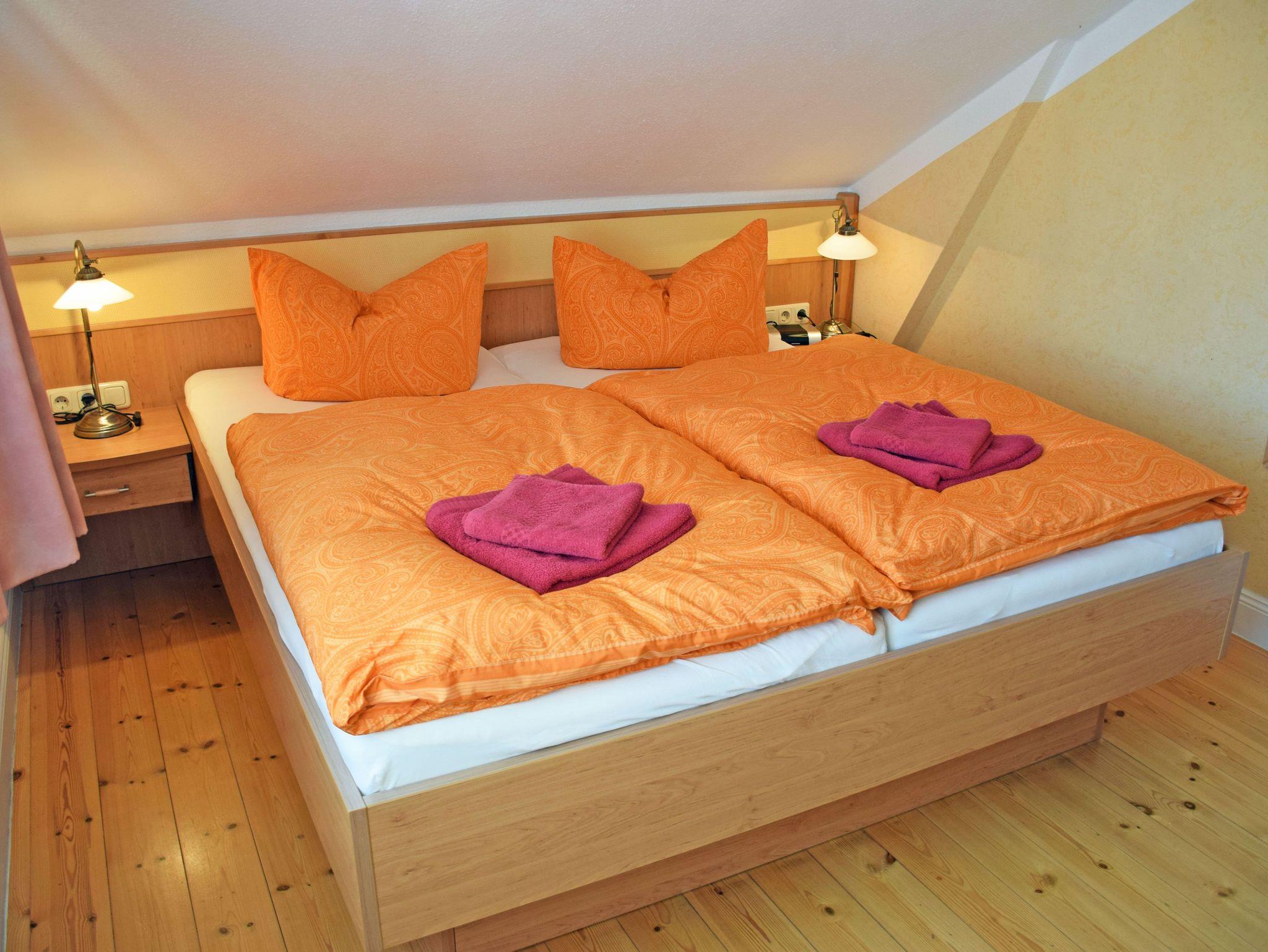 Das Bad verfügt über Dusche, Waschtisch und WC. Über eine kunstvoll gearbeitete Holztreppe gelangen unsere Gäste in das Obergeschoss. Die Eltern schlafen hier in einem Schlafzimmer mit bequemen Doppelbett mit Nachttischen und Leselampen, das Kind in einem extra Kinderschlafzimmer mit einem Einzelbett. In beiden Schlafzimmern stehen große Schränke.