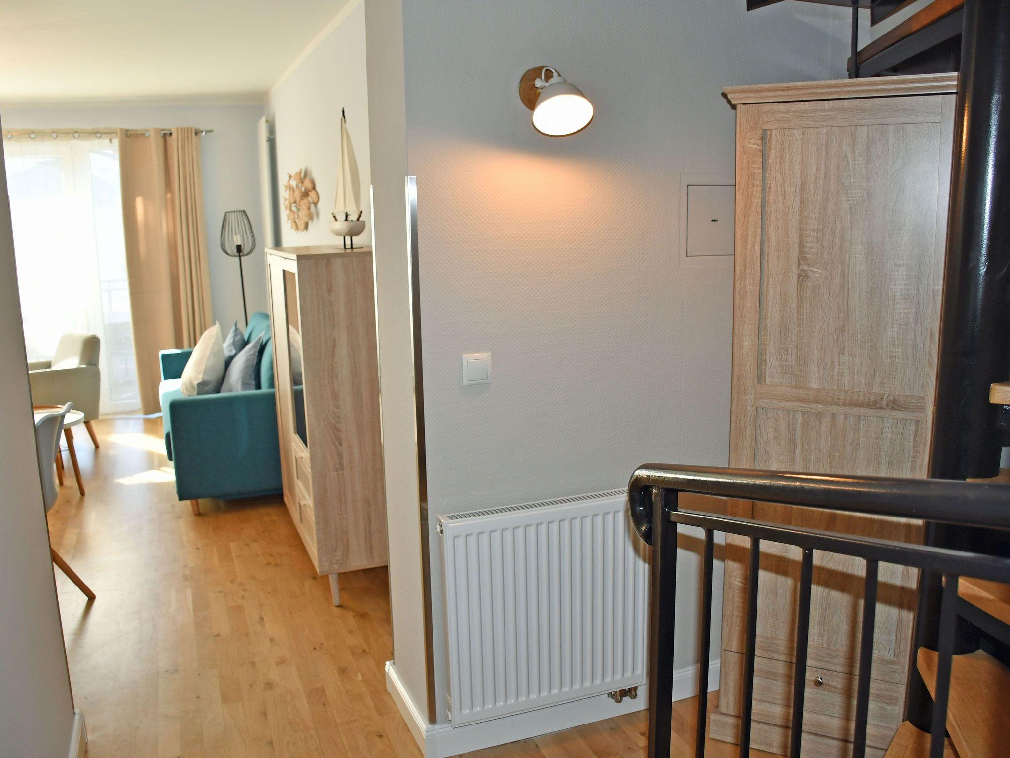 Vom Flur aus gelangt man über die Wendeltreppe in den unteren Wohnbereich der Ferienwohnung mit Küche, Wohn- und Essbereich, sowie dem Zugang zur in westlicher Richtung ausgerichteten Terrasse. Die Wohnungen sind ausgestattet mit einem Parkettboden im warmen Holzfarbton, weißen Fenstern und Zimmertüren.
