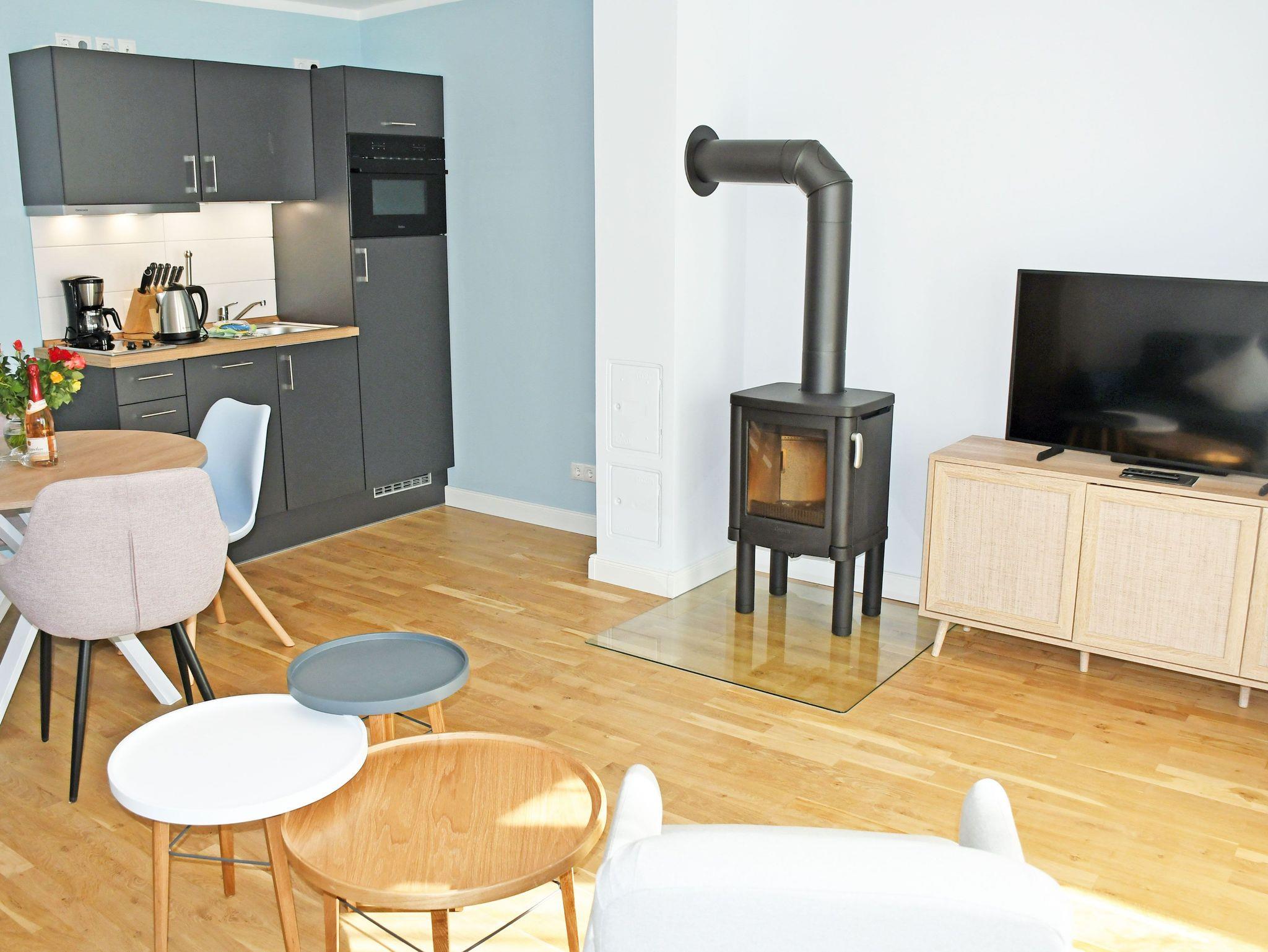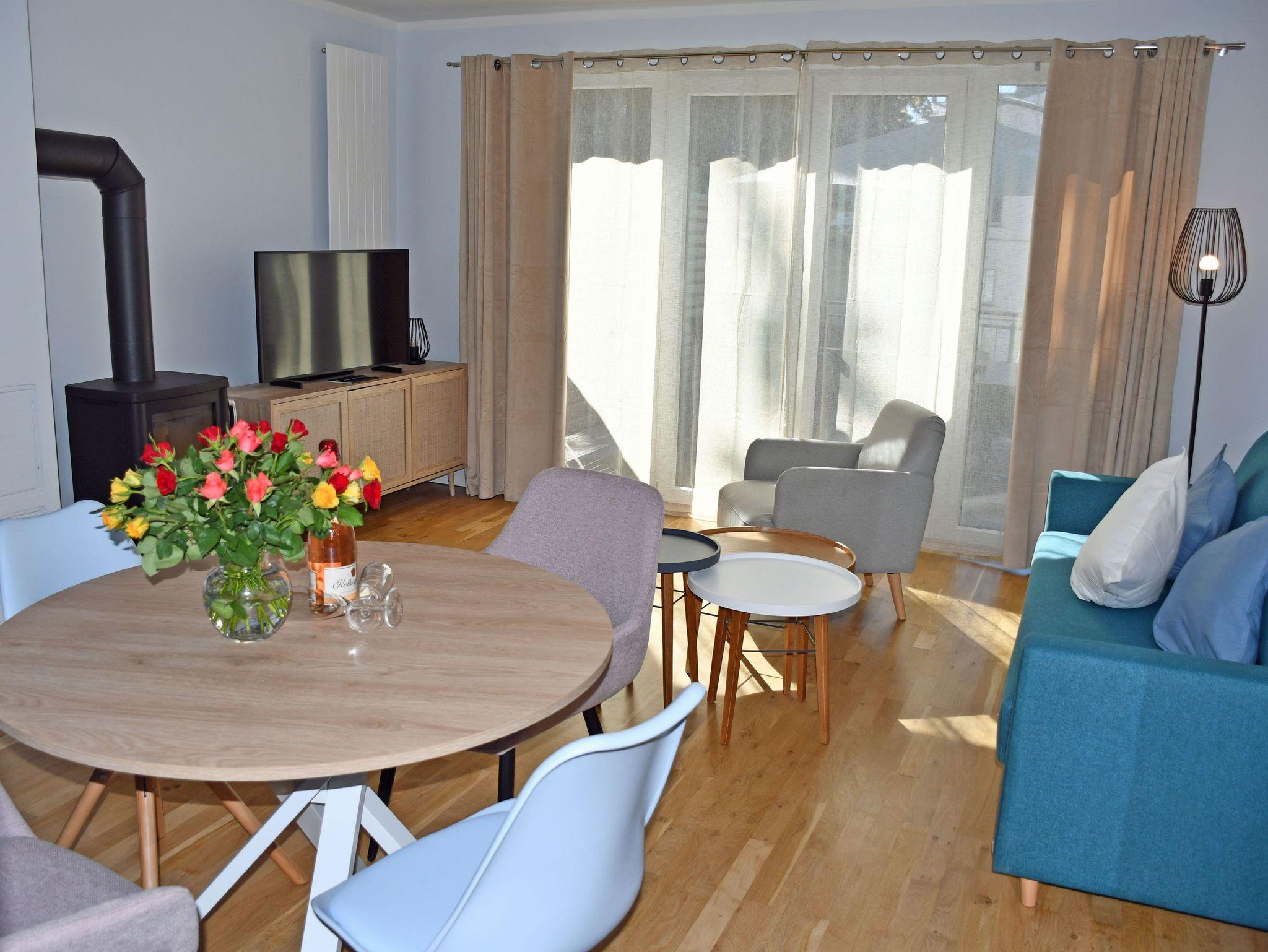 Das Wohnzimmer verfügt über einen Flachbild-TV, eine Sitzcouch, Sessel, Tisch, eine Essecke und eine Schlafcouch. Ein kleiner Kaminofen wird die Attraktivität der Ferienwohnung besonders in der dunklen Jahreszeit erheblich steigern. Auf der Schlafcouch im Wohnraum (1,60m breit) können zwei Aufbettungen hergestellt werden.