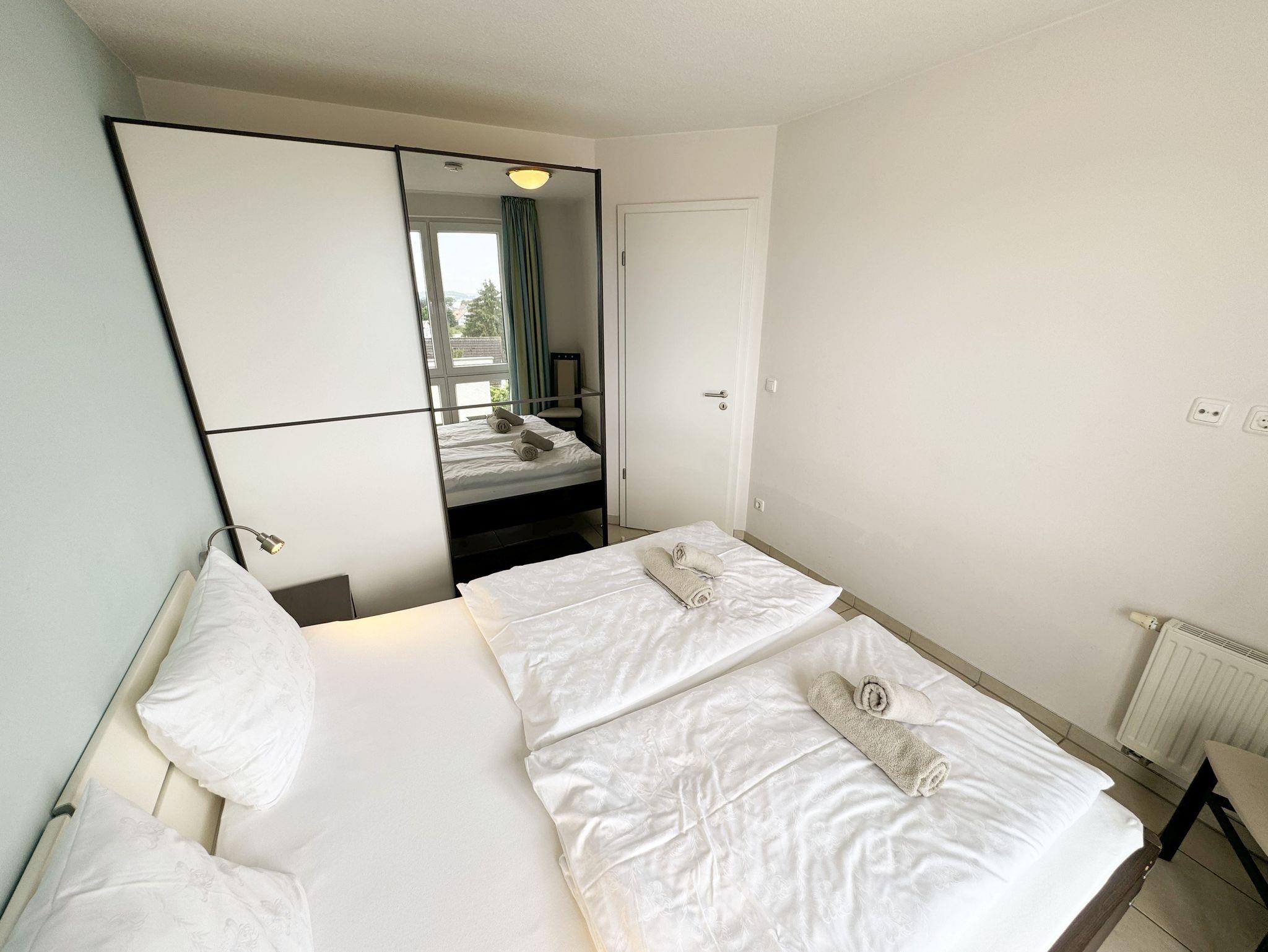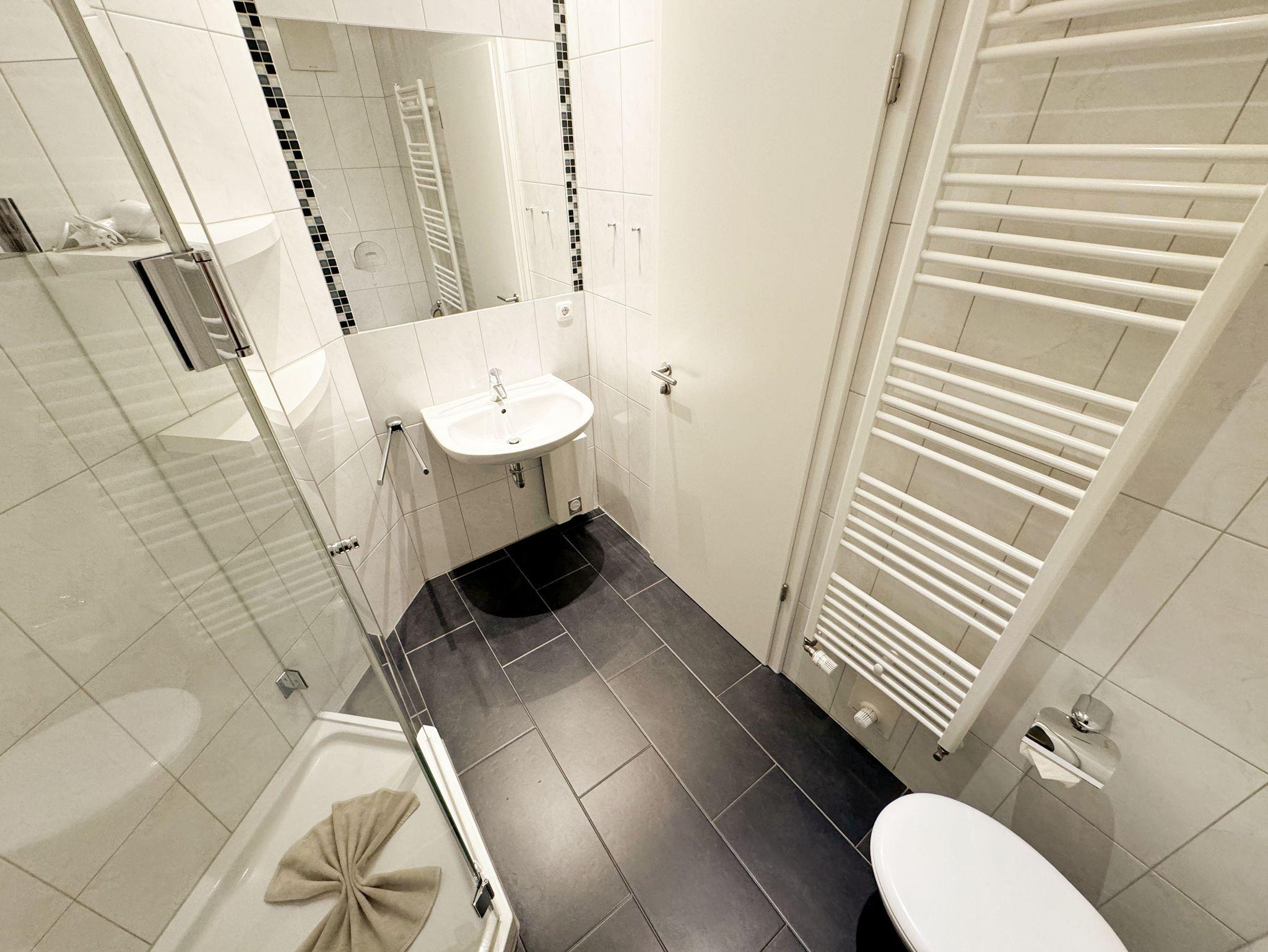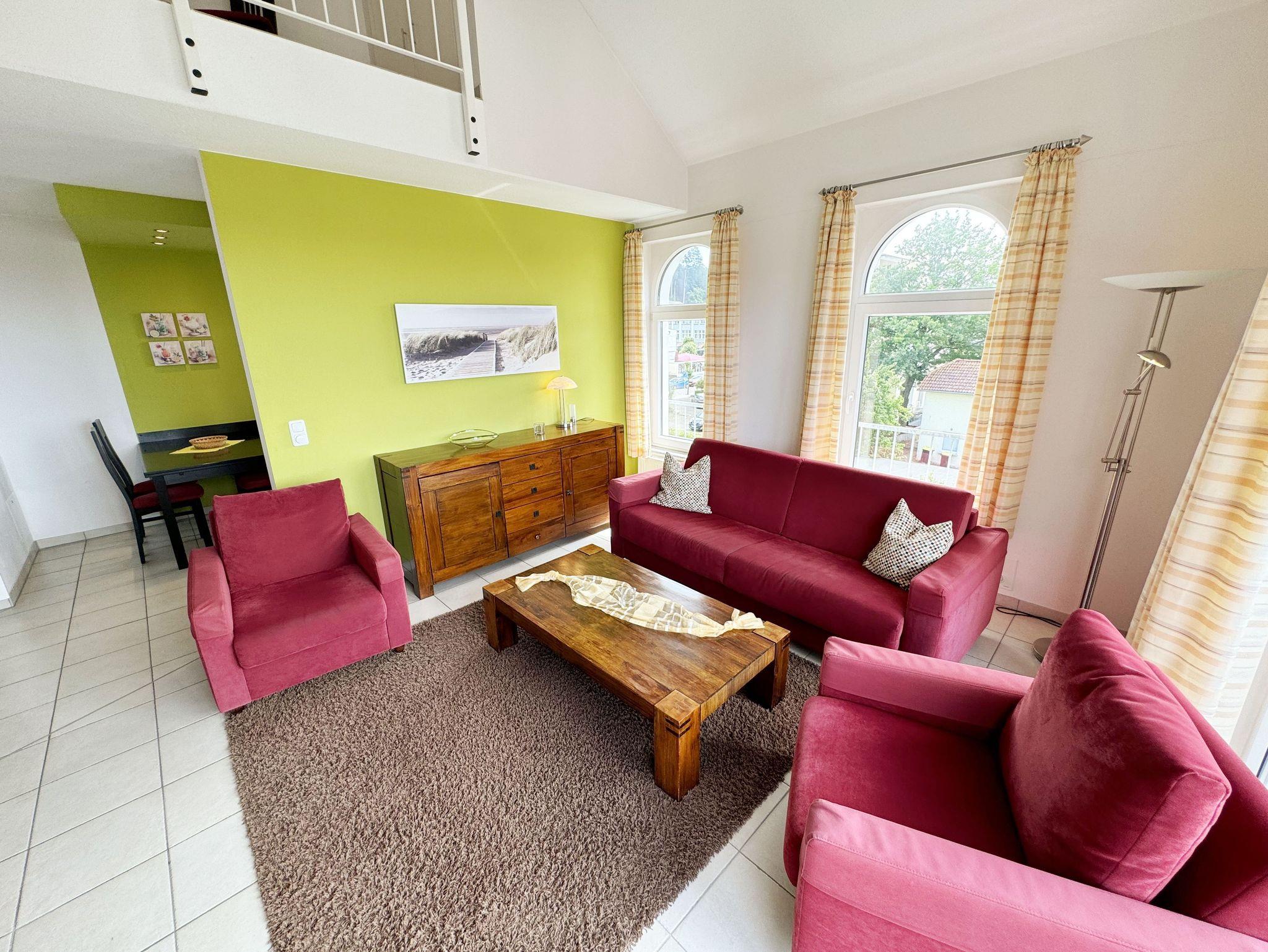 Die großzügige und lichtdurchflutete Maisonette / Ferienwohnung Nr. 10 bietet Ihnen ausreichend Platz für max. 4 Erwachsene. Die Wohnung befindet sich im Obergeschoss und ist bequem per Fahrstuhl von der Tiefgarage aus zu erreichen. Die Wohnung ist als Nichtraucherwohnung deklariert und erstreckt sich mit Ihren 72 qm über 2 Etagen. Der sehr gemütliche eingerichtete Wohnbereich ist der Dreh- und Angelpunkt der Wohnung. Hier befindet Sie eine hochwertige Couch, 2 Sessel, Couchtisch, eine Leselampe sowie einem Smart-TV (32 Zoll) mit DVD-Player/Heimkino und Internetanschluss per WLAN (inklusive). Angrenzend an den Wohnbereich finden Sie eine moderne und komplett ausgestattete Küchenzeile mit Geschirrspüler, Mikrowelle, Kühlschrank mit Eisfach, Ceranfeld, Backofen, Kaffeemaschine, Toaster, Wasserkocher, diversen Küchenutensilien und einen Holzesstisch mit 5 Stühlen. Das 1. Schlafzimmer finden Sie auf der gleichen Ebene wie den Wohn- & Essbereich. Das Schlafzimmer verfügt über ein Doppelbett (1,80m x 2,00m) mit verstellbaren Lattenrosten, Nachtischkonsolen, Verdunklungsmöglichkeit und großem Kleiderschrank mit Spiegel. In dem 1. Bad finden Sie eine Dusche, WC, Waschtisch, Kosmetikspiegel, Fön, Fußbodenheizung und einen Handtuchtrockner für Ihren alltäglichen Gebrauch, wieder. Um Ihren Urlaubstag in Ruhe ausklingen zu lassen, erreichen Sie vom Wohnbereich den begehbaren Süd-Westbalkon mit herrlichem Blick auf das Ostseebad Sellin. Durch die im Wohnbereich vorhandene Treppe gelangen Sie in das 2. Schlafzimmer, wo Sie ein Doppelbett (1,80m x 2,00m) mit verstellbaren Lattenrosten, Nachtischkonsolen, Verdunklungsmöglichkeit, Smart-TV und großem Kleiderschrank mit Spiegel wiederfinden. Angrenzend befindet sich das 2. Bad mit Dusche, WC, Waschtisch, Handtuchtrockner und einer Fußbodenheizung. Im Gemeinschafskeller können Sie gegen einen Aufpreis die gemeinschaftliche Waschmaschine und den Trockner nutzen. Die Wertmarken können Sie auf Nachfrage während Ihres Urlaubes erwerben. Die Erstausstattung eines Wäschepaketes (komplette Bettwäsche, 1 Duschhandtuch, 1 kleines Handtuch) können Sie bis 14 Tage vor Anreise gegen einen Aufpreis dazu buchen oder durch eigene ergänzen. Ab 2 gebuchten Paketen erhalten Sie einmalig 1 Geschirrhandtuch und 1 Duschvorleger hinzu. Ein eigener Pkw-Stellplatz Nr. 10 und ein Fahrradraum gehören zur Wohnung und befinden sich in der hauseigenen Tiefgarage (Einfahrtshöhe 2,10 m). Haustiere sind in der Wohnung nicht erlaubt.