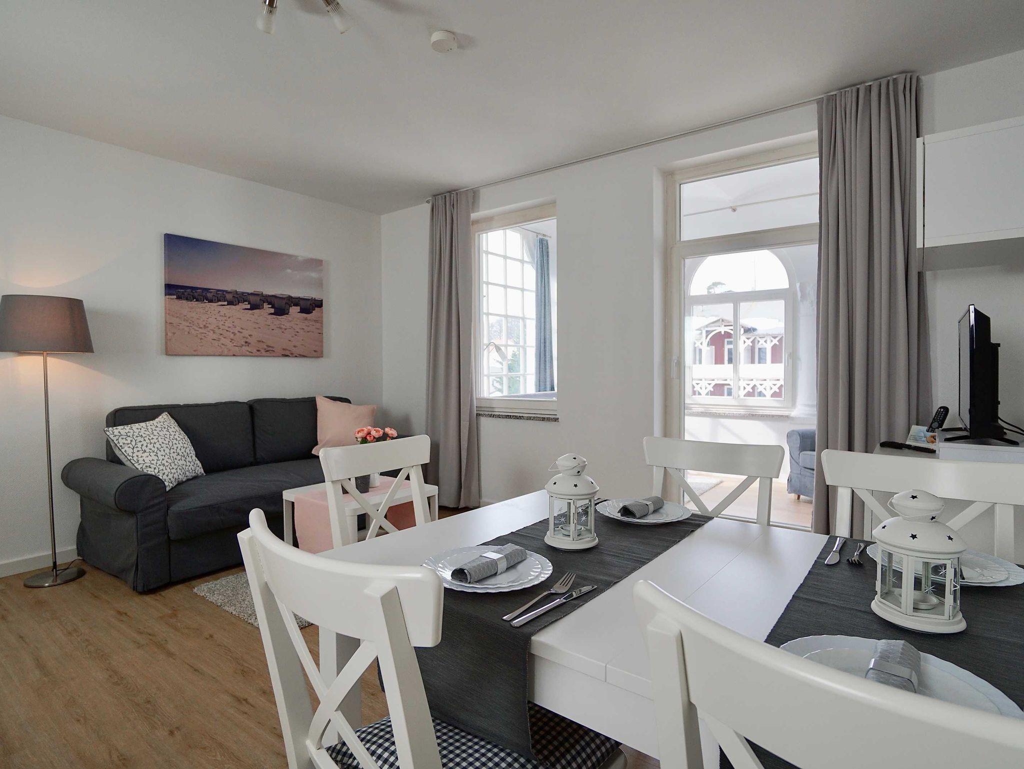 Im Komfort-Appartement Jasmund (A) mit ca. 53 - 60 m² finden bis zu 6 Personen Platz für einen schönen Urlaub. In dem modern eingerichteten Wohn- und Essbereich finden Sie ein gemütliches Sofa, das abends zu zwei Schlafmöglichkeiten umfunktioniert werden kann. Von dort aus haben Sie auch den direkten Blick auf den Flachbild-Fernseher, der gerade in den Abendstunden gut für Ihre Unterhaltung sorgen kann. Ein kostenloser WLAN-Anschluss und ein SodaStream ist nutzbar. Am großen Esstisch finden alle Gäste dieses Appartements Platz, nachdem in der angrenzenden Landhaus-Küchenzeile, die sich auch in diesem Raum befindet, die Urlaubsmahlzeit zubereitet wurde. Hier finden Sie neben einem Cerankochfeld und Backofen auch die Kaffeemaschine, Wasserkocher und Toaster.