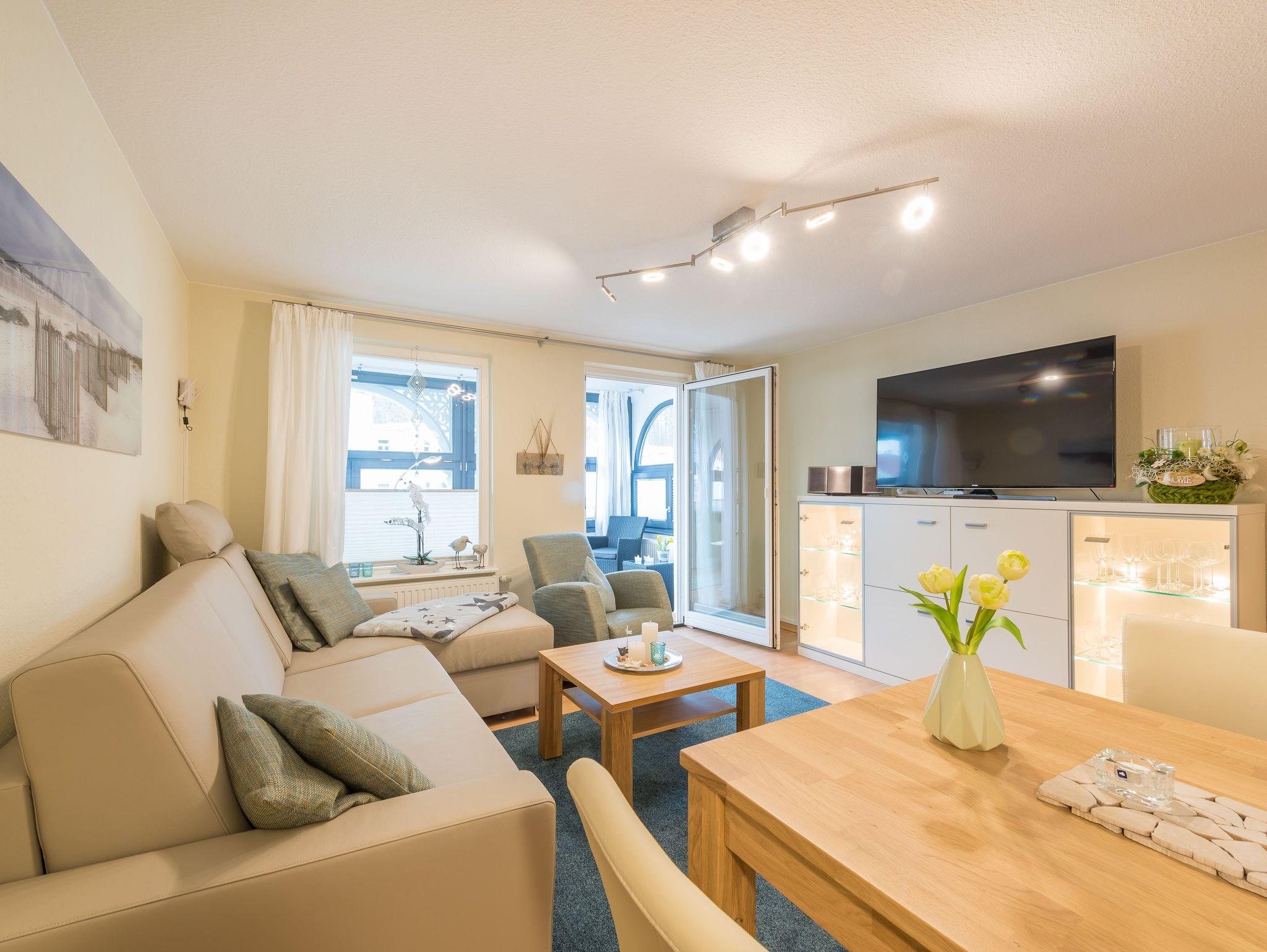 Im gemütlichen Wohnbereich gibt es einen internetfähigen Fernseher sowie einen CD-Player mit Radio. WLAN ist inklusive. Bei Anreise mit einer 5./6. Person, vorzugsweise Kinder, kann die Couch im Wohnbereich zu einem bequemen Bett umgewandelt werden (Liegefläche 1,40 m x 2,00 m). Ein heller Essplatz befindet sich ebenfalls hier und lädt zum gemeinsamen Speisen oder zum geselligen Zusammensein ein.