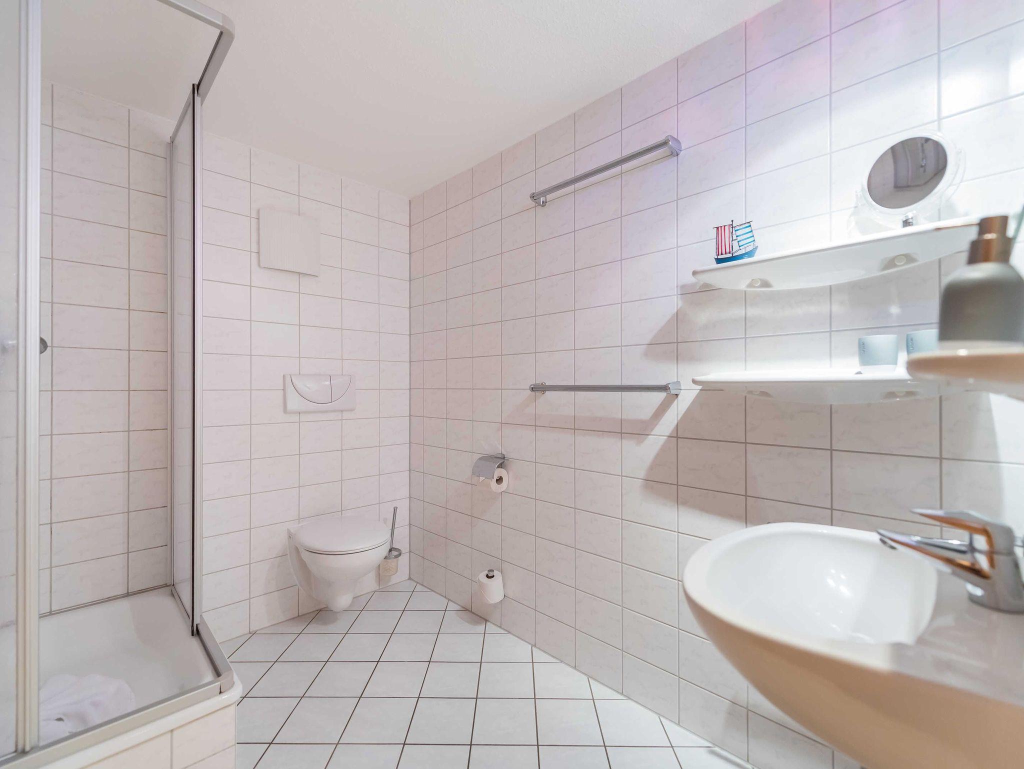 Weiterhin gibt es im Appartement ein Badezimmer mit Dusche und ein separates WC mit Handwaschbecken.