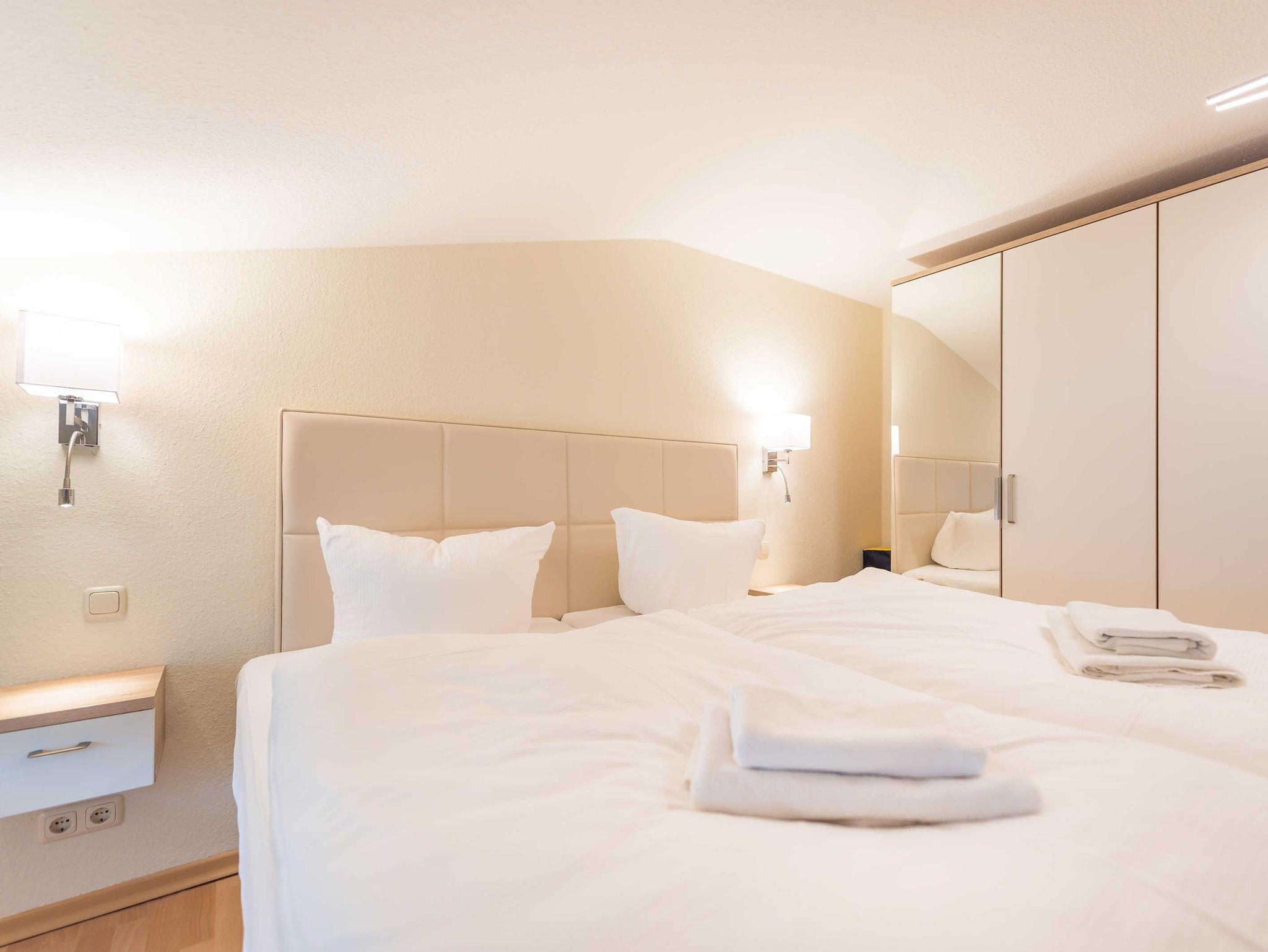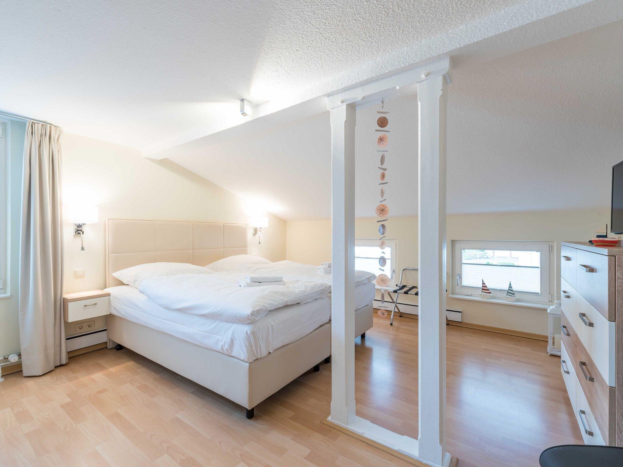 Das Appartement 7 in der 2. Etage, das Penthaus, bietet Ihnen auf ca. 75 qm ein wundervolles Feriendomizil. Es verfügt über 2 Schlafzimmer (jeweils mit einem Doppelbett 1,80 m x 2,00 m). Eines ist sogar mit einem Fernseher ausgestattet.