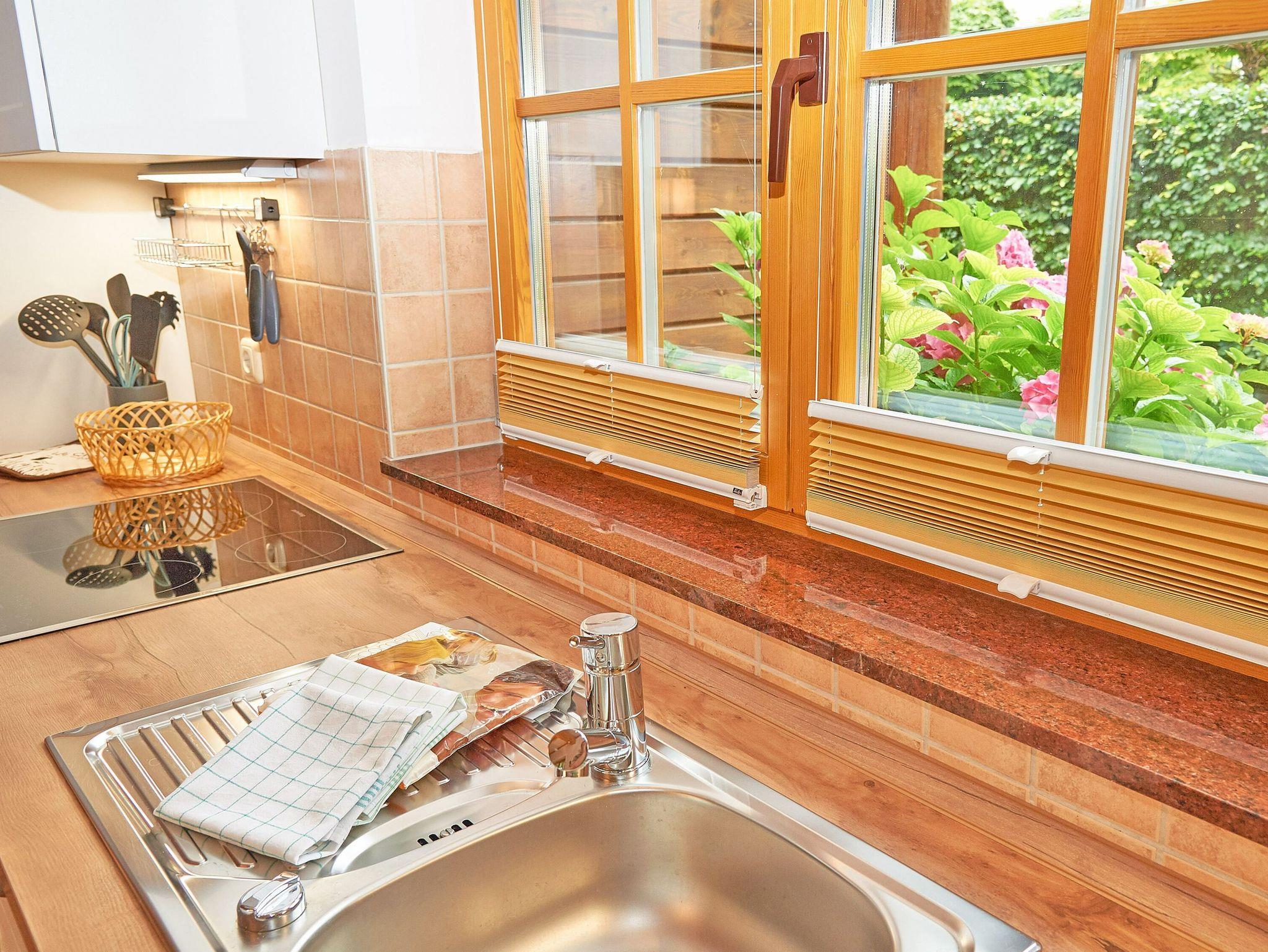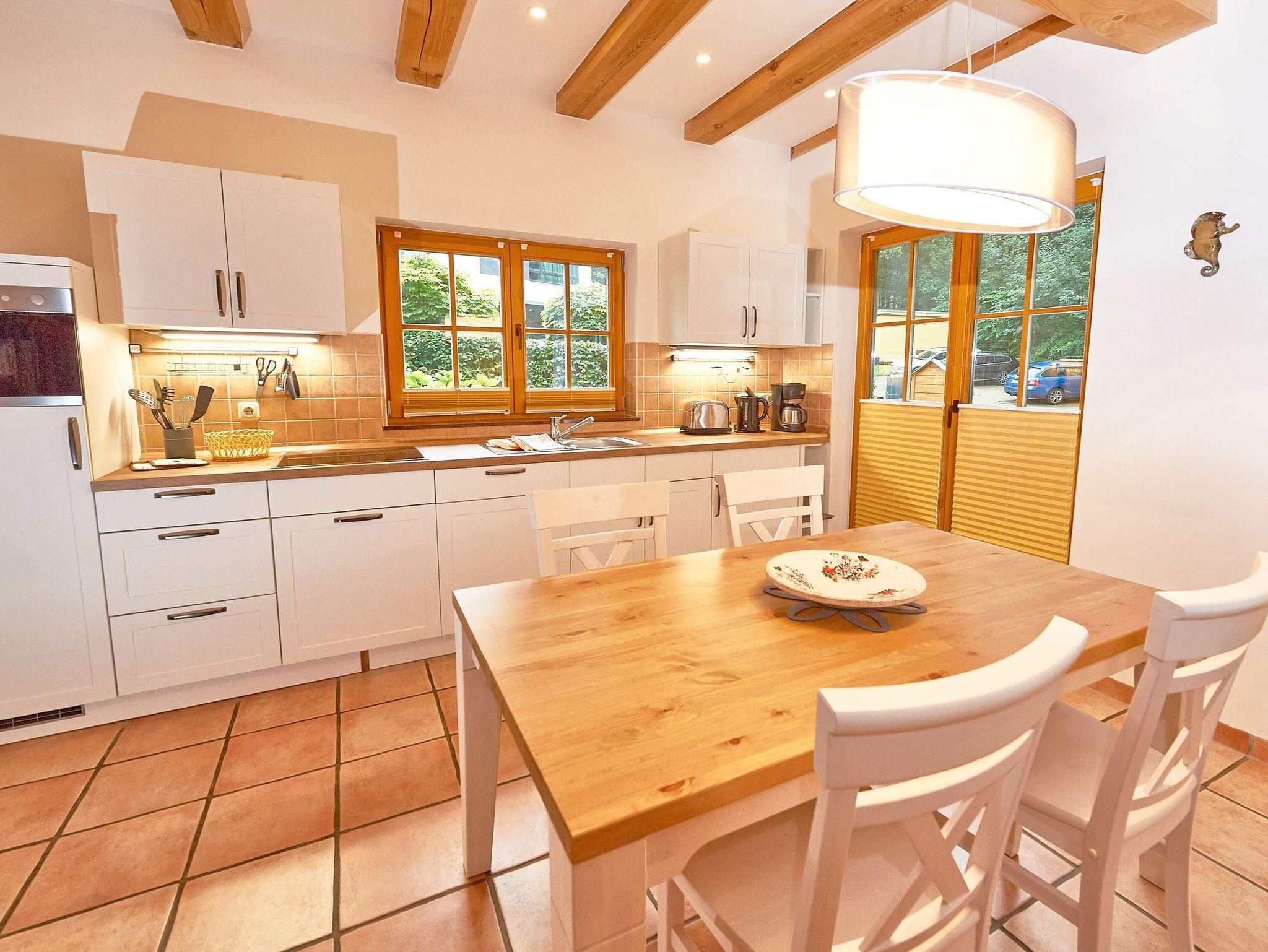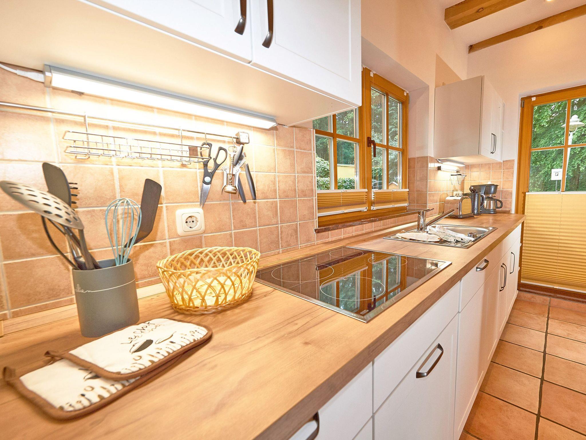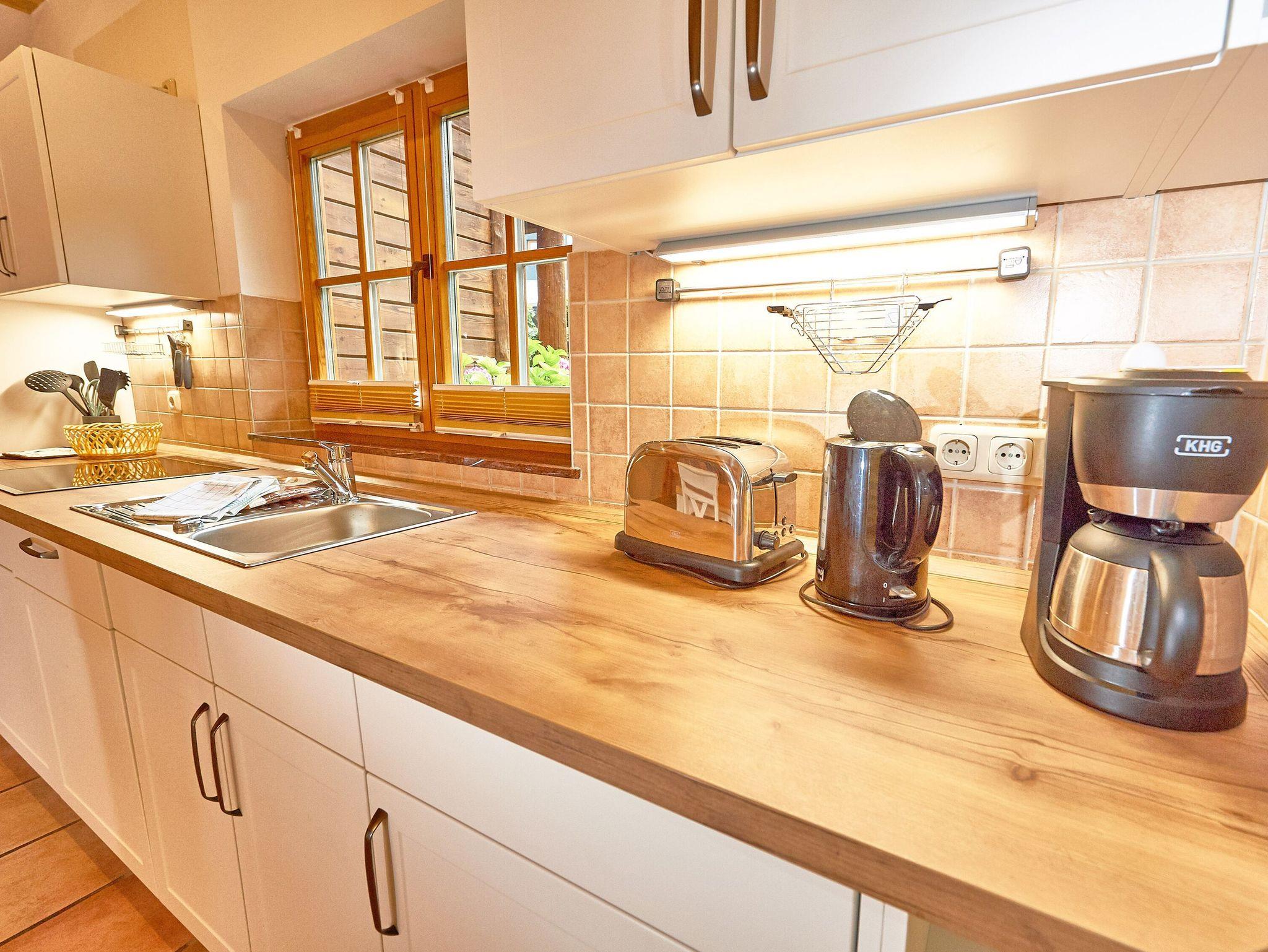 Zwei Sofas vor dem großen Flachbild-TV, kostenfreies W-LAN und der Kaminofen ermöglichen angenehme Abende, auch wenn es draußen vielleicht gerade nicht so schönes Wetter ist. Der große Esstisch ist für vier Personen geeignet. Die harmonisch in den Wohnbereich integrierte Küchenzeile ist ausgestattet mit einem 4-Zonen-Cerankochfeld, einem Kühlschrank mit Gefriermöglichkeit, einer Spülmaschine, einer Mikrowelle mit Grill, Kaffeemaschine, Toaster, Wasserkocher und diversem Kleininventar, das die Ausstattung komplettiert. Auch eine Waschmaschine ist hier untergebracht.