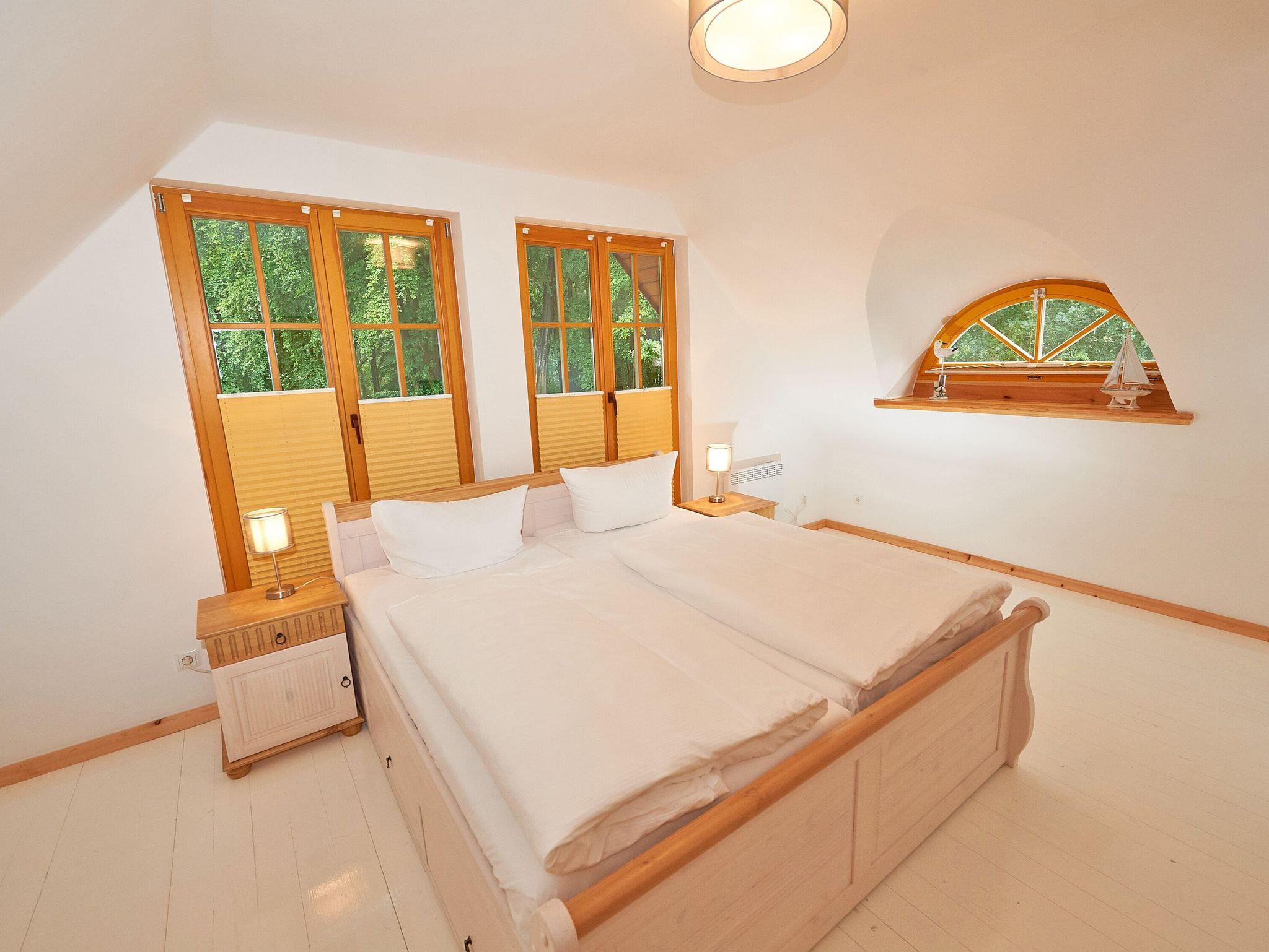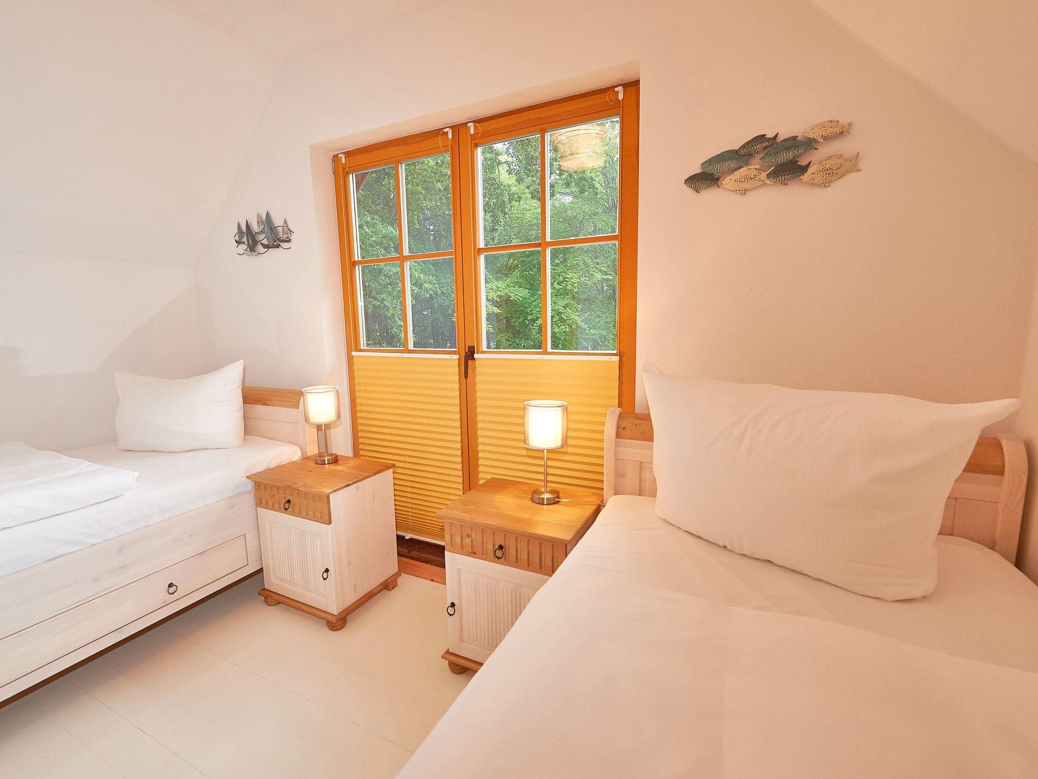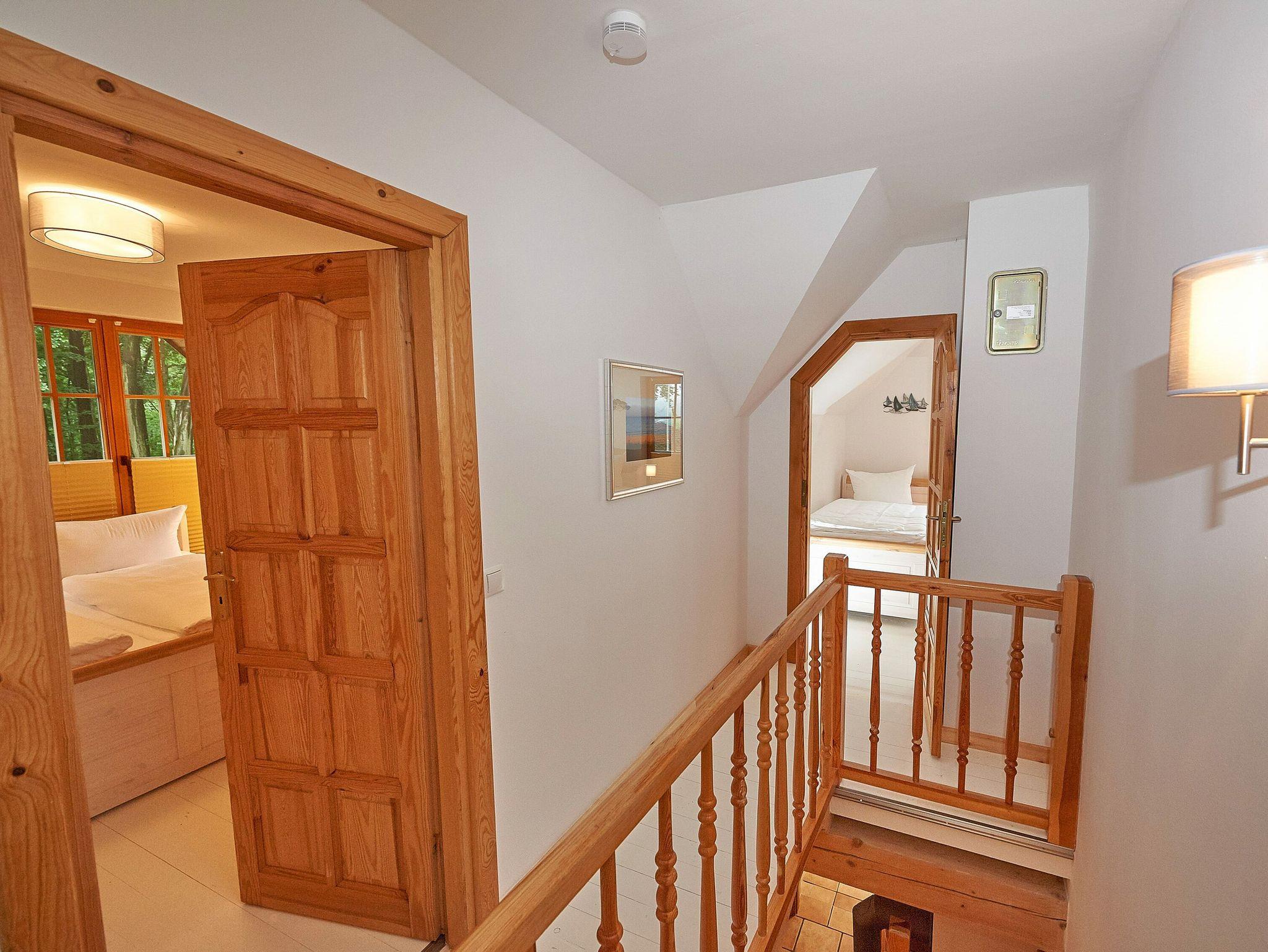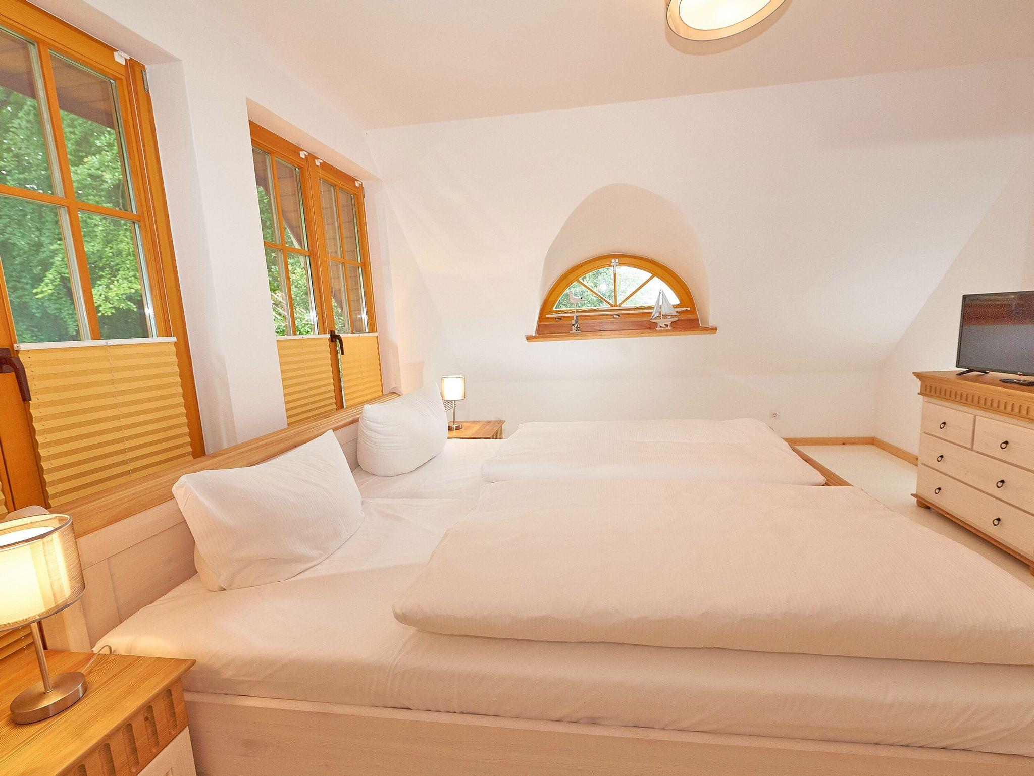 Die beiden Schlafzimmer finden Sie eine Treppe höher im Obergeschoss. Während das größere der beiden Schlafzimmer mit einem komfortablen Doppelbett und einem zusätzlichen TV-Gerät ausgestattet ist, bietet das zweite Schlafzimmer zwei Einzelbetten und einen geräumigen Kleiderschrank.