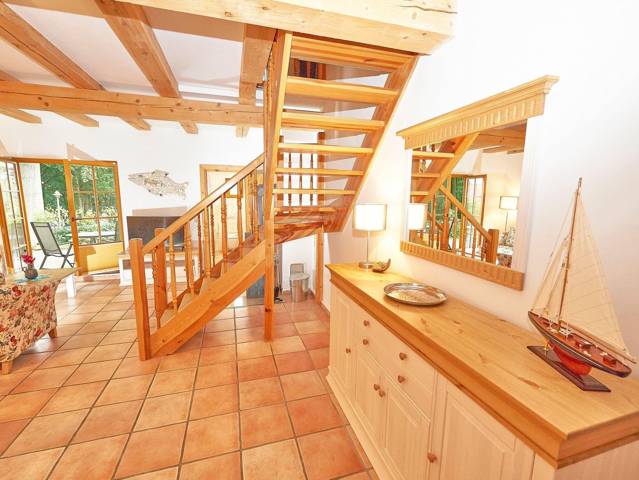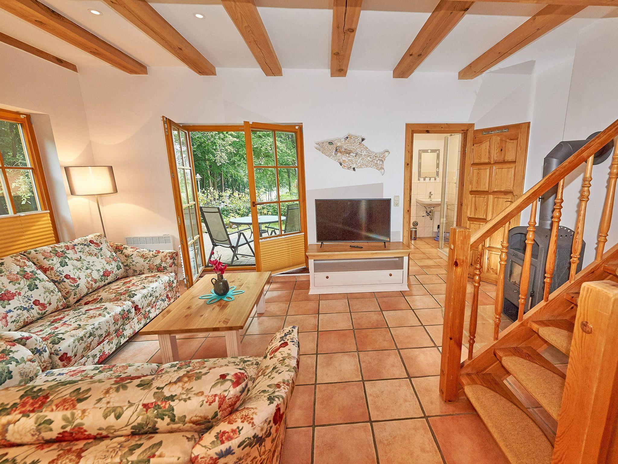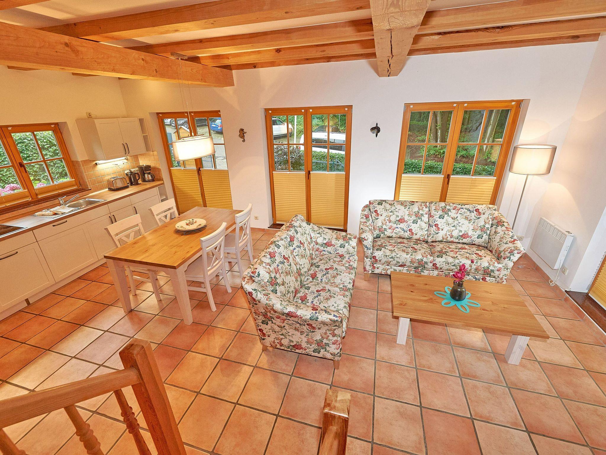 Ganz vorn im Strandschlösschen gelegen, begrüßt Sie die Haushälfte 1 mit rund 100 m² Wohnfläche über zwei Etagen. Wie die anderen drei Haushälften auch, verfügt sie im Erdgeschoss über ein großes und funktional eingerichtetes Wohnzimmer, das durch die offenen Balken besonders gemütlich wirkt. Die Terrasse zur Westseite ist mit Sonnenliegen und Sitzgruppe ausgestattet.