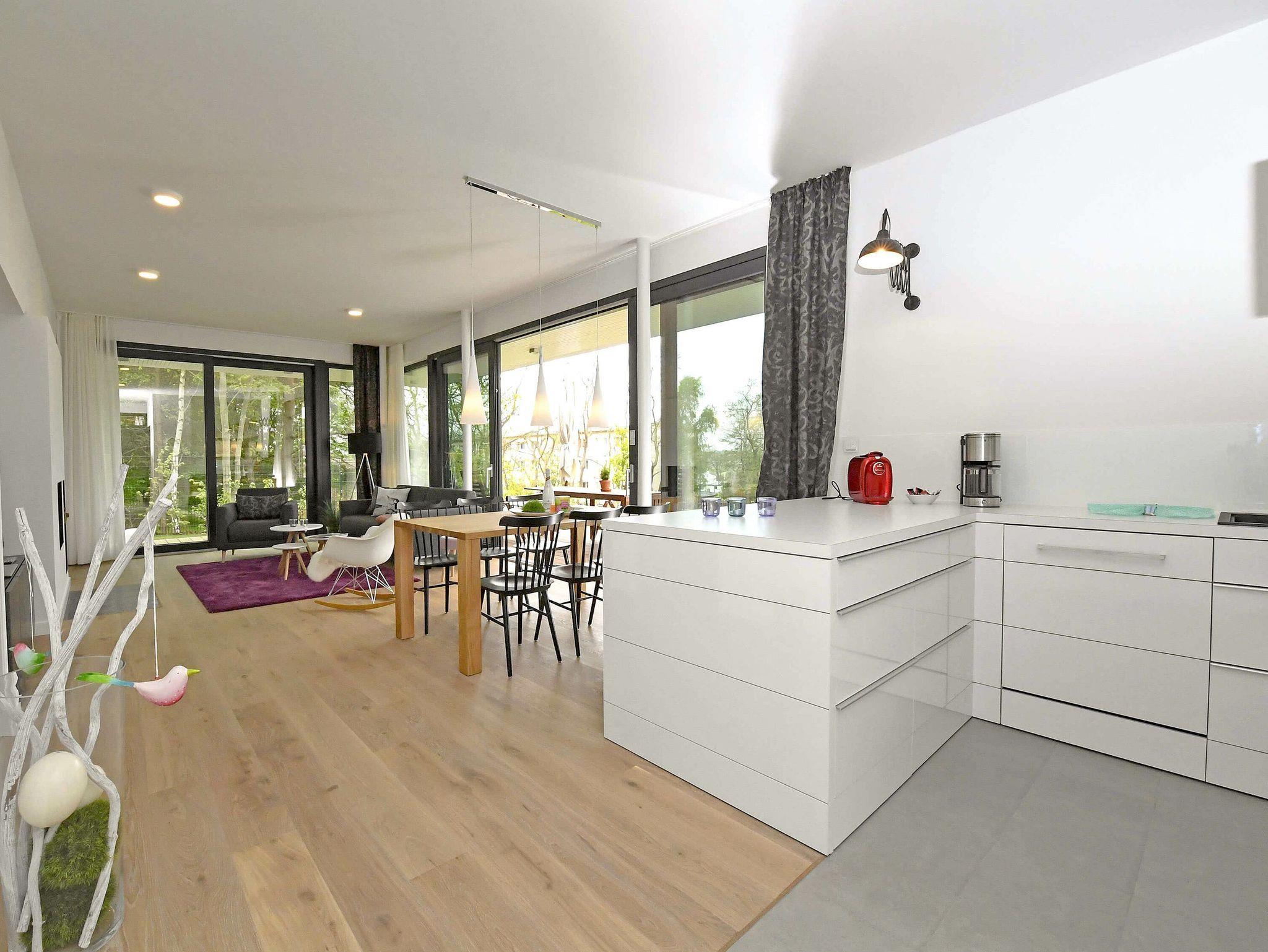 Die in den Wohnbereich integrierte voll ausgestattete und aufwändig gefertigte Einbauküche verfügt über einen Kühlschrank, eine Geschirrspülmaschine, ein 4-Zonen-Cerankochfeld mit Backofen, einen Nespresso-Automaten und eine Filterkaffeemaschine, einen Wasserkocher, einen Toaster und diverses Kleininventar, das die sehr gute Ausstattung komplettiert.