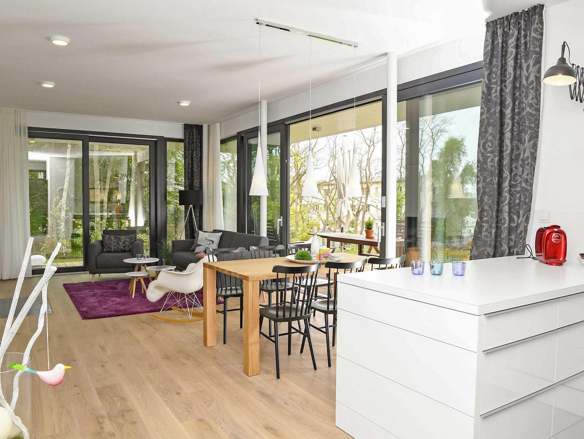 Diese wohltuend großzügige Wohnung im Erdgeschoss mit ca. 103 m² Wohnfläche betreten Sie über einen separaten Eingang. Sie verfügt über einen offenen Wohn-/Essbereich mit hochwertiger Sitzgruppe, einem Plasma-TV sowie einem großen Esstisch. Der Kaminofen sorgt für behagliche Wärme. Kaminholz steht Ihnen kostenfrei zur Verfügung. Zudem ist eine Fußbodenheizung vorhanden.