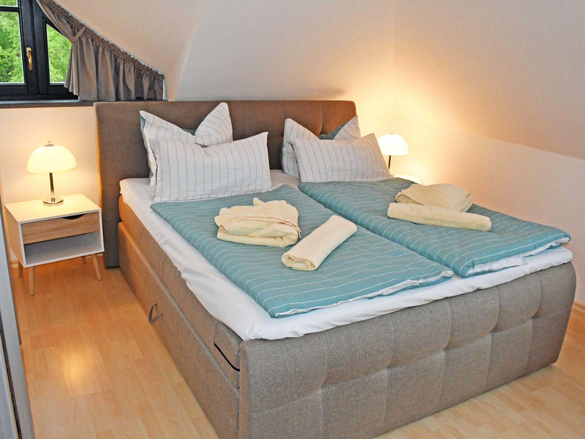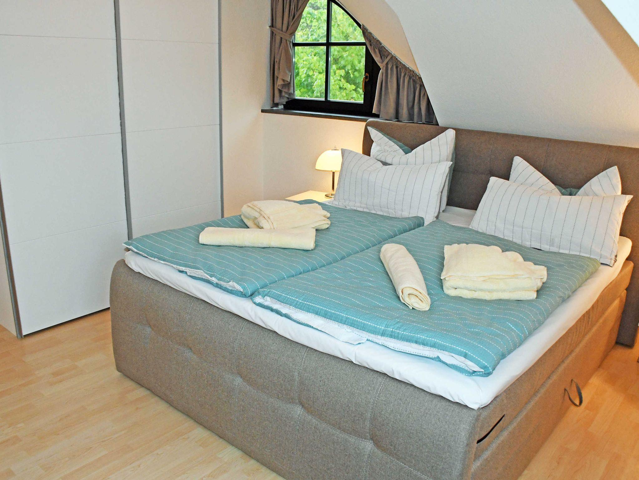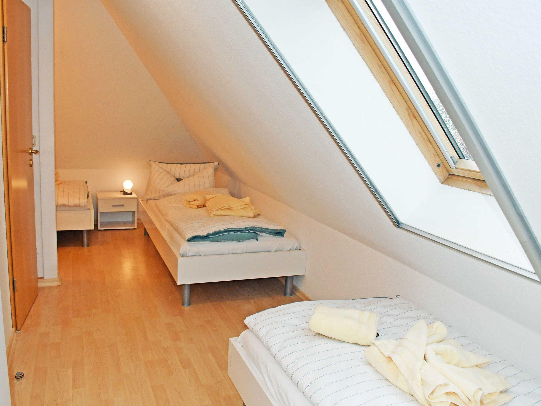 Im 1. Schlafzimmer befinden sich ein bequemes Doppelbett mit Nachttischen und Leselampen sowie einem Kleiderschrank. Auf Wunsch kann hier ein Kinderreisebett und ein Hochstuhl bereit gestellt werden. Das 2. Schlafzimmer befindet sich im Dachgeschoss, hier stehen 3 Einzelbetten.