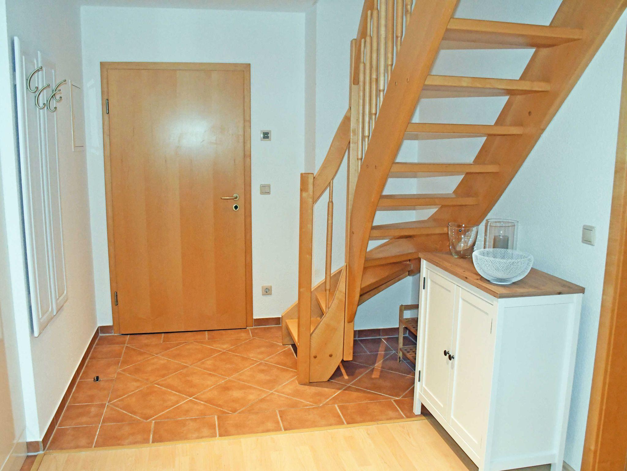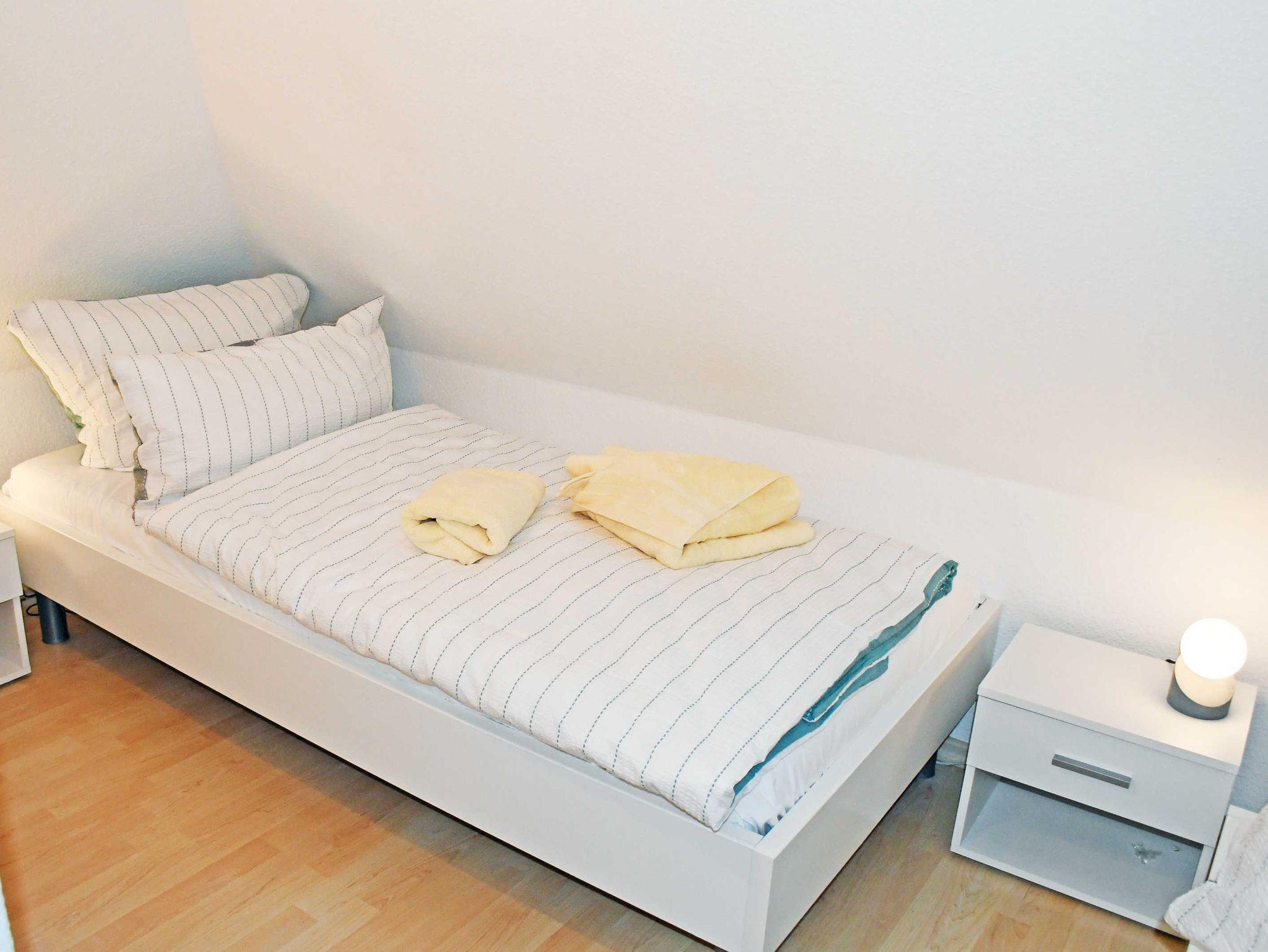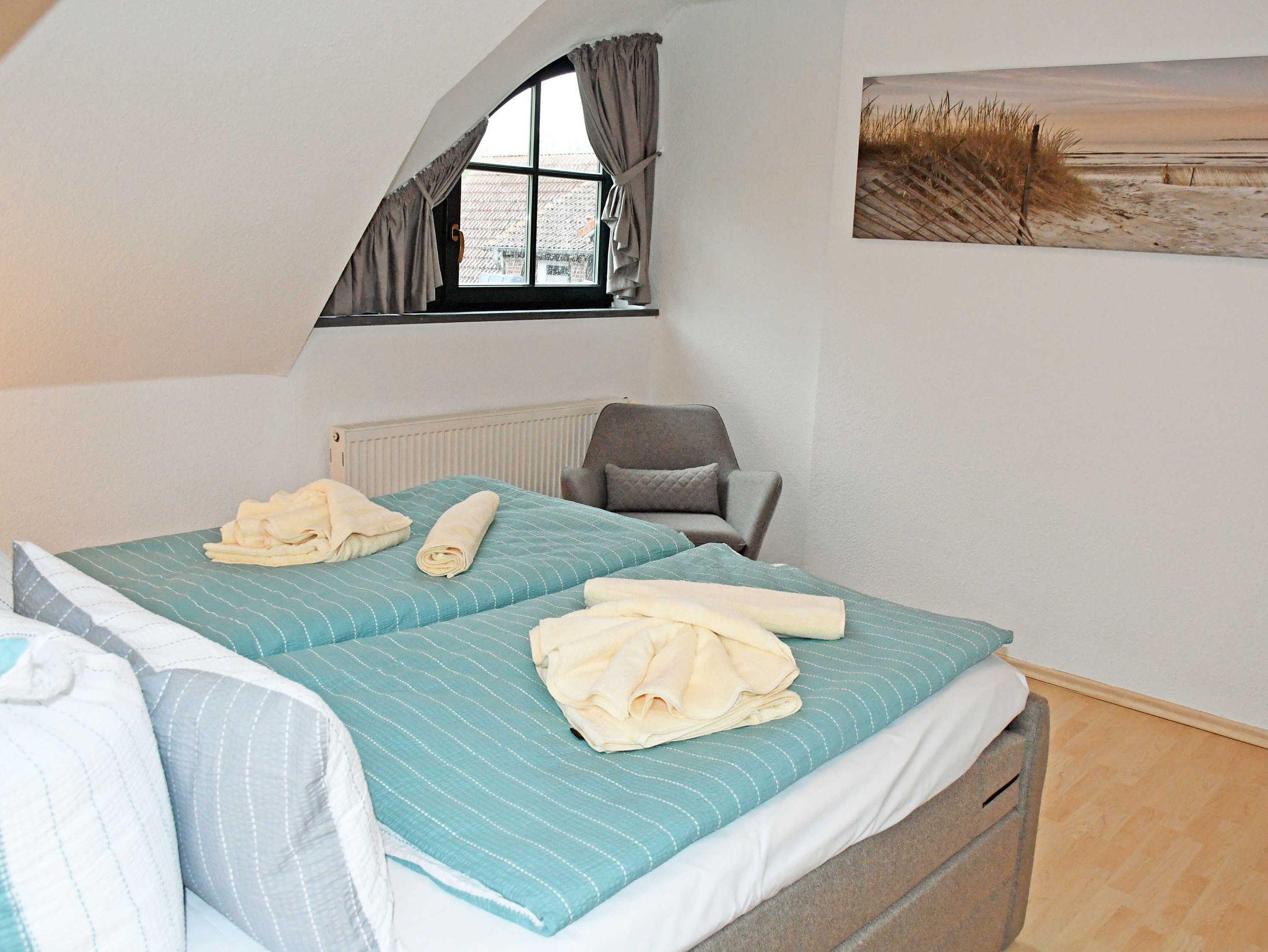 Im 1. Schlafzimmer befinden sich ein bequemes Doppelbett mit Nachttischen und Leselampen sowie einem Kleiderschrank. Auf Wunsch kann hier ein Kinderreisebett und ein Hochstuhl bereit gestellt werden. Das 2. Schlafzimmer befindet sich im Dachgeschoss, hier stehen 3 Einzelbetten.