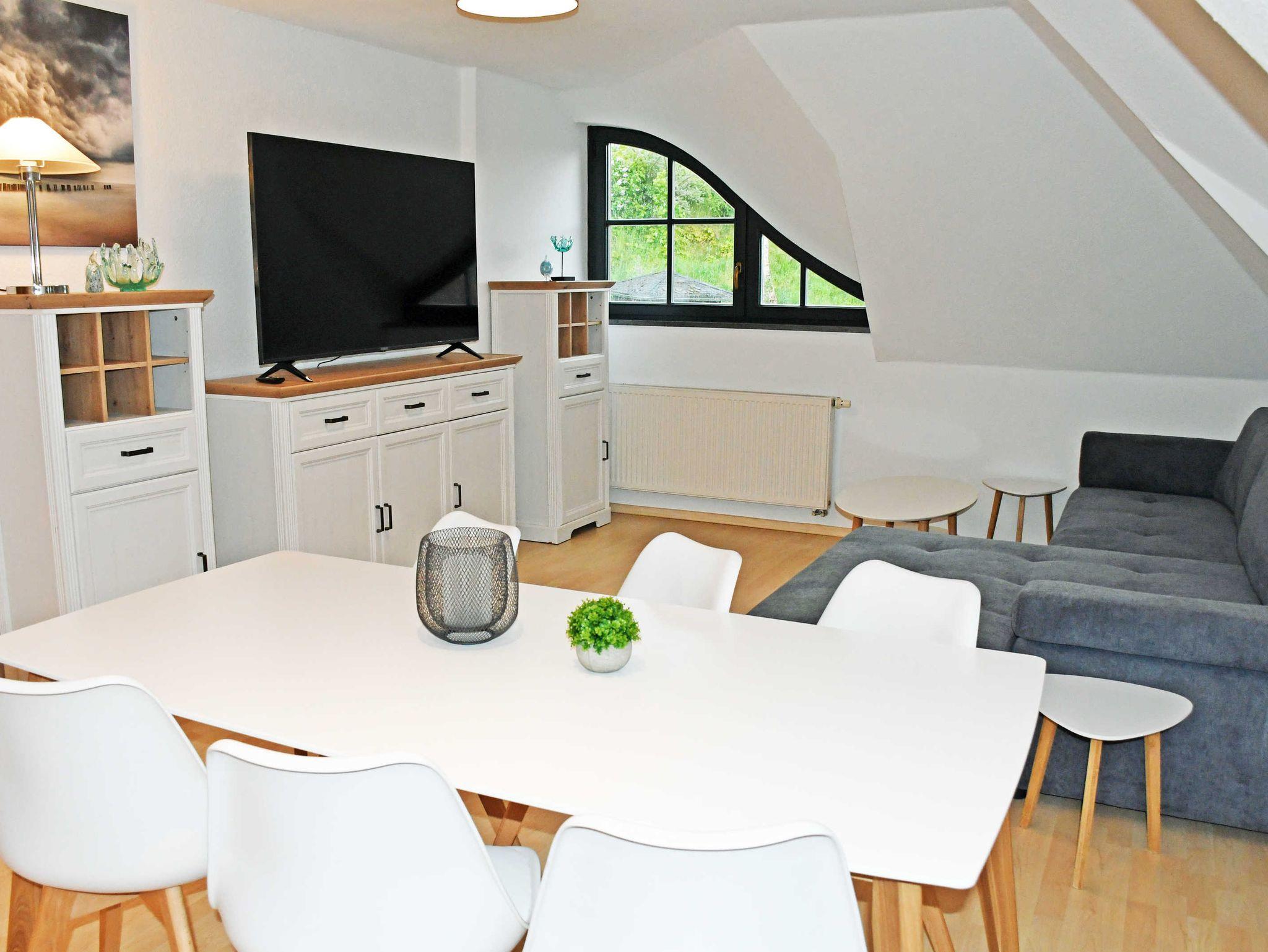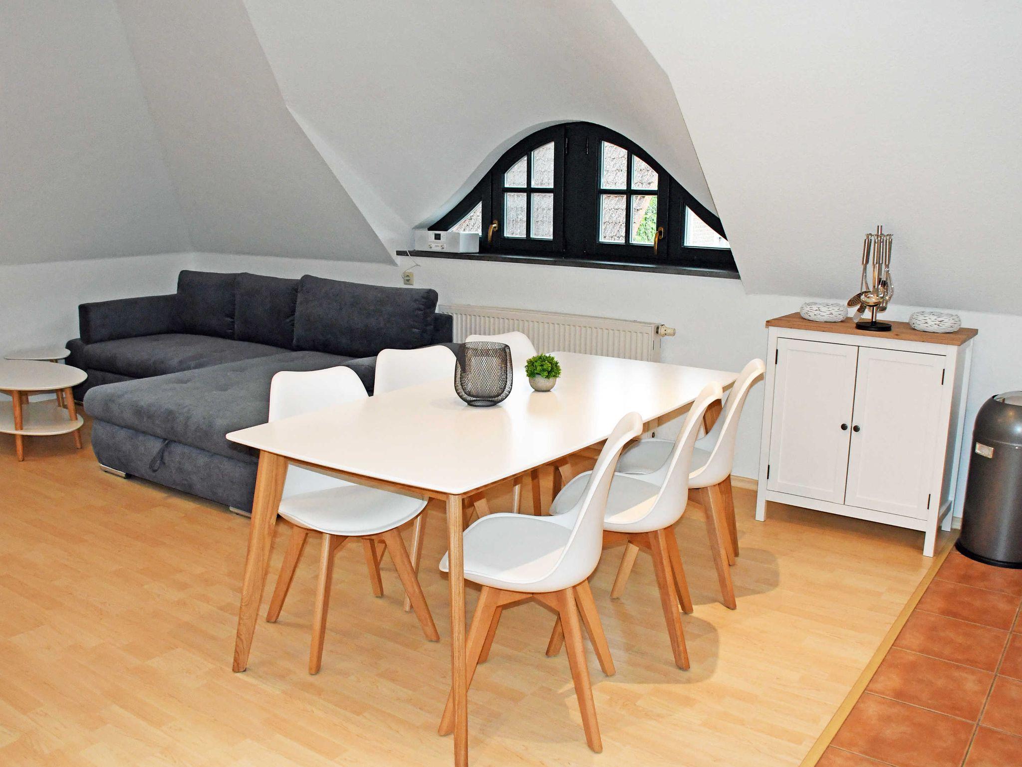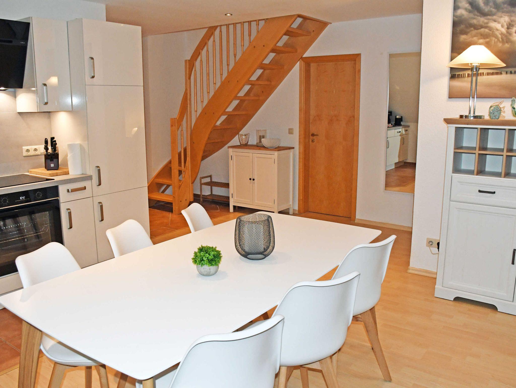 Im Wohnraum (1. OG) stehen eine große Couch, ein Tisch mit Sesseln und ein modernes Flachbild-TV-Gerät. Die Küchenzeile im Wohnbereich, ist mit Elektroherd mit Ceranfeld, Backofen, Kühlschrank mit Gefrierfach, Kaffeemaschine, Wasserkocher, Toaster komplett ausgestattet. Hier steht auch ein großer Esstisch mit Stühlen.