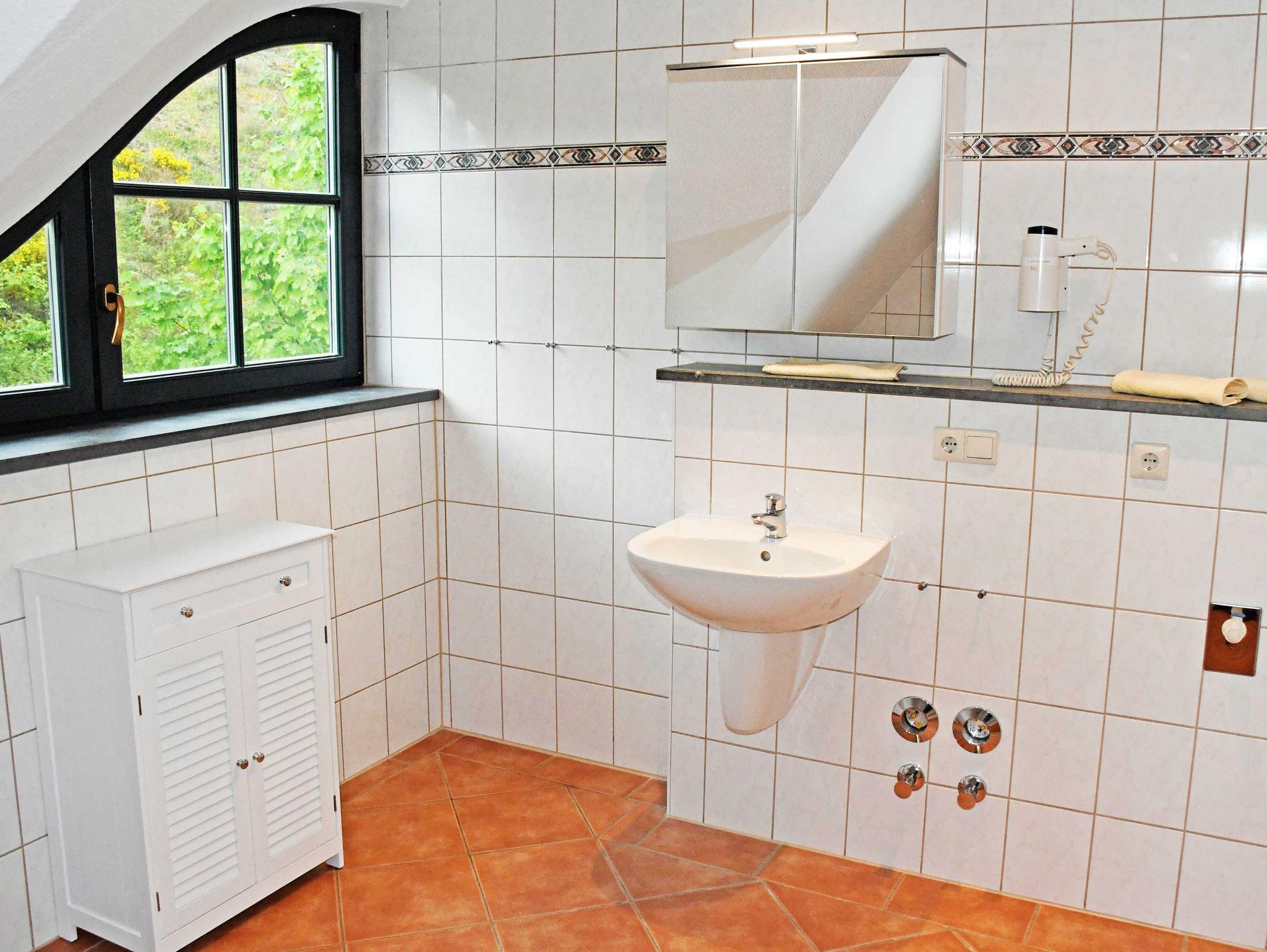 Das sehr große Bad ist mit Dusche, WC, Handtuchwärmer und Waschtisch ausgestattet und verfügt über Tageslicht.