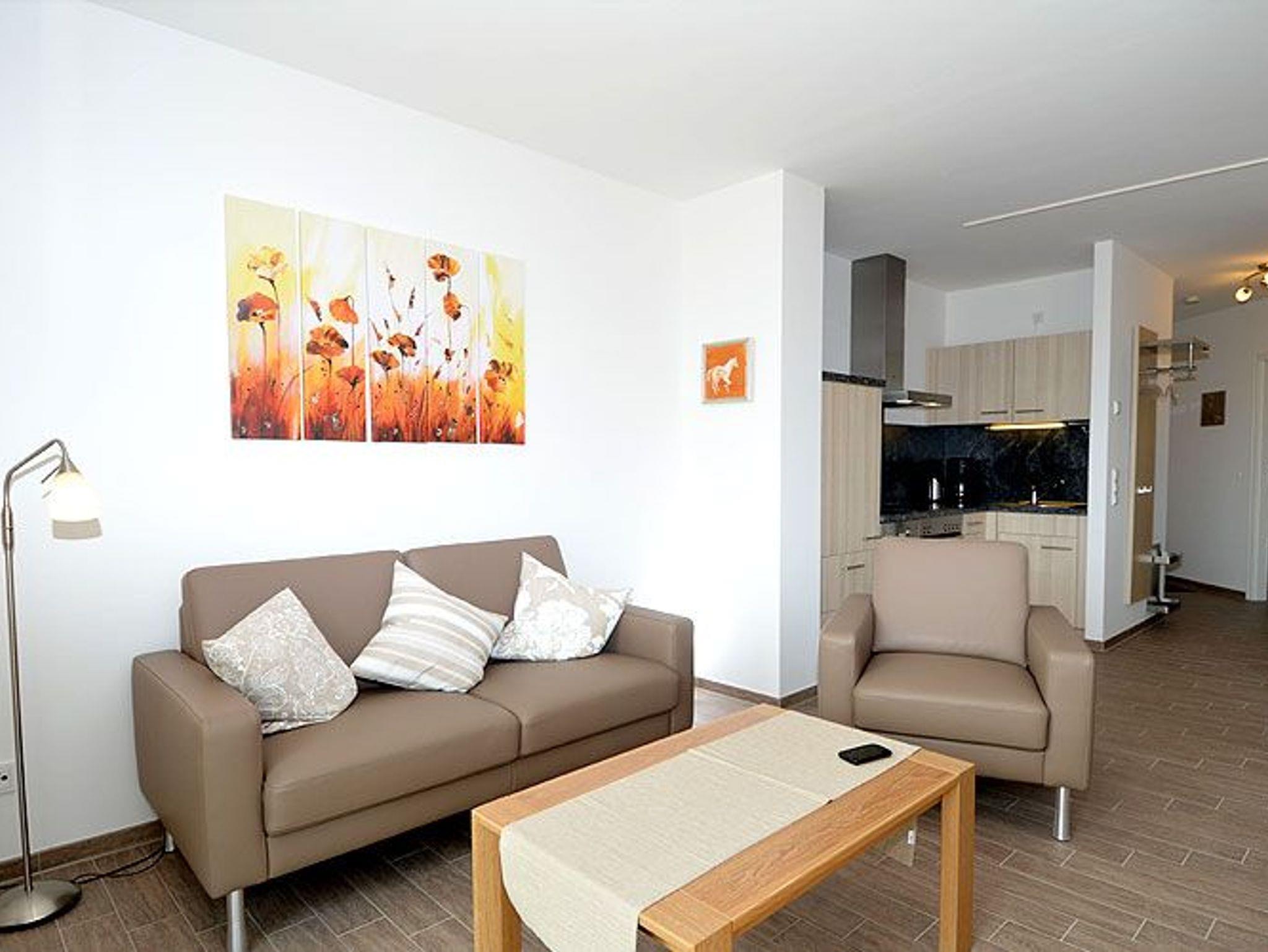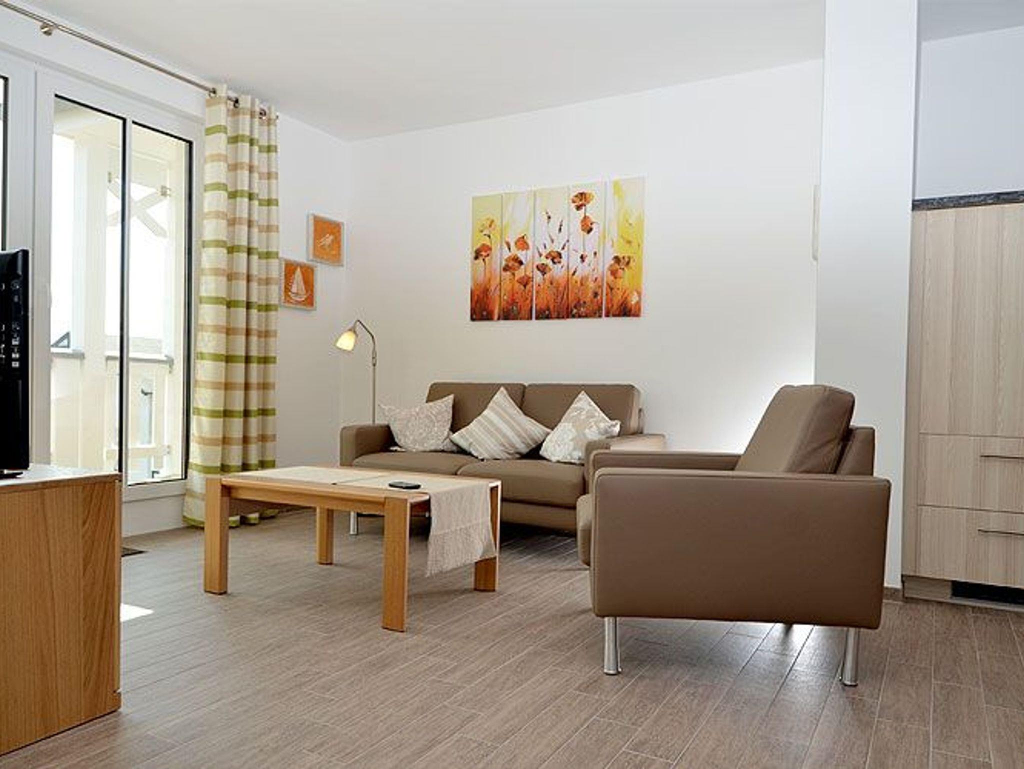 Dieses ca. 58 m² große und geschmackvoll eingerichtete 2-Raum-Appartement begrüßt Sie im Dachgeschoss der Villa Annika. Sie dürfen sich auf eine helle und lichtdurchflutete Wohnung mit edlen Echtholzmöbeln im Wohnzimmer freuen. Zu den Highlights Ihres Urlaubsdomizils zählen die ca. 9 m² große, überdachte Loggia und der ca. 5 m² große Balkon mit Blick nach Süden.