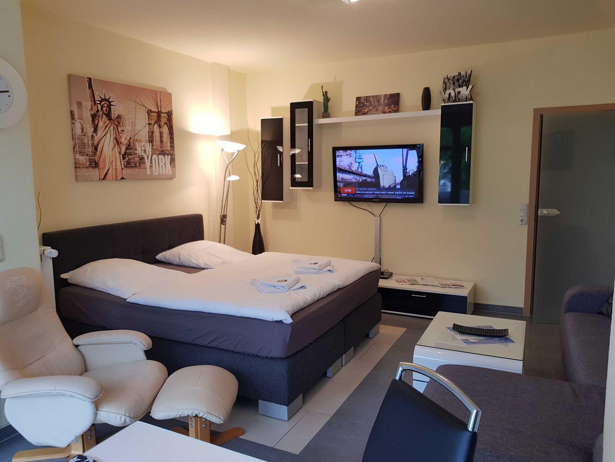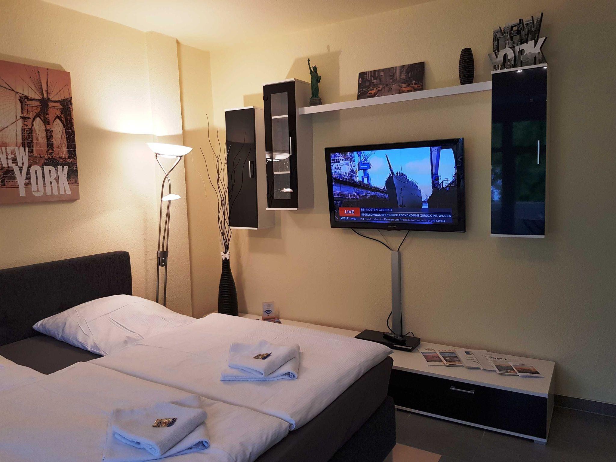 Die 1 Raum Apartments haben Wohn-Schlafraum mit Doppelbett für 2 Pers.und einer ausziehbaren Couch, Kabel-TV,CD Stereoanlage ,Esstisch, gut ausgestattete Küchenzeile mit Geschirrspüler, Kaffeemaschine, Toaster und Microwelle. Babybett ( ohne Wäsche )und Hochstuhl für die kleinen stellen wir für 5 Euro zur verfügung ( bitte vorbestellen ) . Eine Waschmaschine steht gegen Gebühr im Haus in den Gemeinschaftsräumen zur Verfügung.