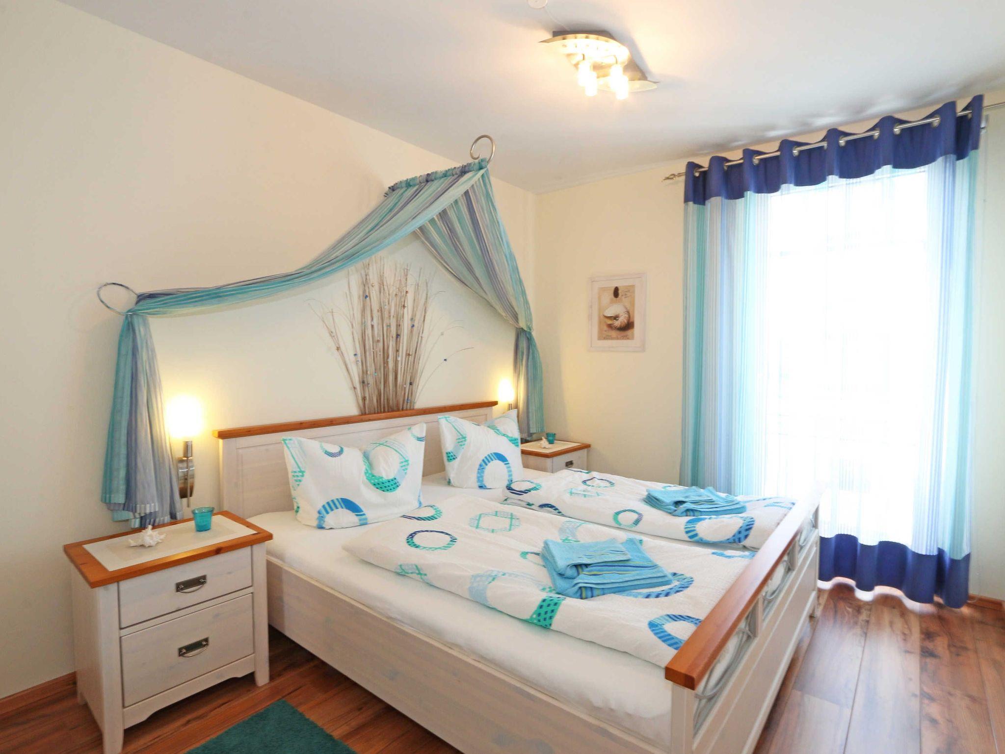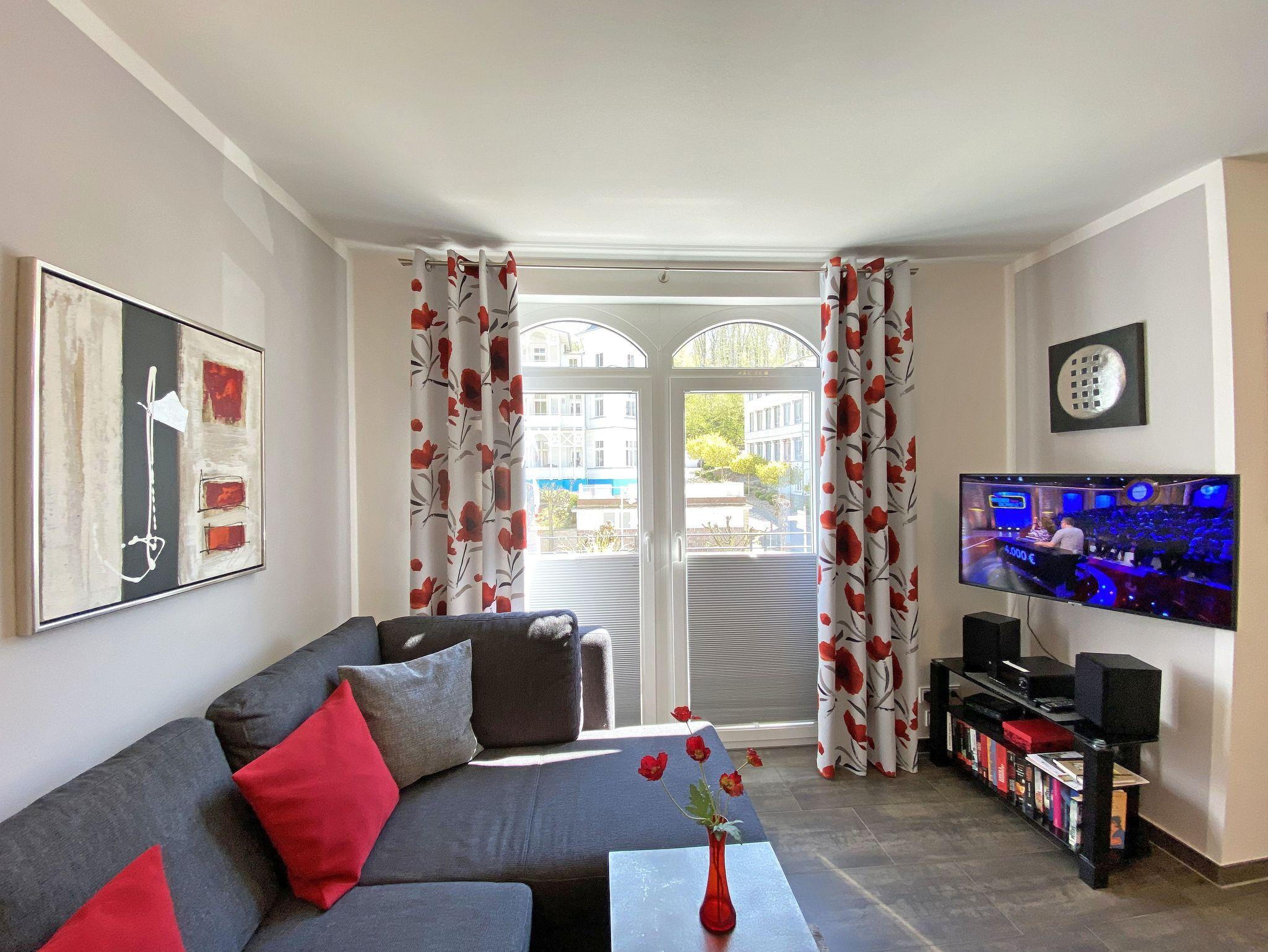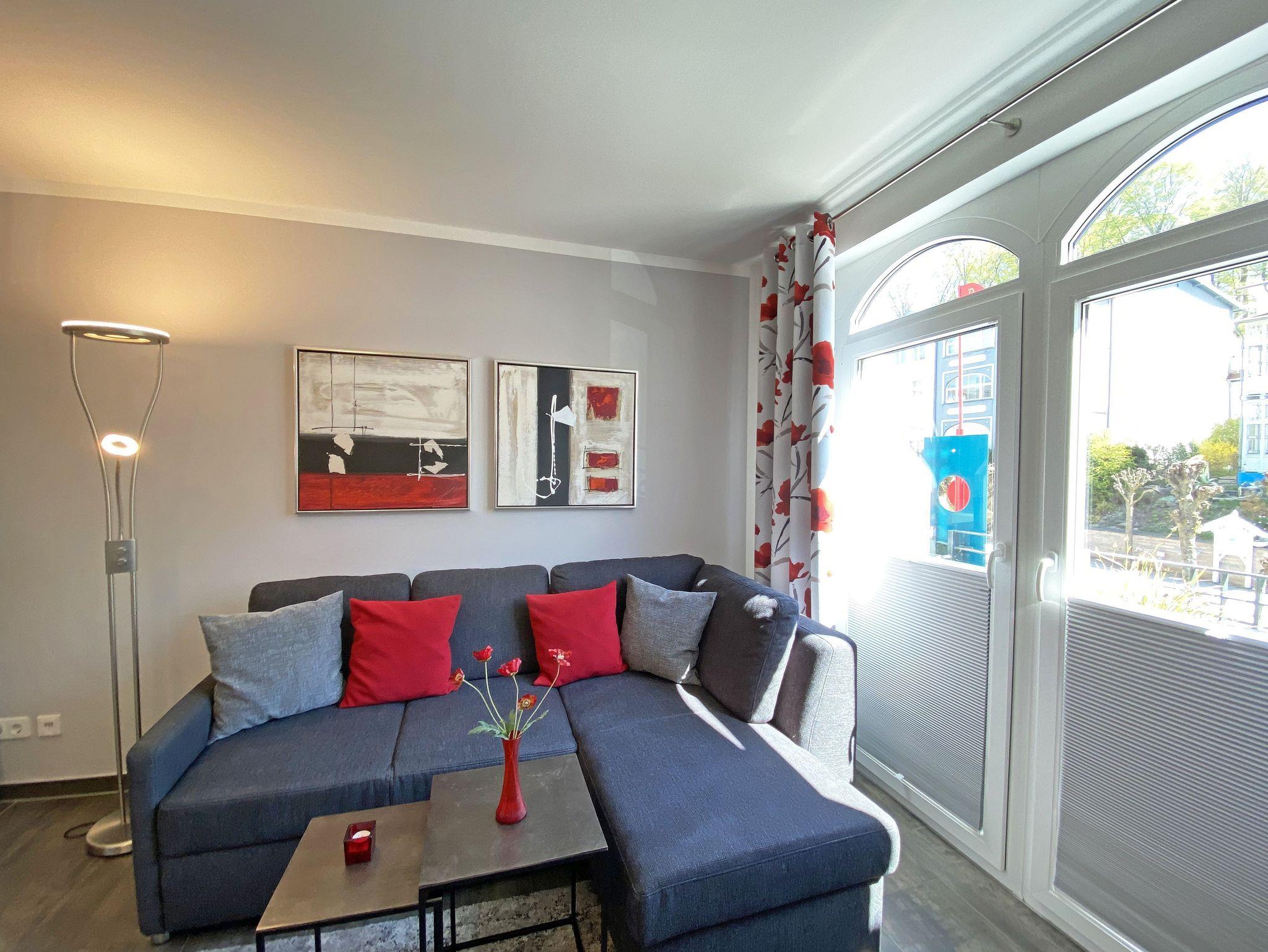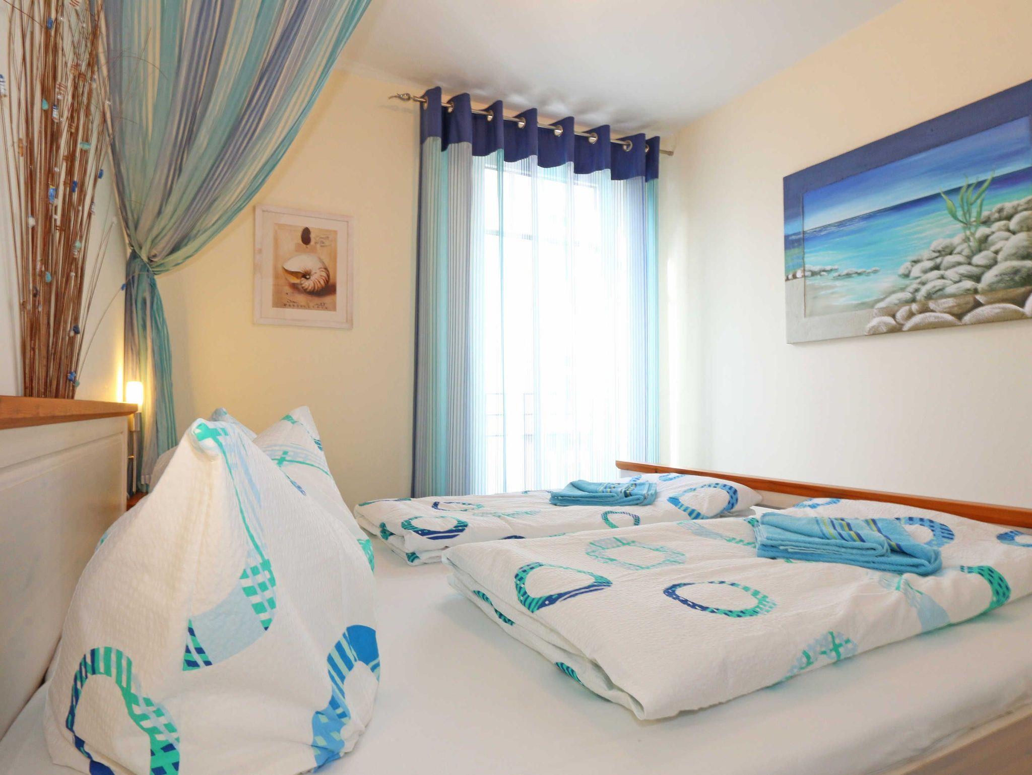 Die modern und hochwertig eingerichtete Nichtraucherwohnung befindet sich im 1. Obergeschoss. Sie umfasst ca. 45 qm und bietet für max. 2 Personen ausreichend Platz. Von der hauseigenen Tiefgarage gelangen Sie bequem mit dem Fahrstuhl direkt zur Wohnung. Der helle Wohnbereich bietet Ihnen eine bequeme Eckcouch mit Sessel, Couchtisch, Leselampe und sorgt so für eine angenehme Wohlfühlatmosphäre. Ein Smart-TV, Stereo-Anlage mit CD- und DVD-Player sowie eine Auswahl an Urlaubslektüre und verschiedene Gesellschaftsspiele bieten Ihnen eine abwechslungsreiche Unterhaltung. Eine WLAN-Verbindung steht Ihnen inklusive zur Verfügung. Die offene und helle Küchenzeile mit angrenzender Essecke ist mit hochwertigen Geräten wie einen 4-Zonen-Cerankochfeld mit Dunstabzugshaube, Backofen, Kühlschrank mit Gefrierfach, Geschirrspüler, Kombi-Mikrowelle, Kaffeemaschine, Wasserkocher, Toaster, Eierkocher sowie diversen Küchenutensilien ausgestattet. Ein überdachter, nach Süd-Ost, ausgerichteter Balkon mit Bestuhlung und Sonnenschirm erreichen Sie vom Wohnbereich. Das Schlafzimmer verfügt über ein Doppelbett (1,80 m x 2,00 m) mit 7-Zonen-Kaltschaummatratzen und verstellbaren Lattenrosten, Nachttischablagen und einem geräumigen Kleiderschrank. Für einen angenehmen Schlaf sorgt das Verdunkelungsrollo. Im Badezimmer befindet sich neben der runden und bodenebenen Glasdusche ein WC, ein beheizbarer Handtuchhalter, Fön, Kosmetikspiegel sowie ein moderner Waschplatz mit Beleuchtung. Bis auf das Schlafzimmer sind alle Böden gefliest und verfügen über eine Fußbodenheizung für angenehme Wärme. Ein Stellplatz (Nr. 02) ist direkt für Sie in der Tiefgarage (Einfahrtshöhe 2,00m) reserviert. Der Stellplatz (Doppelparker) ist für ein Auto bis 1,80 m Höhe und einer Länge bis 5,00 m geeignet (Gewicht bis 2 Tonnen). Waschmaschine und Trockner können im Untergeschoss gegen Extragebühr genutzt werden. Ein separater Fahrradunterstand ist auf dem Hintergrundstück durch einen kleinen Fußweg erreichbar. Für einen kurzen Weg zum Brötchenholen sorgt der im Haus zu findende Bäcker. Haustiere sind nicht erlaubt. Die Erstausstattung eines Wäschepaketes (komplette Bettwäsche, 1 Duschhandtuch, 2 kleine Handtücher) können Sie bis 14 Tage vor Anreise gegen einen Aufpreis dazu buchen oder durch eigene ergänzen. Ab 2 gebuchten Paketen erhalten Sie einmalig 1 Geschirrhandtuch und 1 Duschvorleger dazu.