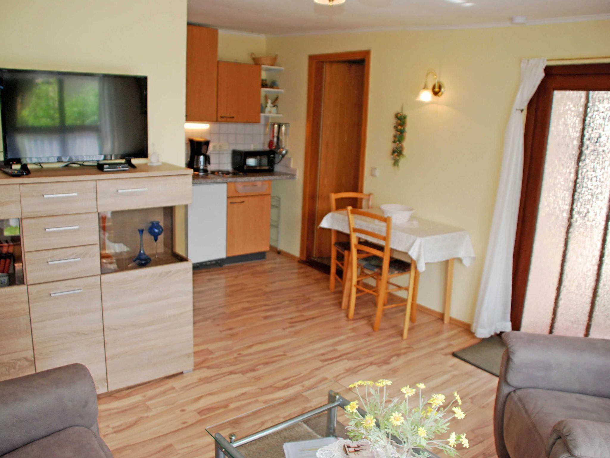 Das kleine Ferienhaus Charlotte ist ca. 35 qm groß und für max. 2 Personen. Im Wohnraum befinden sich eine bequeme Sitzcouch mit Tisch und ein TV-Gerät. Hier steht auch ein Esstisch mit Stühlen. Die moderne Küchenzeile ist mit einem Herd, Minibackofen, Wasserkocher, Kaffeemaschine, Toaster und Kühlschrank mit kleinem Gefrierfach komplett ausgestattet. Im Schlafzimmer steht ein Doppelbetten mit Nachttischen und Leselampen sowie Kleiderschrank.