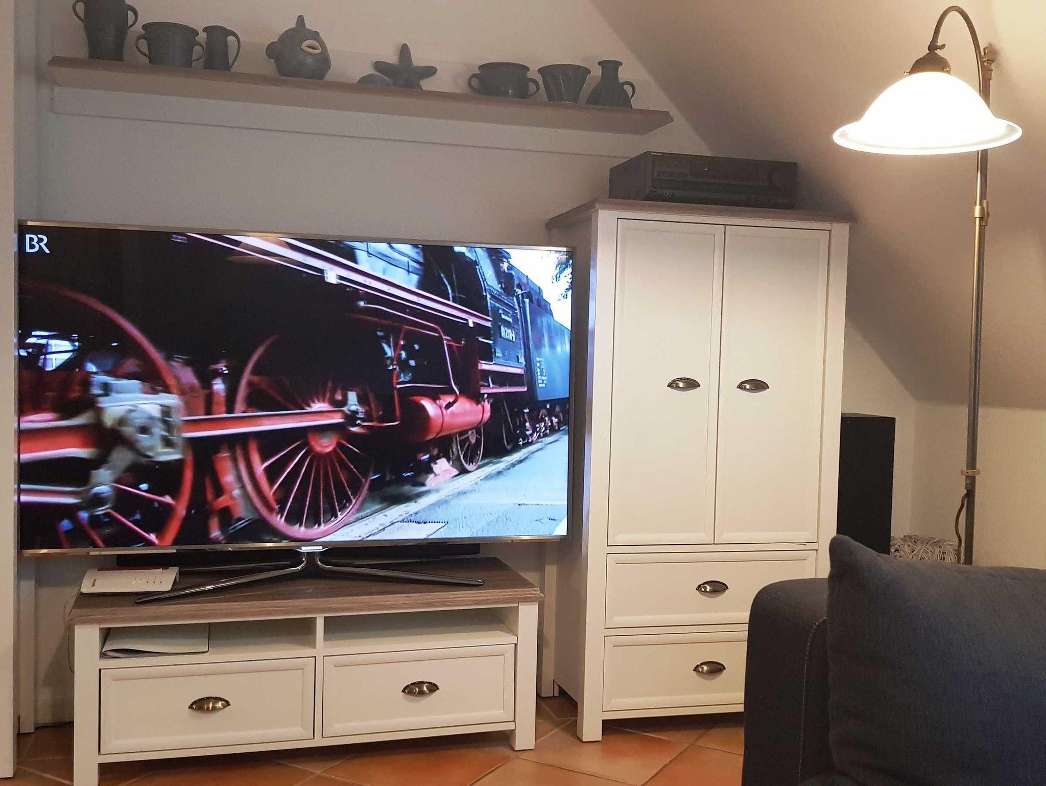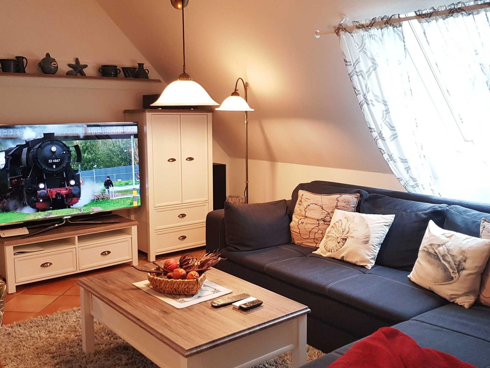 Das helle und modern eingerichtete Wohnzimmer ist mit einem TV und einer Schlafcouch ausgestattet. Hier bietet sich eine optimale zusätzliche Aufbettung für bis zu 2 Personen.