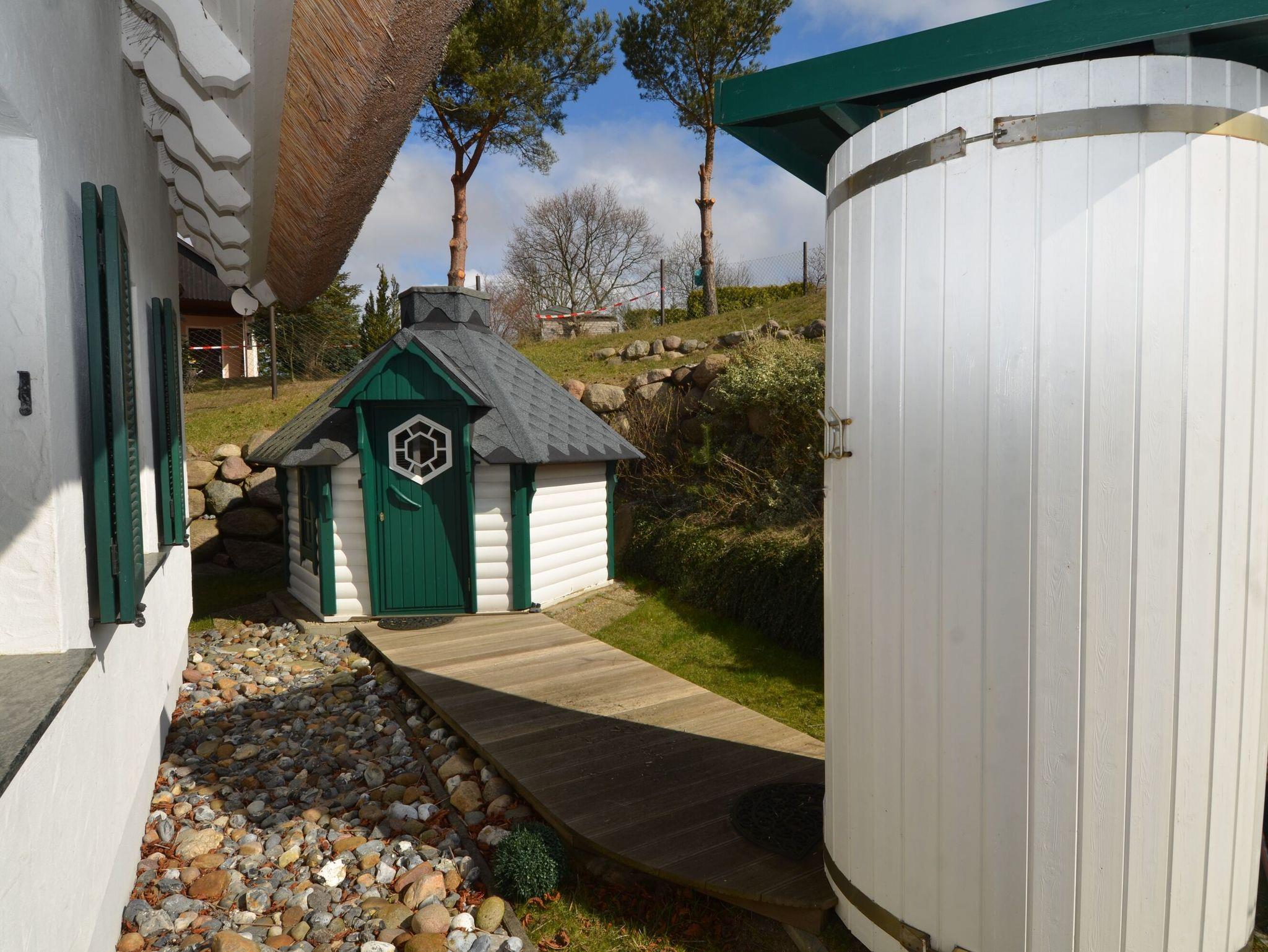 Zum Haus gehören ebenfalls ein Saunahäuschen im Garten (Nutzung gegen kleine Gebühr) und drei kostenfreie PKW-Stellplätze.