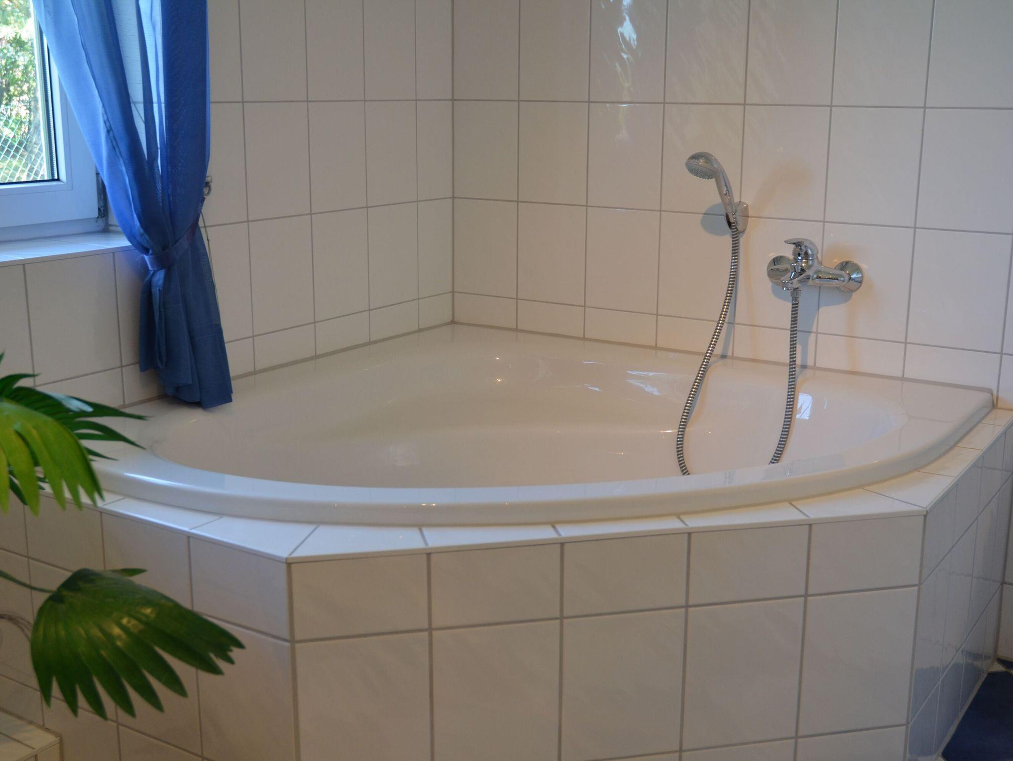 Das Badezimmer ist mit einer Eckbadewanne, einer Dusche, WC und einem Doppelwaschbecken ausgestattet. Außerdem gibt es ein separates Gäste-WC.