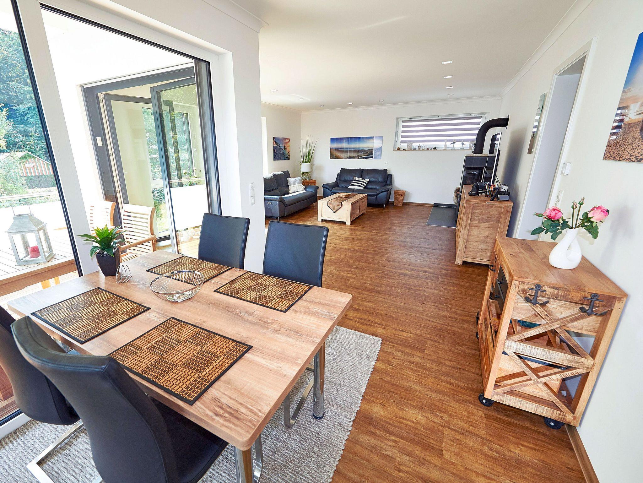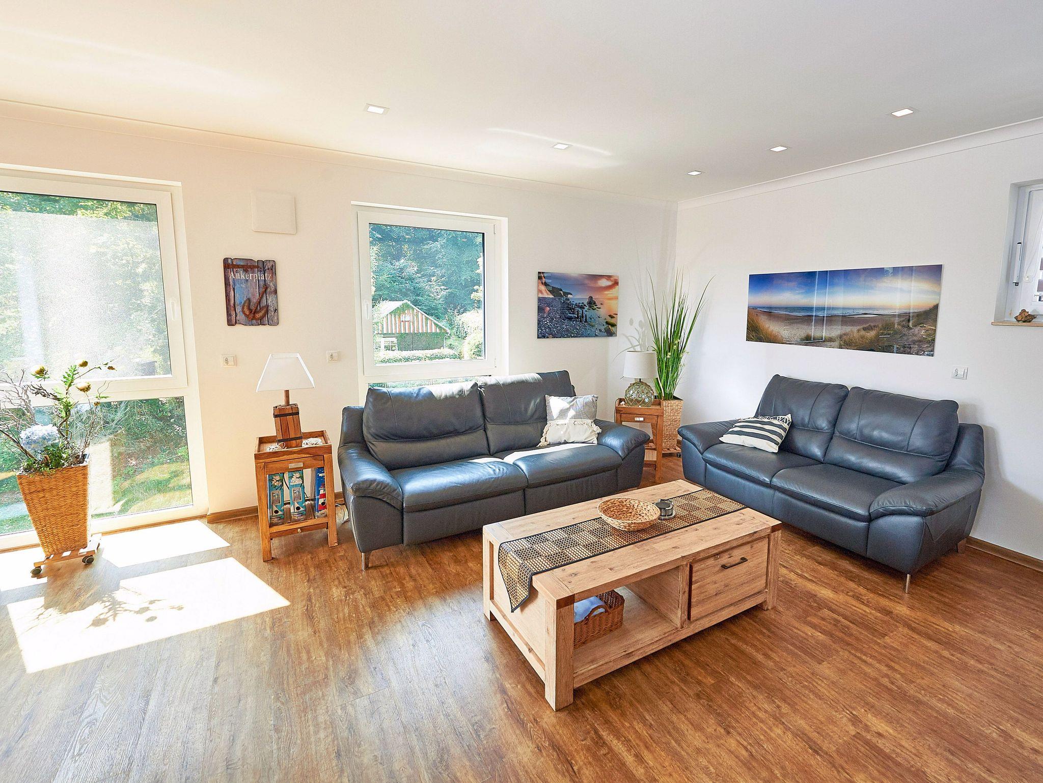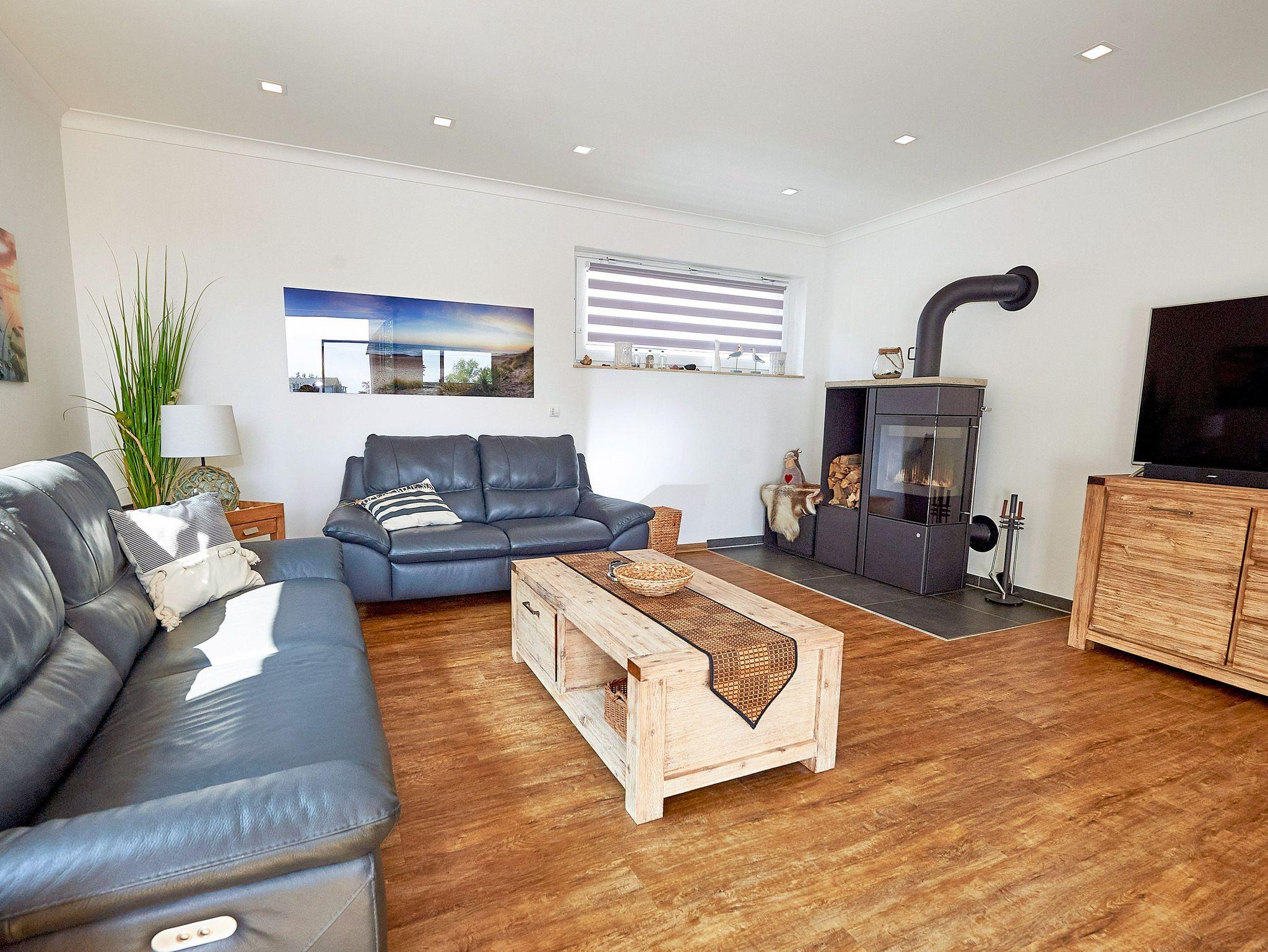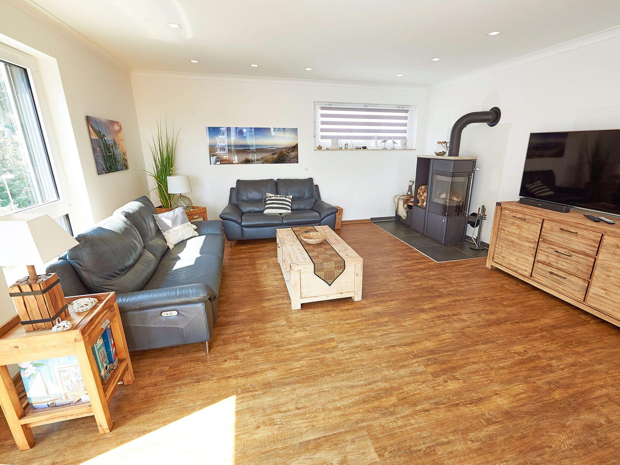 Der Wohn- und Essbereich (ca. 44m²) ist mit einer bequemen Ledersitzgruppe und einem 58 UHD SMART-TV ausgestattet.