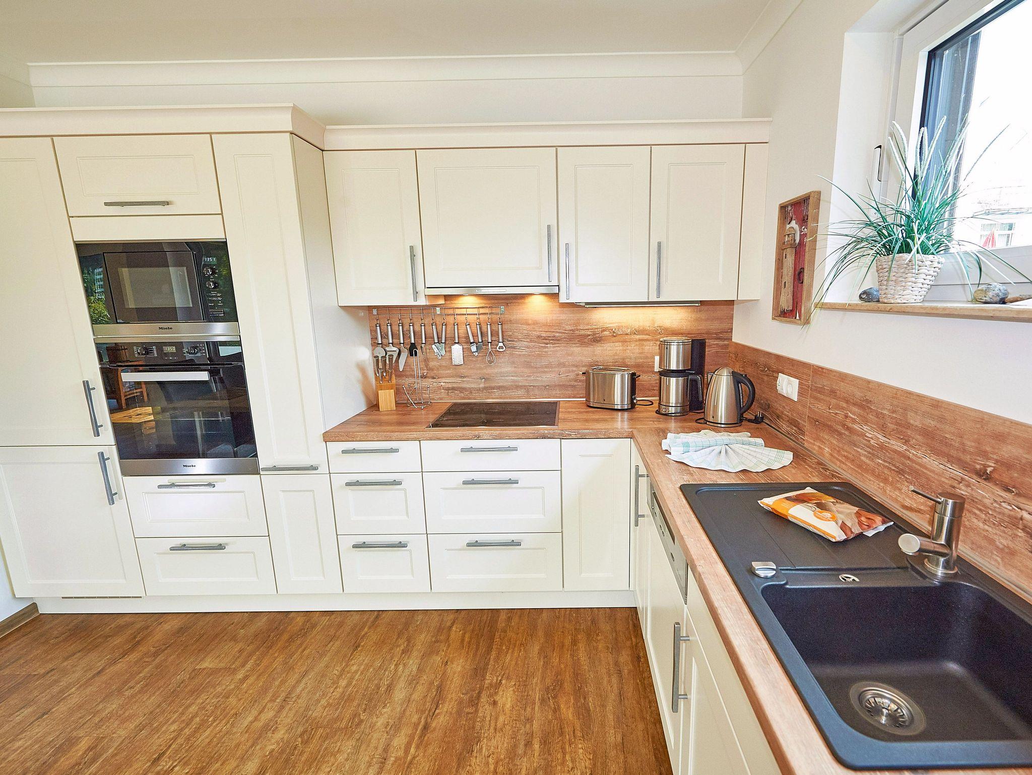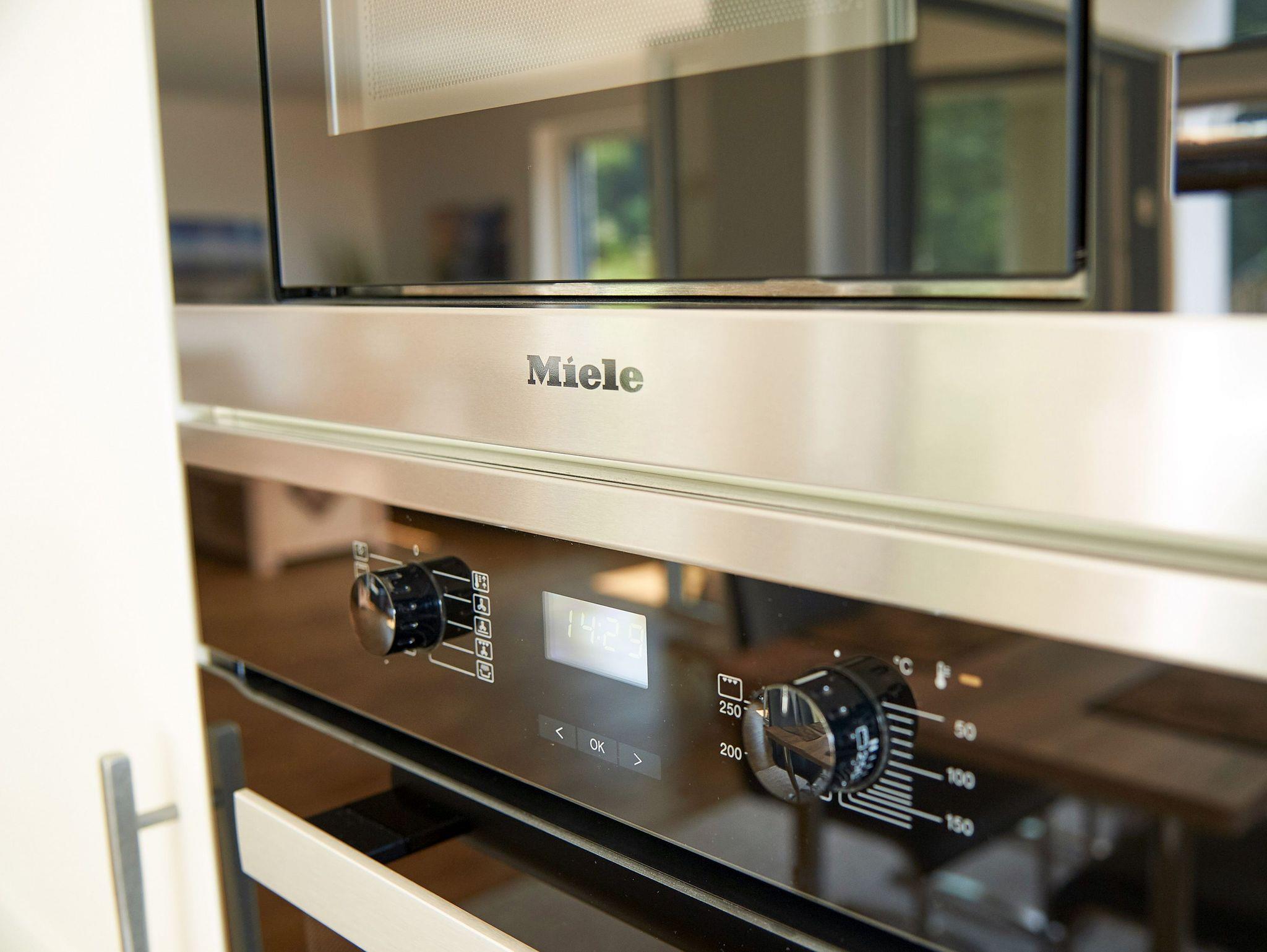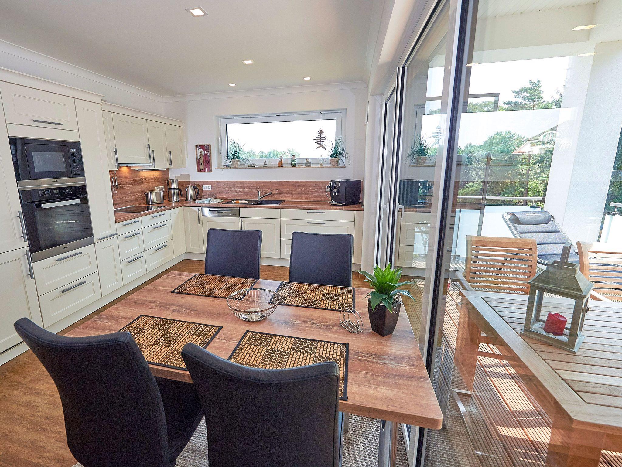 Der in den Wohnraum integrierte Küchenbereich mit separatem Esstisch überzeugt mit hochwertigen Geräten. Backofen, Mikrowelle, 4-Platten-Ceranfeld, Spülmaschine und Kühl-/Gefrierkombination von MIELE sowie diverse Kleingeräte (Toaster, Wasserkocher, Eierkocher) komplettieren die Küchenausstattung.