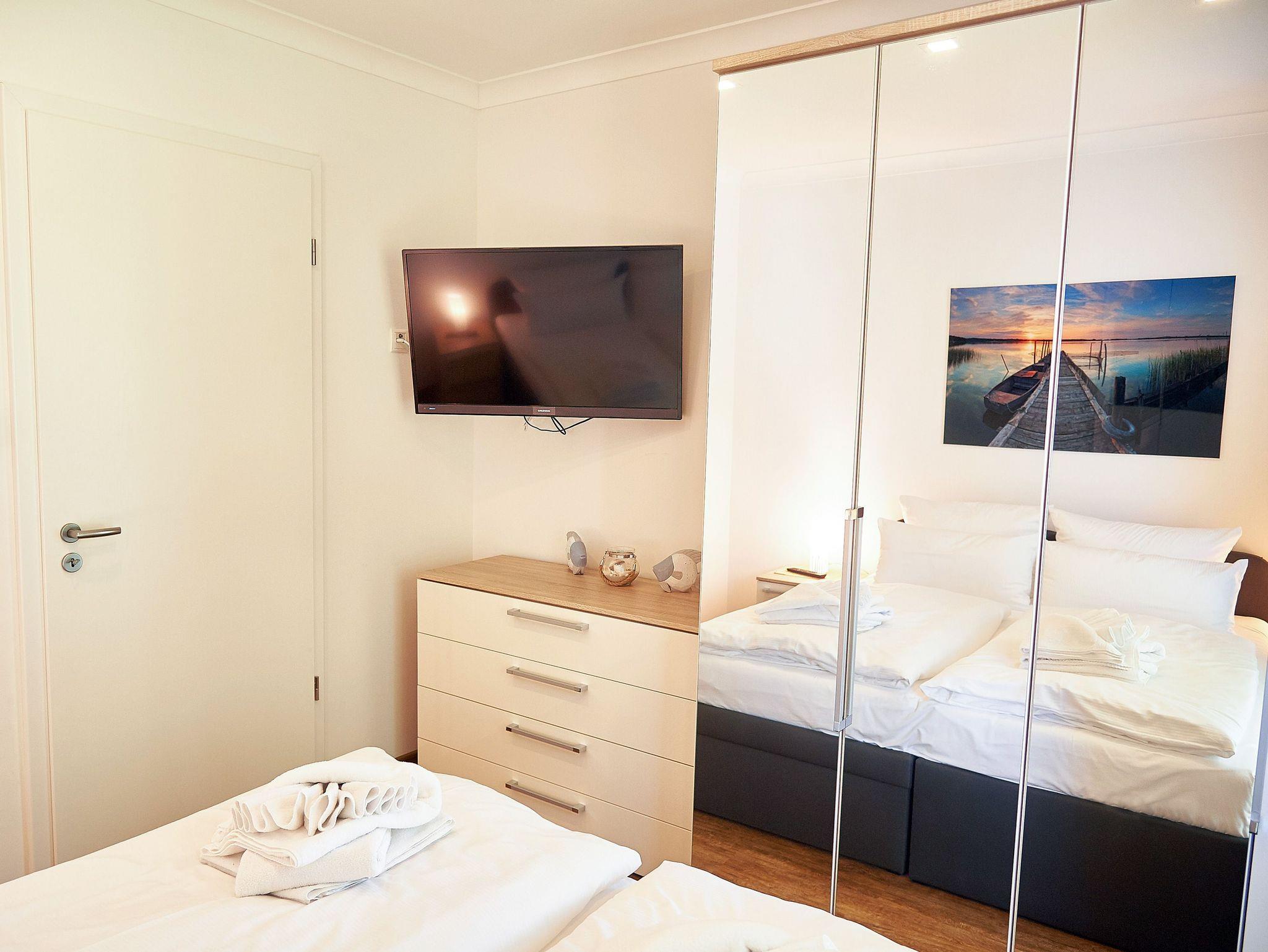 Beide Schlafzimmer sind mit Doppelbetten ausgestattet. Sie verfügen jeweils über einen eigenen HD-TV und Kleiderschränke für Ihre Urlaubsgarderobe.