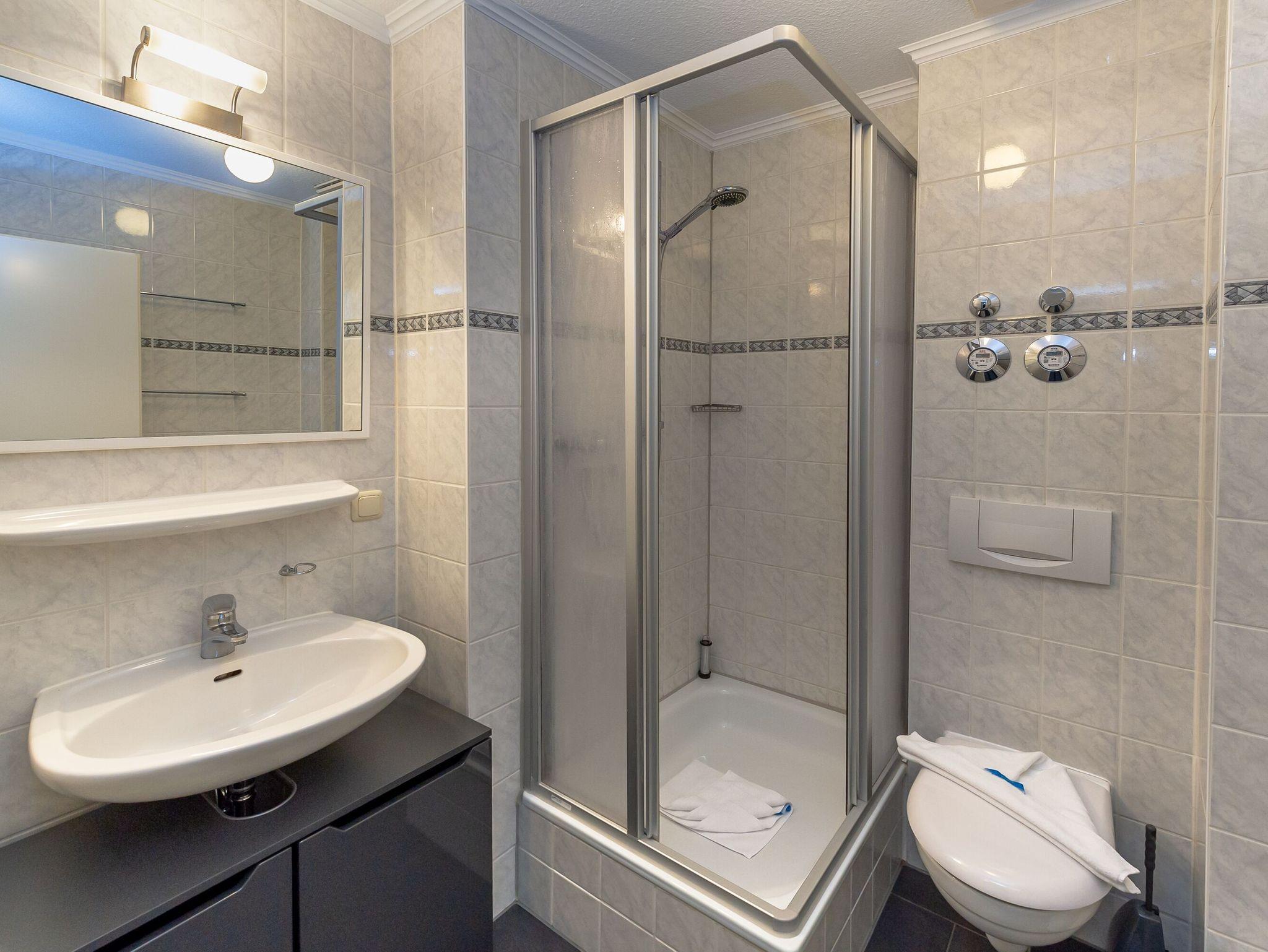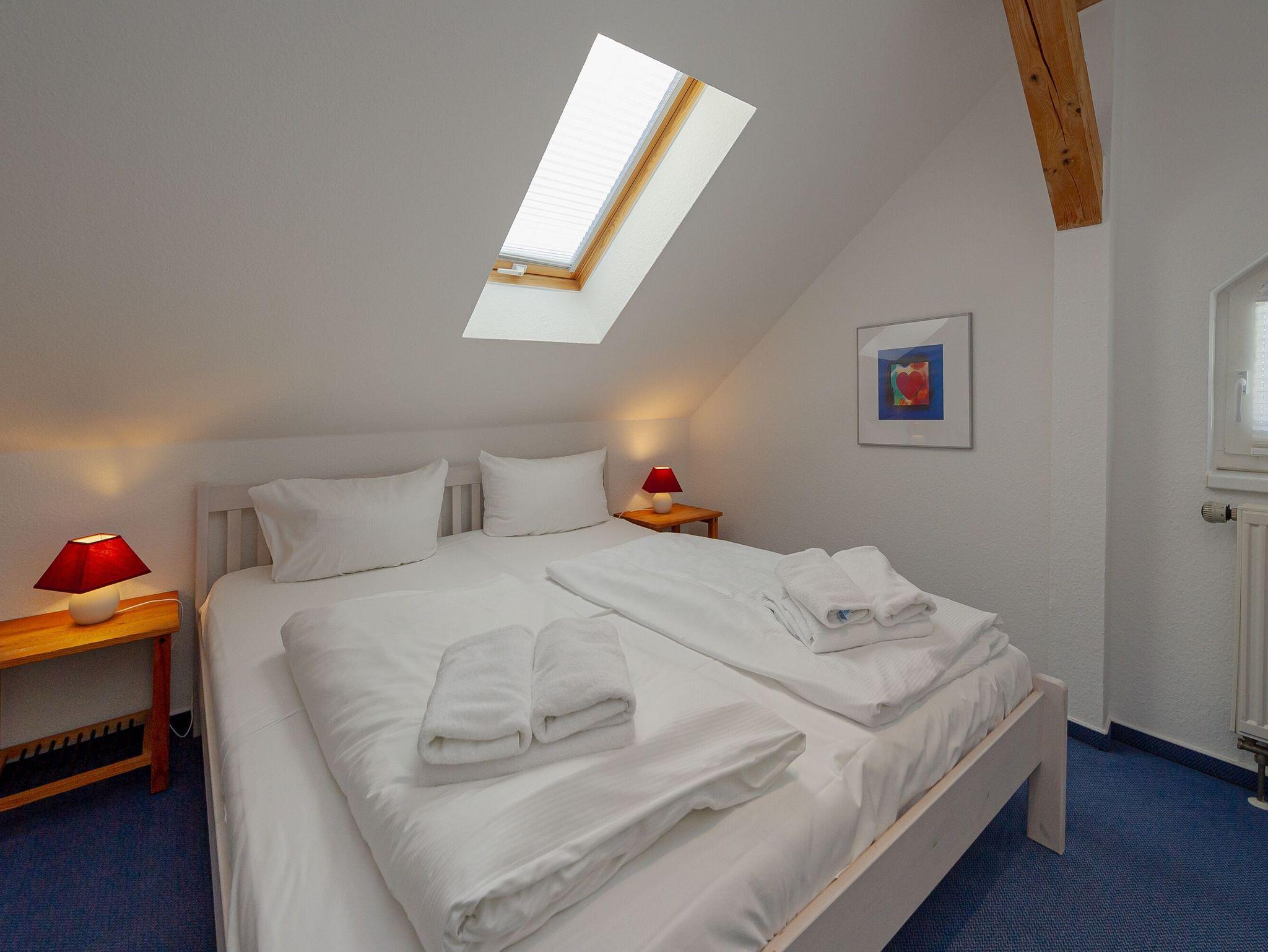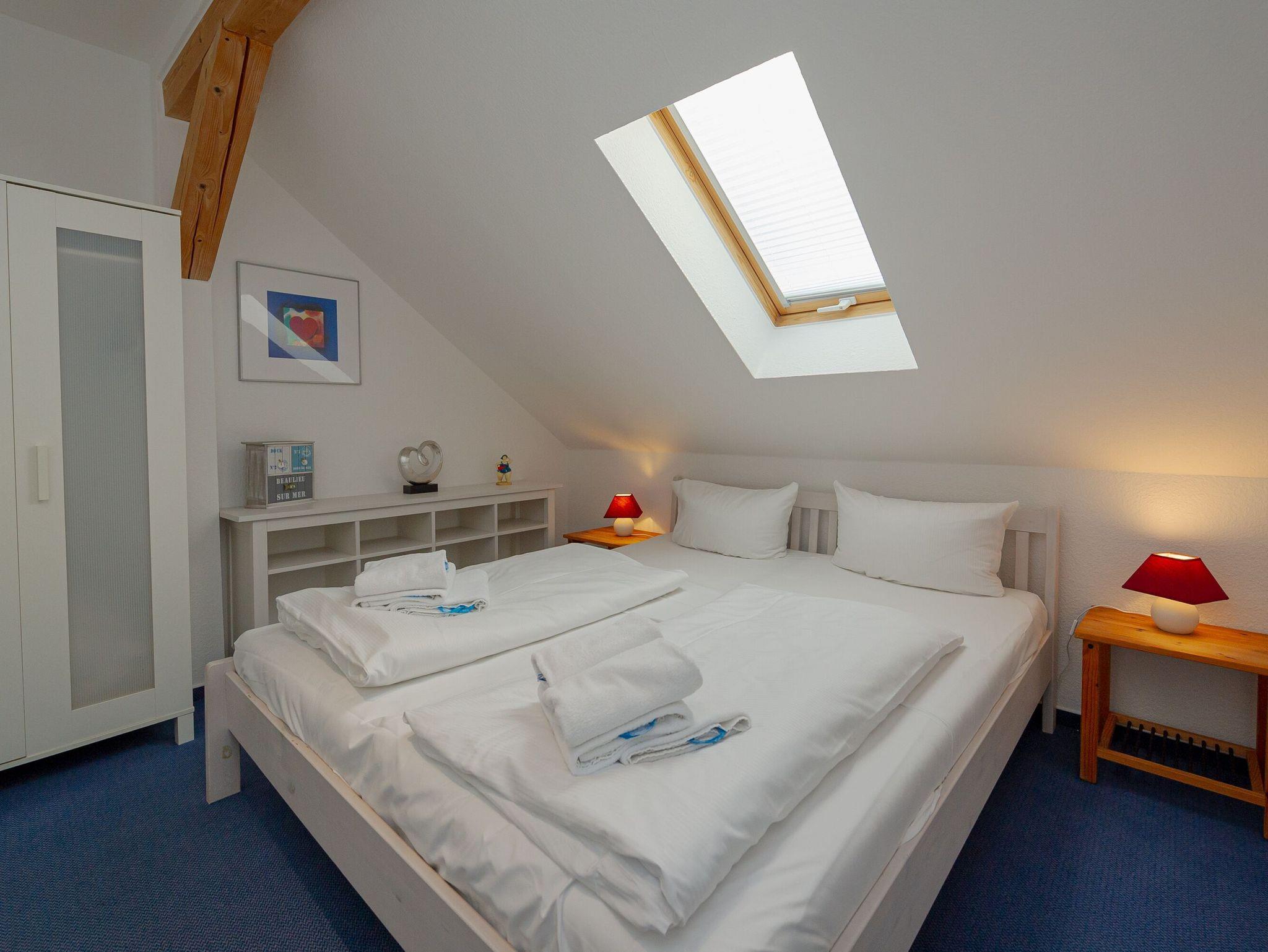 Das Schlafzimmer verfügt über ein bequemes Doppelbett (1,80 x 2,00 m) und ausreichend Stauraum für Kleidung. Zudem gibt es ein modernes Badezimmer mit Dusche/WC, Waschbecken, Spiegel und Fön.