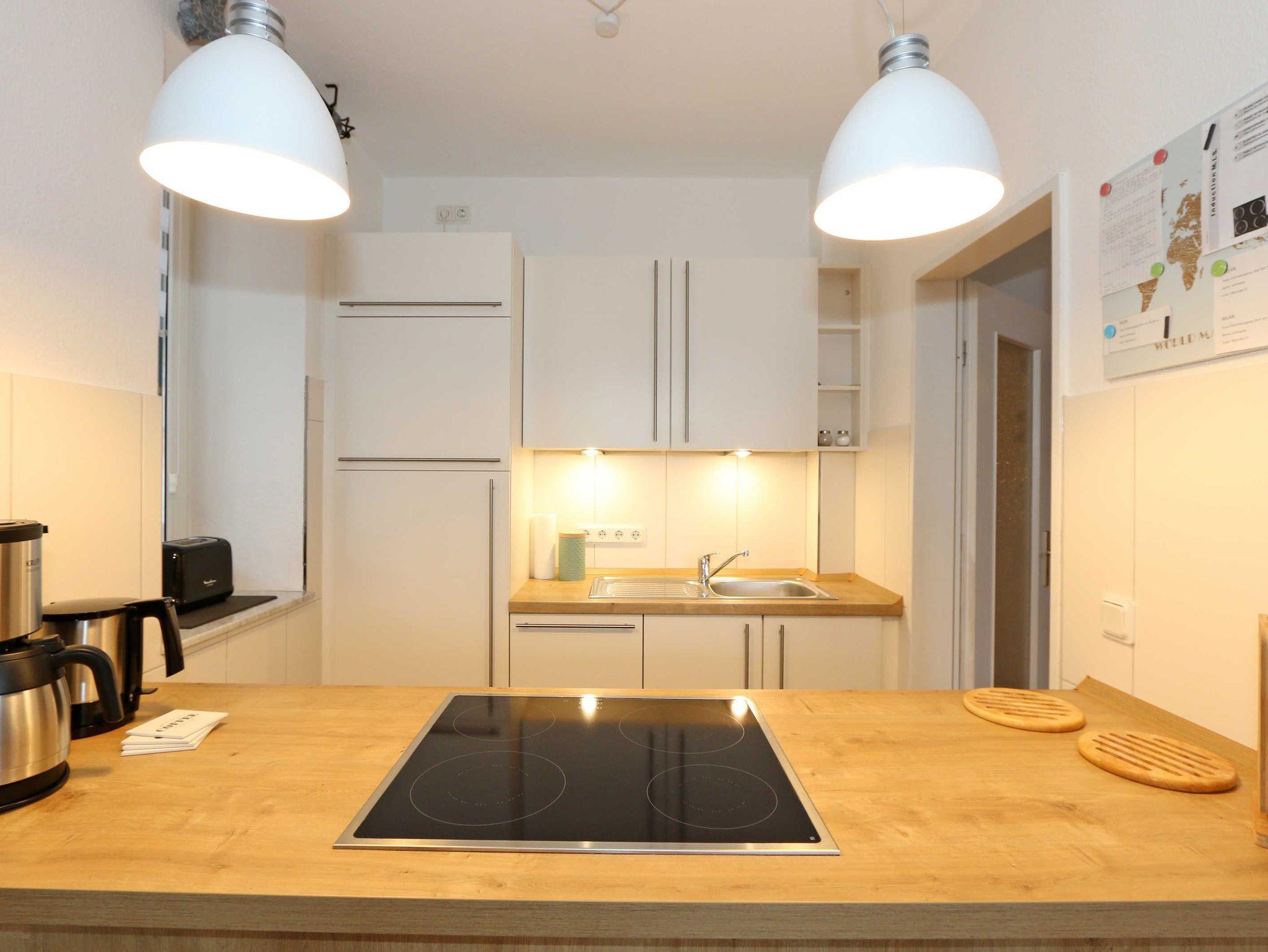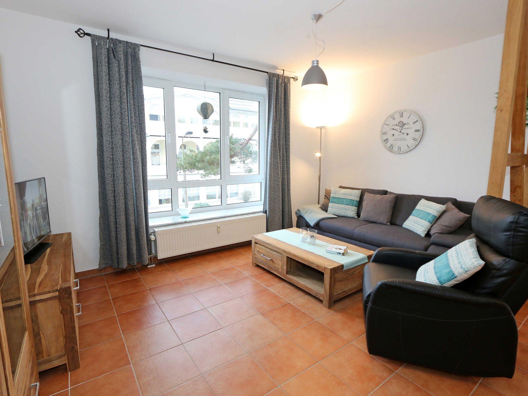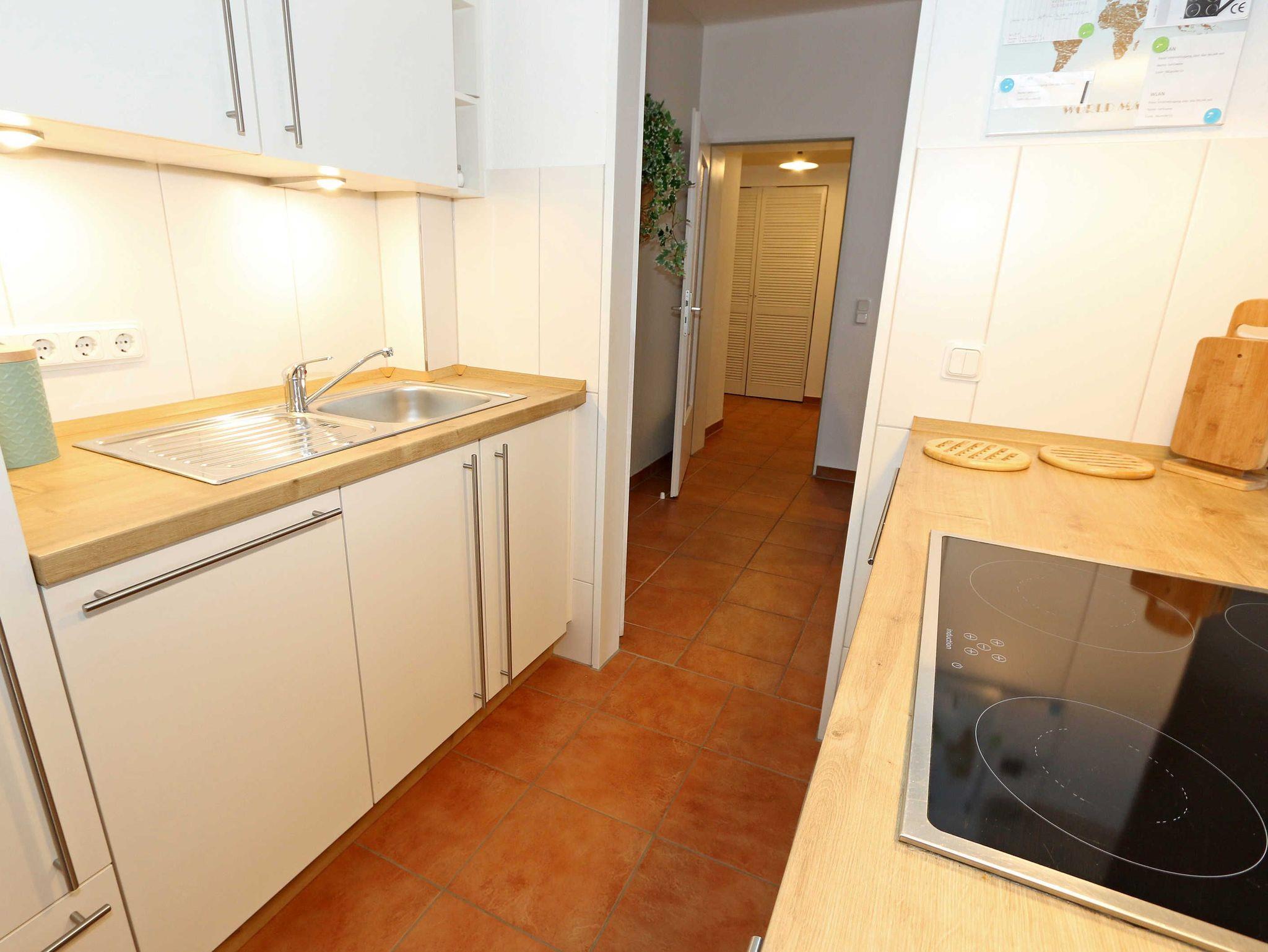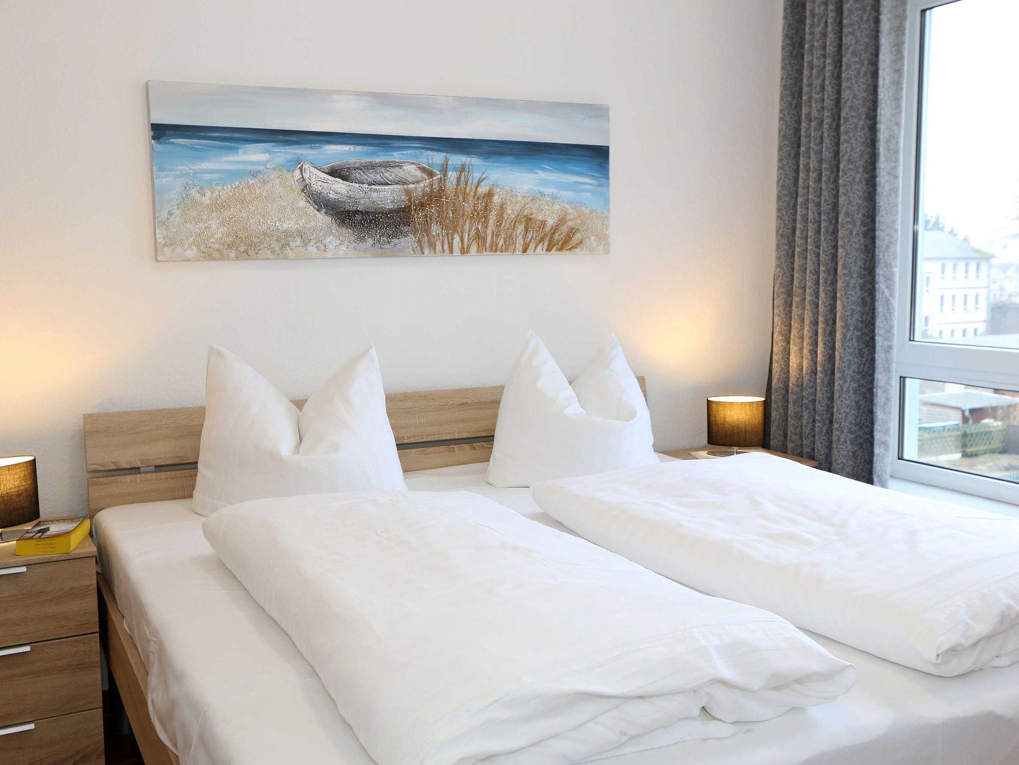 Die ausgestattete 2-Raum-Nichtraucher-Wohnung im 1. OG des ?Haus Holstein? liegt am erweiterten Kurpark, direkt am Friedensberg mit hervorragender Wohnqualität und verfügt über ca. 63 qm Wohnfläche. Der geräumige Flur ist mit einer Garderobe sowie einem integrierten Abstellraum ausgestattet. Der 13 qm große und überdachte Balkon (Süden) mit Komfort-Bestuhlung und Sonnenliege ist vom Wohnbereich aus begehbar. Die Wohnung ist für 2 bis max. 4 Erwachsene ausgestattet und besteht aus einem Wohnbereich mit einer Couch (Aufbettung für 3./4. Person, 1,50 m x 2,00 m), massivem Couchtisch, einem Funktions-Sessel, einer Stehlampe sowie einer Vitrine. Der technische Bereich wird durch einen LED-TV, einen DVD-Player, einer Mini-Stereo-Anlage mit Bluetooth und USB-Anschluss sowie Internet (WLAN) abgerundet. Der Internetzugang (WLAN) ist für Sie inklusive. Die großzügige Essecke umfasst einen massiven Vollholz-Tisch und vier dazugehörige Stühle. Die angrenzende und offene Küchenzeile bietet Ihnen einen Kühlschrank mit Gefrierfach, einen Backofen mit 4 Zonen Induktionskochfeld, einen Geschirrspüler, einer Mikrowelle, einer Kaffeemaschine, einen Toaster, einen Eierkocher, einen Handmixer, einen Wasserkocher sowie viele kleine Küchenutensilien. Im Schlafzimmer befindet sich ein Doppelbett (1,80 m x 2,00 m) mit einer Komforthöhe über 60 cm, Kaltschaum-Wendematratzen H2/H3, zwei Nachttischablagen und einen großen Kleiderschrank. Ein großer Ganzkörperspiegel rundet den Raum ab. Das innenliegende Bad ist mit einem Waschplatz mit beleuchtetem Spiegel, einer Dusche mit flachem Einstieg, Fön, WC, Handtuchhalter sowie einer Waschmaschine versehen. Im Abstellraum finden Sie kleine Helfer wie einen Staubsauger, ein Bügeleisen mit Bügelbrett und einen Wäscheständer für den Balkon. Alle Räumlichkeiten sind in der Wohnung gefliest und haben jeweils ein Insektenschutzgitter. Haustiere sind nicht erlaubt. Ein überdachter PKW-Stellplatz Nr. 12 (max. 2 m Höhe) befindet sich direkt unterm Haus. Im Gemeinschaftskeller stehen Ihnen eine Münzwaschmaschine und ein Münztrockner zur Verfügung. Abstellmöglichkeiten für Fahrräder sind gegeben. Die Erstausstattung eines Wäschepaketes (komplette Bettwäsche, 1 Duschhandtuch, 1 kleines Handtuch) können Sie bis 14 Tage vor Anreise gegen einen Aufpreis dazu buchen oder durch eigene ergänzen. Ab 2 gebuchten Paketen erhalten Sie einmalig 1 Geschirrhandtuch und 1 Duschvorleger hinzu.