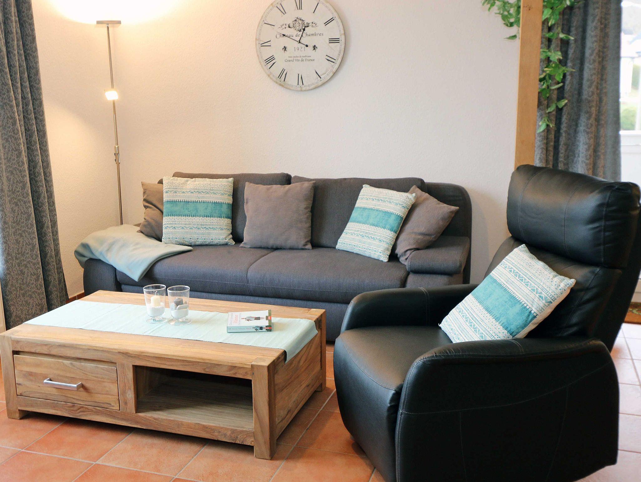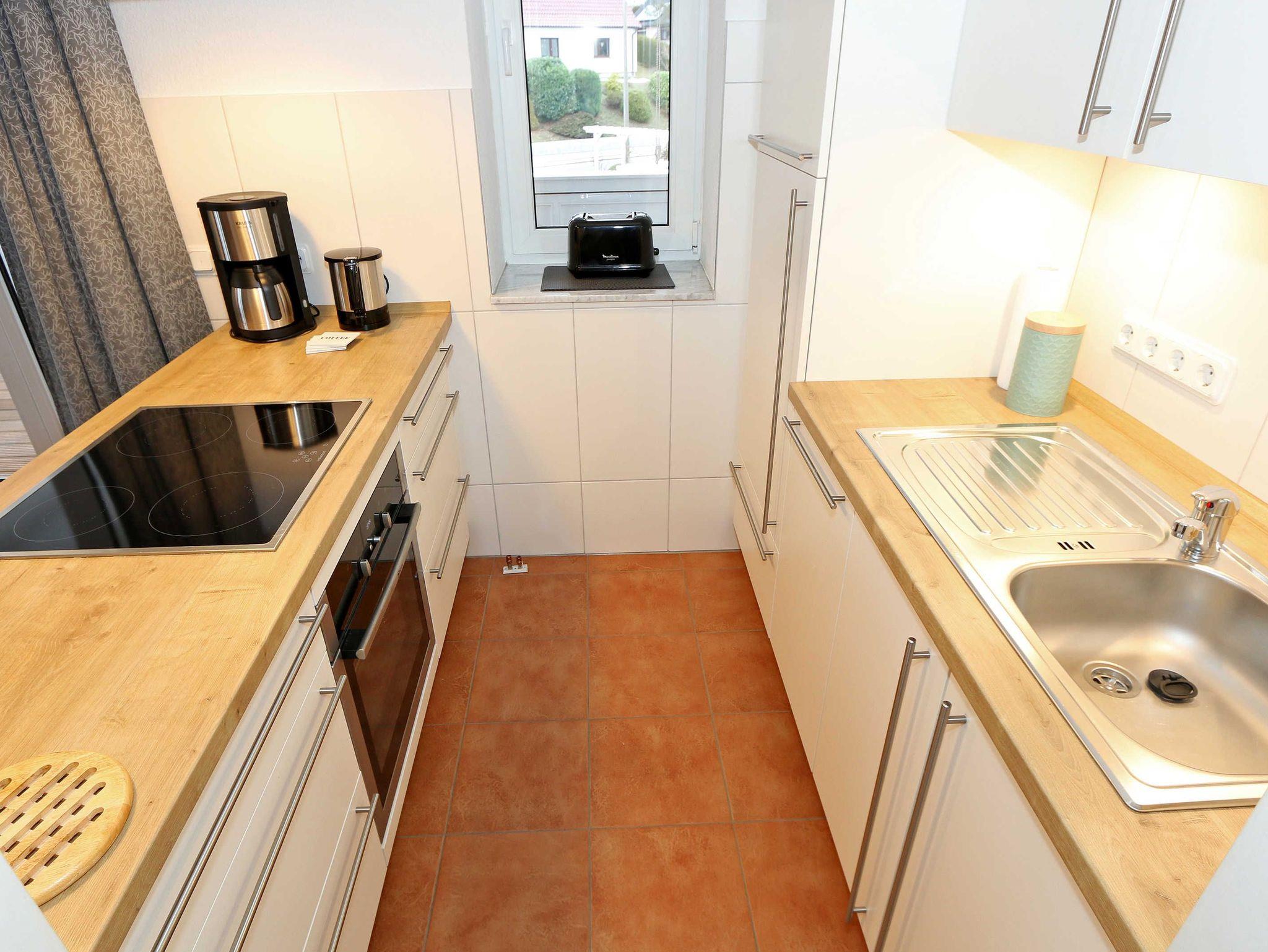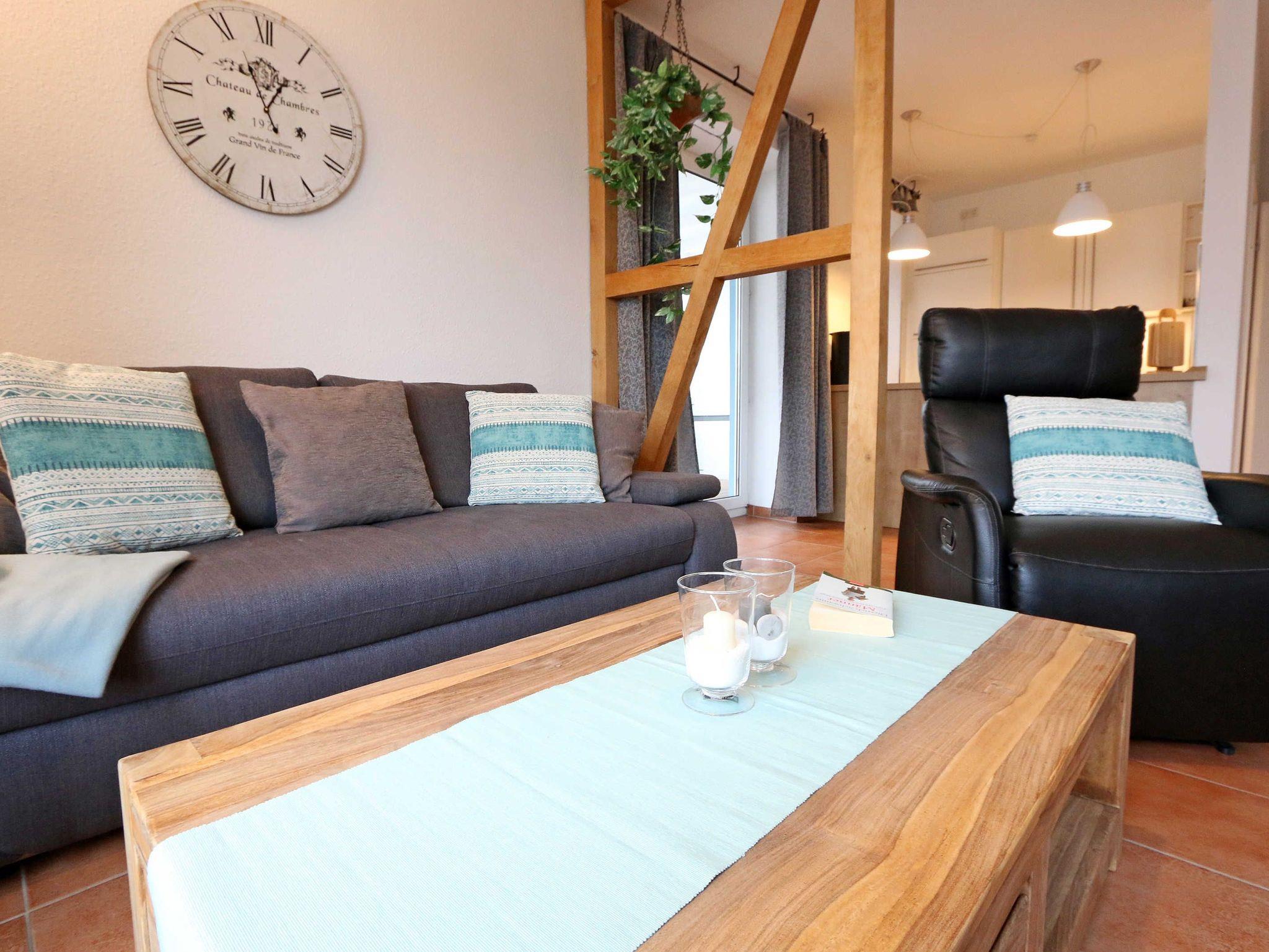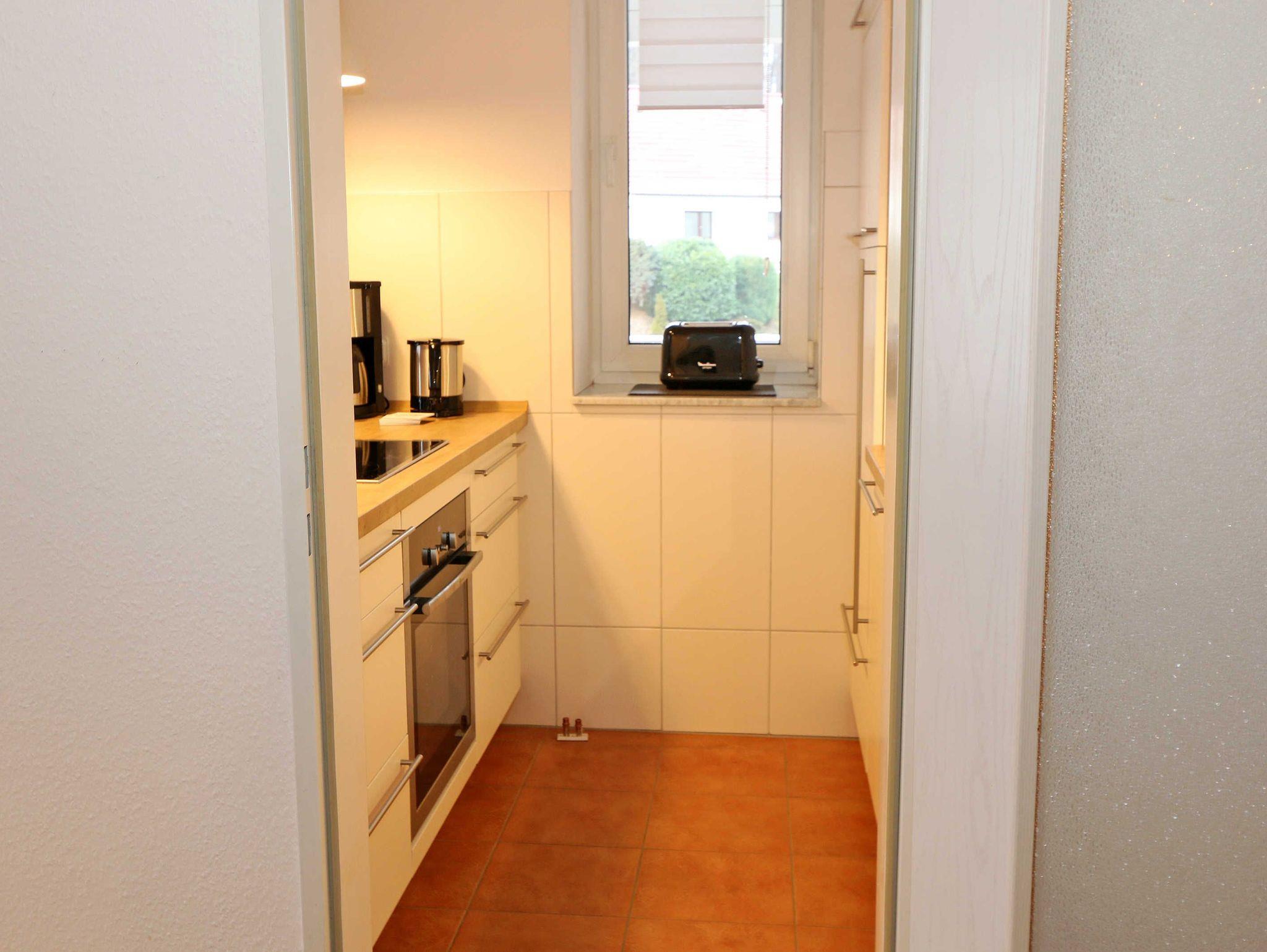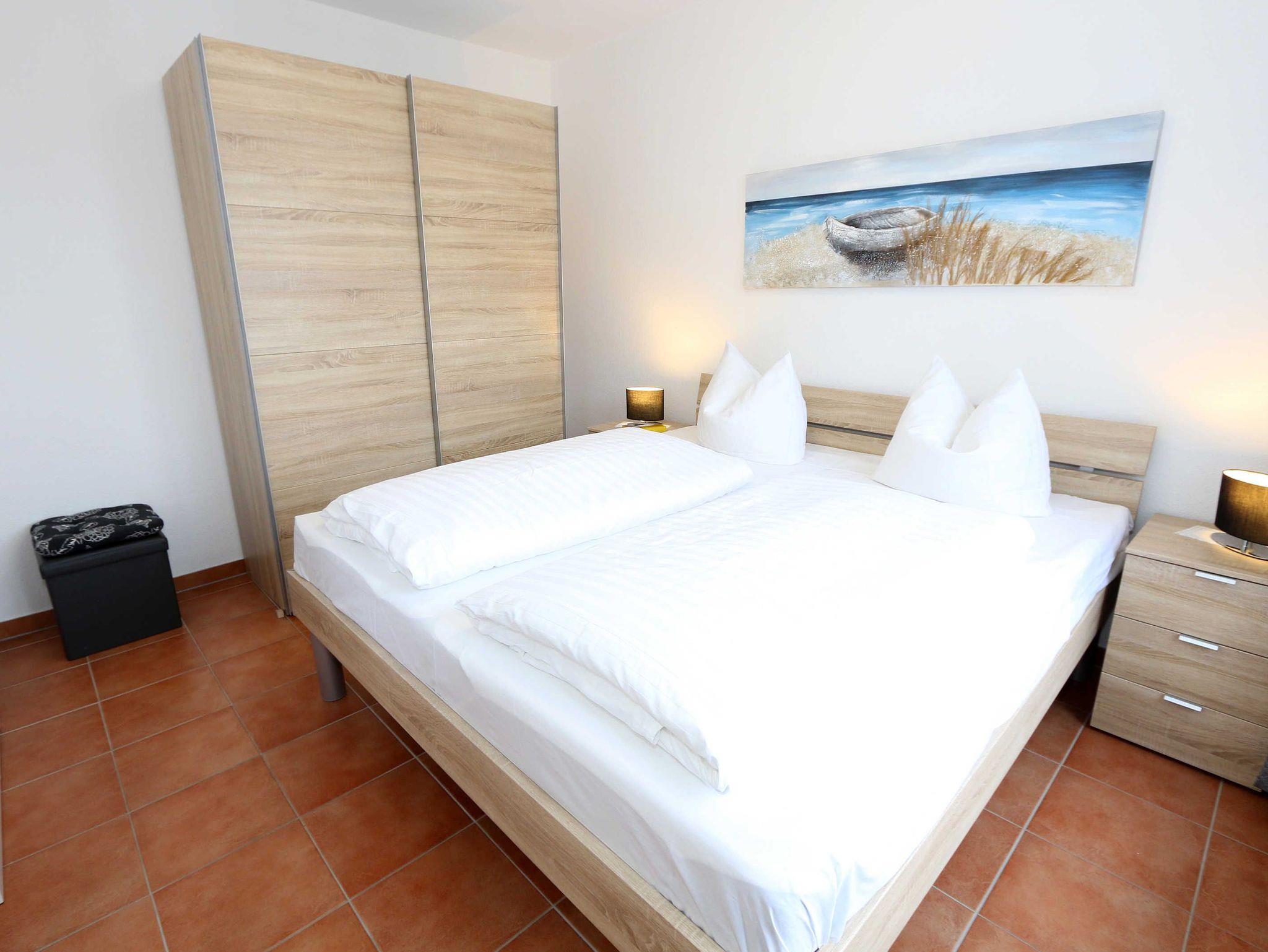 Die ausgestattete 2-Raum-Nichtraucher-Wohnung im 1. OG des ?Haus Holstein? liegt am erweiterten Kurpark, direkt am Friedensberg mit hervorragender Wohnqualität und verfügt über ca. 63 qm Wohnfläche. Der geräumige Flur ist mit einer Garderobe sowie einem integrierten Abstellraum ausgestattet. Der 13 qm große und überdachte Balkon (Süden) mit Komfort-Bestuhlung und Sonnenliege ist vom Wohnbereich aus begehbar. Die Wohnung ist für 2 bis max. 4 Erwachsene ausgestattet und besteht aus einem Wohnbereich mit einer Couch (Aufbettung für 3./4. Person, 1,50 m x 2,00 m), massivem Couchtisch, einem Funktions-Sessel, einer Stehlampe sowie einer Vitrine. Der technische Bereich wird durch einen LED-TV, einen DVD-Player, einer Mini-Stereo-Anlage mit Bluetooth und USB-Anschluss sowie Internet (WLAN) abgerundet. Der Internetzugang (WLAN) ist für Sie inklusive. Die großzügige Essecke umfasst einen massiven Vollholz-Tisch und vier dazugehörige Stühle. Die angrenzende und offene Küchenzeile bietet Ihnen einen Kühlschrank mit Gefrierfach, einen Backofen mit 4 Zonen Induktionskochfeld, einen Geschirrspüler, einer Mikrowelle, einer Kaffeemaschine, einen Toaster, einen Eierkocher, einen Handmixer, einen Wasserkocher sowie viele kleine Küchenutensilien. Im Schlafzimmer befindet sich ein Doppelbett (1,80 m x 2,00 m) mit einer Komforthöhe über 60 cm, Kaltschaum-Wendematratzen H2/H3, zwei Nachttischablagen und einen großen Kleiderschrank. Ein großer Ganzkörperspiegel rundet den Raum ab. Das innenliegende Bad ist mit einem Waschplatz mit beleuchtetem Spiegel, einer Dusche mit flachem Einstieg, Fön, WC, Handtuchhalter sowie einer Waschmaschine versehen. Im Abstellraum finden Sie kleine Helfer wie einen Staubsauger, ein Bügeleisen mit Bügelbrett und einen Wäscheständer für den Balkon. Alle Räumlichkeiten sind in der Wohnung gefliest und haben jeweils ein Insektenschutzgitter. Haustiere sind nicht erlaubt. Ein überdachter PKW-Stellplatz Nr. 12 (max. 2 m Höhe) befindet sich direkt unterm Haus. Im Gemeinschaftskeller stehen Ihnen eine Münzwaschmaschine und ein Münztrockner zur Verfügung. Abstellmöglichkeiten für Fahrräder sind gegeben. Die Erstausstattung eines Wäschepaketes (komplette Bettwäsche, 1 Duschhandtuch, 1 kleines Handtuch) können Sie bis 14 Tage vor Anreise gegen einen Aufpreis dazu buchen oder durch eigene ergänzen. Ab 2 gebuchten Paketen erhalten Sie einmalig 1 Geschirrhandtuch und 1 Duschvorleger hinzu.