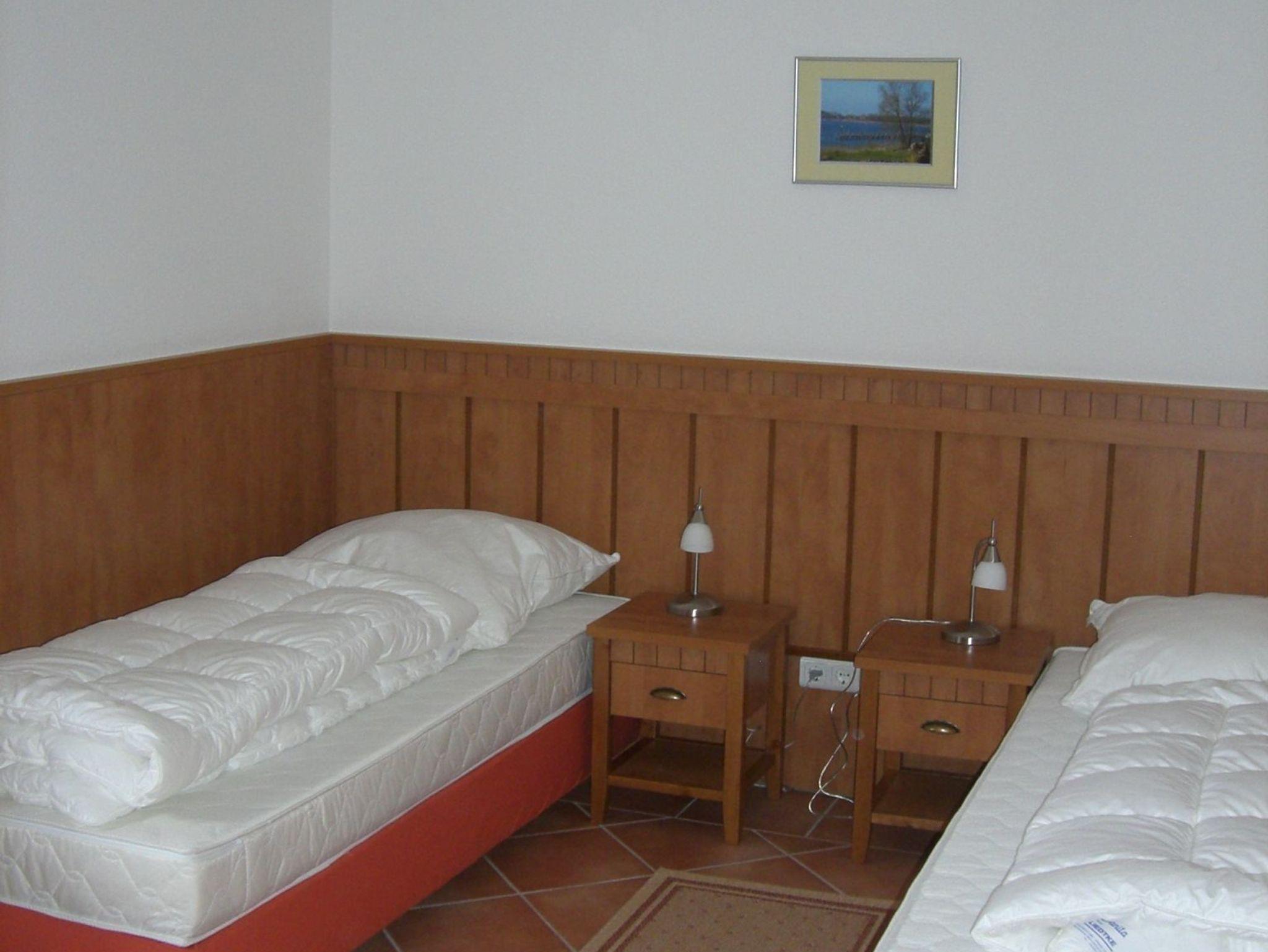 Die Nichtraucherwohnung mit ca. 77 qm besticht durch ihre komfortable Raumaufteilung. Die im Erdgeschoss liegende Ferienwohnung Nr. 7 bietet ausreichend Platz für 2-4 Personen + 2 Kinder bis 17 Jahre. Im Wohnbereich wird die Unterhaltungstechnik durch Gesellschaftsspiele, einen modernen 47 Zoll LCD-TV und ein CD bzw. DVD-Player abgerundet. Auch im Urlaub müssen Sie nicht auf einen Internetanschluss (W-LAN) verzichten. Dieser ist für Sie inklusive. Für die Gemütlichkeit wurde der Wohnbereich mit Massivmöbeln, Stehlampe, zwei Schlafcouchen (Aufbettungsmöglichkeit für 5./6. Person) und einem Sessel ausgestattet. Die bestuhlte große Terrasse mit einem Sonnenschirm können Sie vom Wohnbereich erreichen. Sie lädt bei einem Glas Wein zum Entspannen mit Blick auf den Selliner See ein. Die offene Küche ist mit Spülmaschine, Mikrowelle, Ceranfeld, Backofen, Kühlschrank mit Gefrierfach, Wasserkocher, Toaster, Kaffeemaschine, Radio und diversen Küchenutensilien ausgestattet. Beim morgendlichen Frühstück bzw. bei anderen Mahlzeiten können Sie vom Esstisch aus den Blick auf den Selliner See genießen. Das 1. Schlafzimmer ist mit 2 Einzelbetten, die als Doppelbett (1,80 m x 2,00 m) gestellt sind, sowie Nachttischablagen mit Schublade, einem Kleiderschrank, einem Ganzkörperspiegel, einer Kofferablage und einem modernen31 Zoll LCD-TV ausgestattet. Das 2. Schlafzimmer verfügt über 2 Einzelbetten (0,90 m x 2,00 m), die als Doppelbett gestellt werden können, sowie Nachttischablagen mit Schublade, einen Ganzkörperspiegel und einen Kleiderschrank. Im Tageslichtbad stehen Ihnen eine Badewanne, eine separate Dusche, ein großer Waschtisch, ein Haartrockner, ein WC und diverse Ablagen zur Verfügung. Fensterläden und Vorhängen dienen zum Verdunkeln der Räumlichkeiten. Im Abstellraum der Wohnung finden Sie einen Wäscheständer (für das Trocknen von Strandhandtüchern auf der Terrasse), Spielsachen für den Strand sowie Reinigungsutensilien. Für unsere kleinen Gäste kann ein Kinderreisebett (ohne Matratze und Bettinlet) und/oder ein Hochstuhl auf Anfrage kostenlos bereit gestellt werden. Haustiere sind in dieser Ferienwohnung nicht erlaubt. Ein PKW-Stellplatz befindet sich direkt auf dem Grundstück. Ihre mitgebrachten oder geliehenen Fahrräder können Sie nach Verfügbarkeit im abschließbaren Fahrradraum unterstellen. Die Erstausstattung eines Wäschepaketes können Sie bis 14 Tage vor Anreise kostenpflichtig dazu buchen bzw. durch Eigenmitnahme ergänzen.