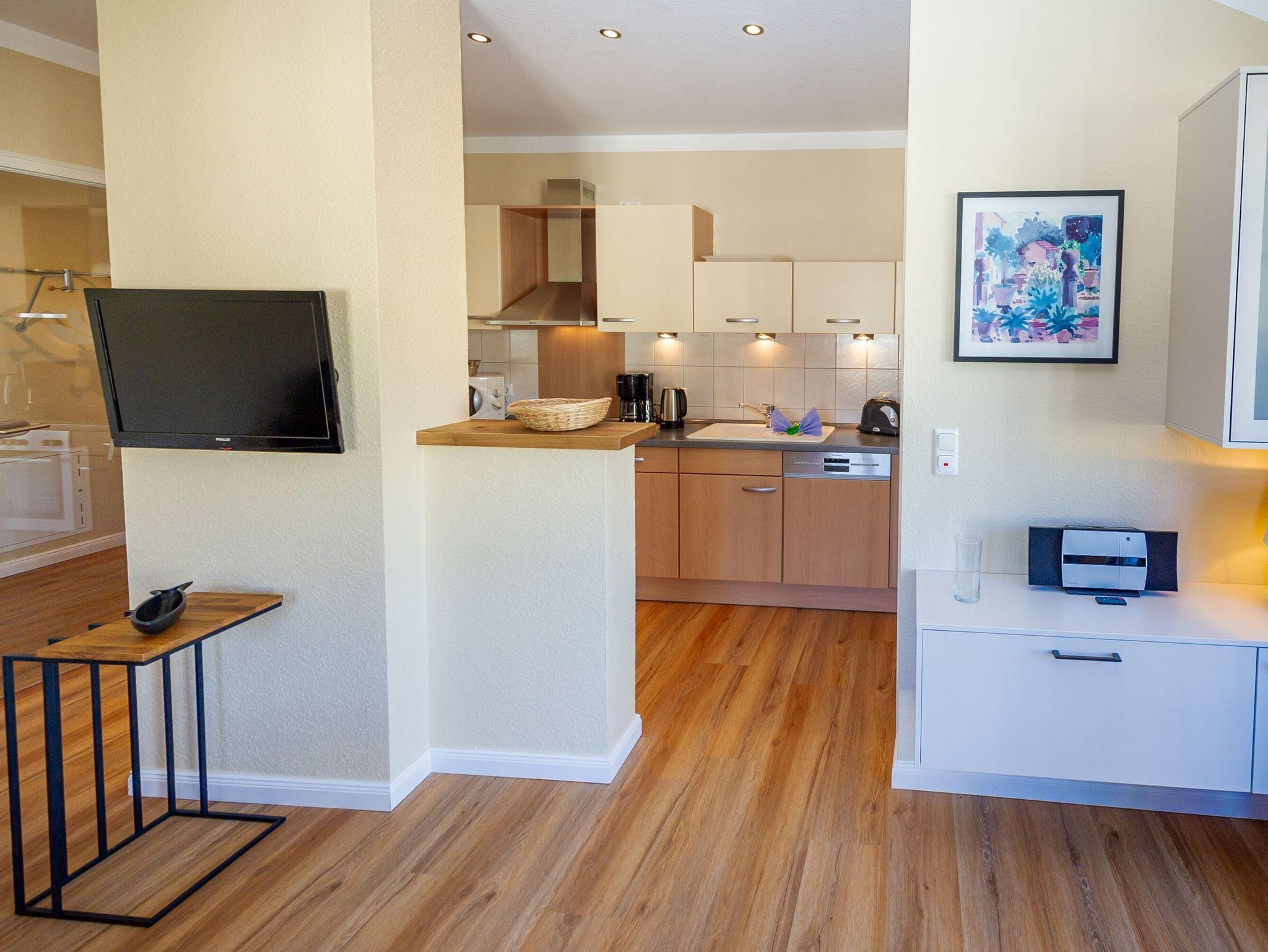 Die harmonisch in den Wohnbereich integrierte Küchenzeile verfügt über einen Kühlschrank mit Gefrierfach, ein 4-Platten-Cerankochfeld, einen Backofen, eine Geschirrspülmaschine, eine Mikrowelle, Wasserkocher, Kaffeemaschine, Toaster und diverses Kleininventar, so dass Sie sich bequem selbst bekochen können.