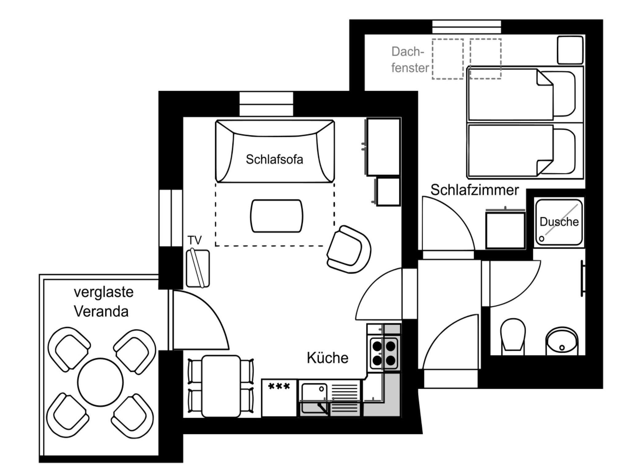 • offene Küche mit E-Herd, Backofen, Kühlschrank, Mikrowelle uvm.